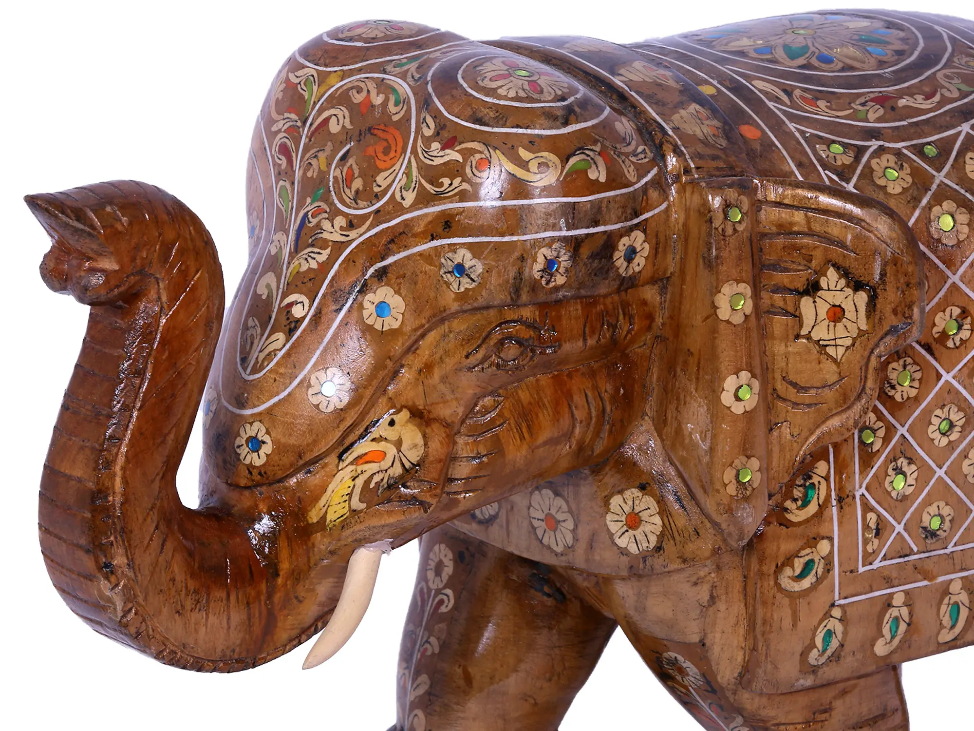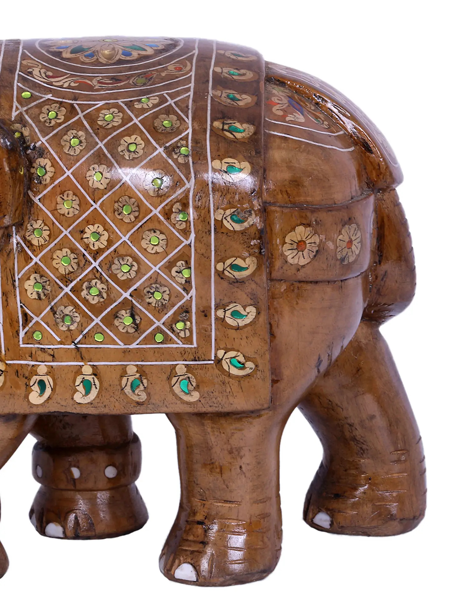 The true magic of this piece lies in its vibrant embellishments. The elephant is adorned with a decorative covering, reminiscent of royal regalia, featuring a captivating mosaic of patterns. Delicate floral motifs, outlined with fine white inlay work, bloom across its form. Scattered throughout these designs are small, polished stones in shades of green and blue, adding a touch of precious color and sparkle. These ornate details are not merely aesthetic; they carry deep cultural significance. In many Eastern traditions, the elephant is associated with Lakshmi, the goddess of wealth and prosperity, and it is believed that an elephant statue with its trunk raised signifies good fortune and abundance entering the home. The careful placement of each gemstone and the meticulous inlay work reflect a dedication to artistry and a belief in the power of auspicious symbols.