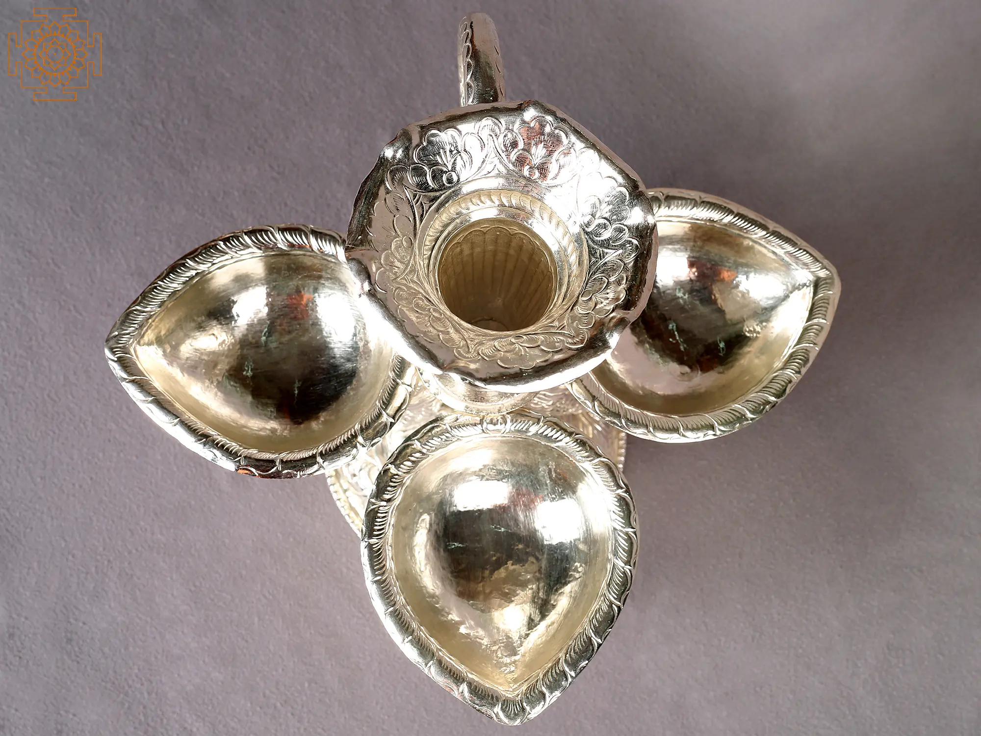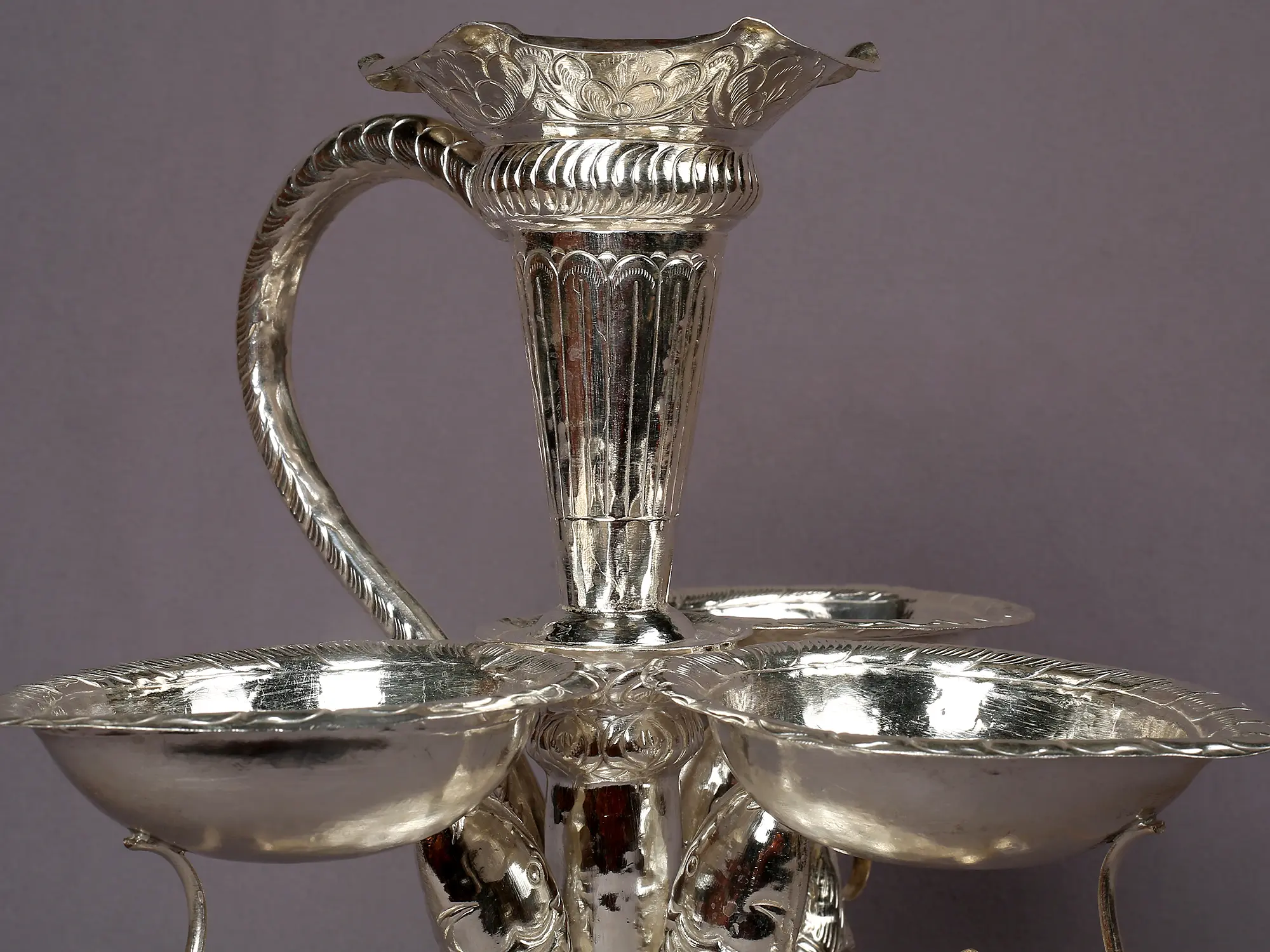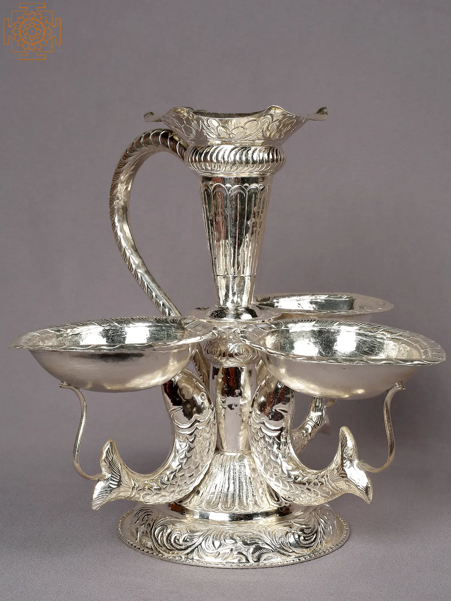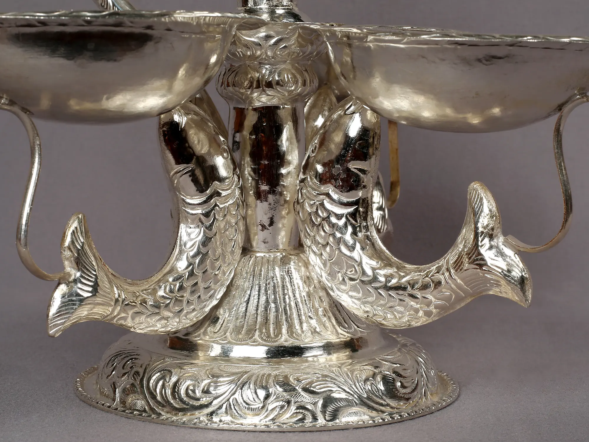 This Macha Silver Tiakdani is an excellent ritual Dani or container for Dashain and Tihar ceremonies. It is composed of silver and has the typical Machha of fish designs at the base, which represents the Tikadani's link with fortune. During auspicious occasions and festivals, Jamari and tika, fruits, and other things are stored individually in the four compartments of the Tikadani in this silver tika Dani. The log vase-like container in the back is designed specifically for the Jamara or Barley sprout, the most vital thing for finishing the Dasain tika. This silver Tikadani is a stunning work of art with superb craftsmanship.