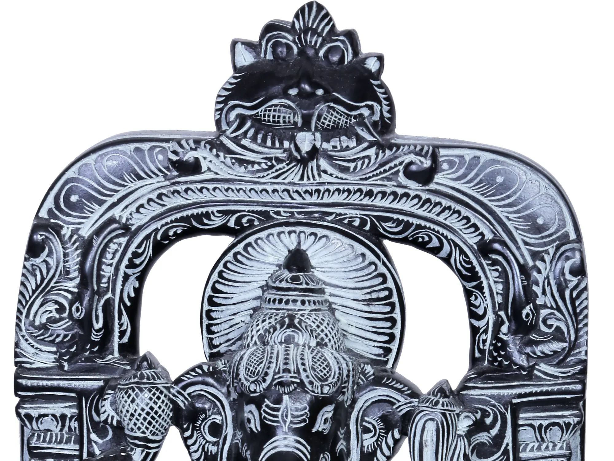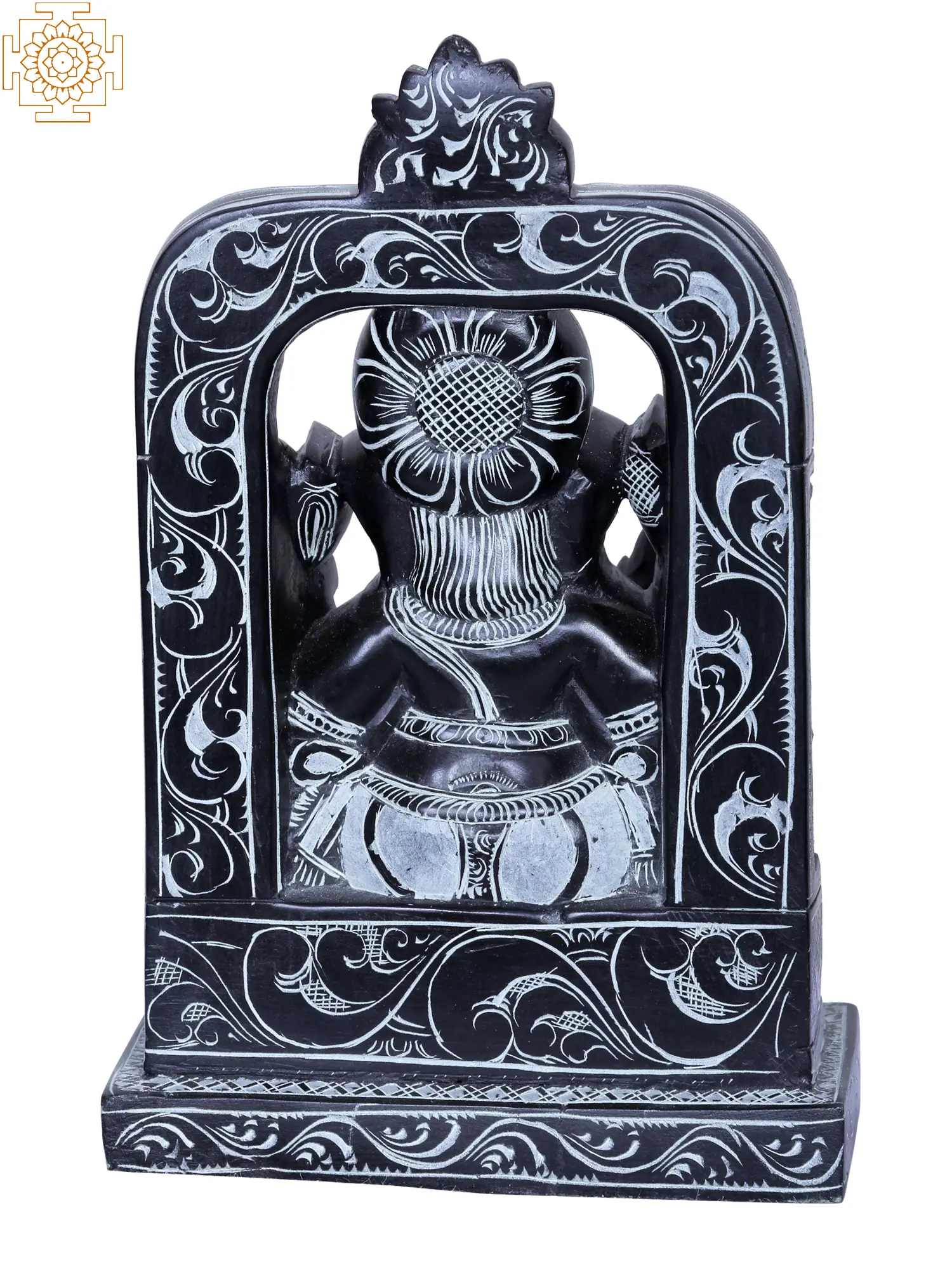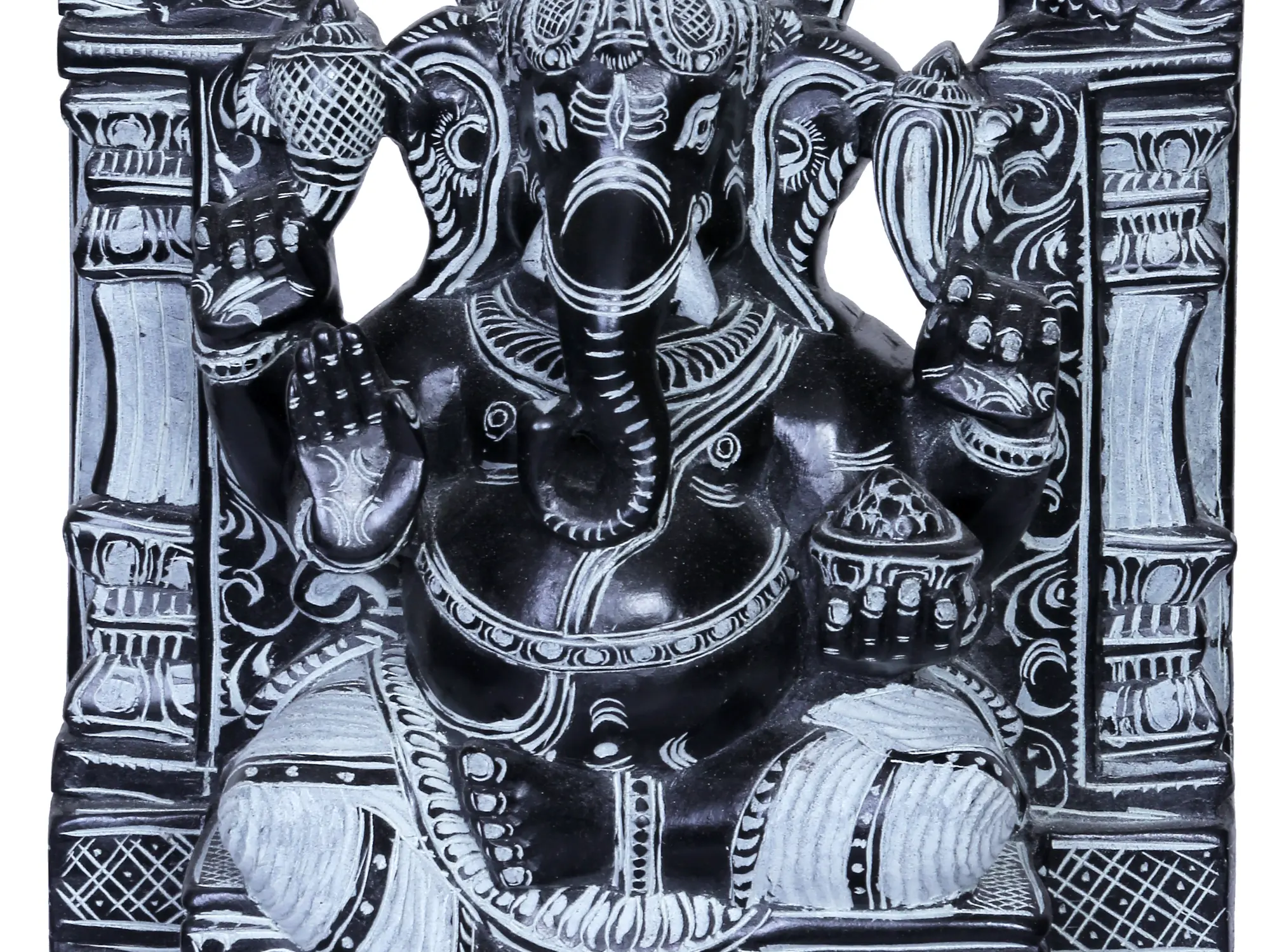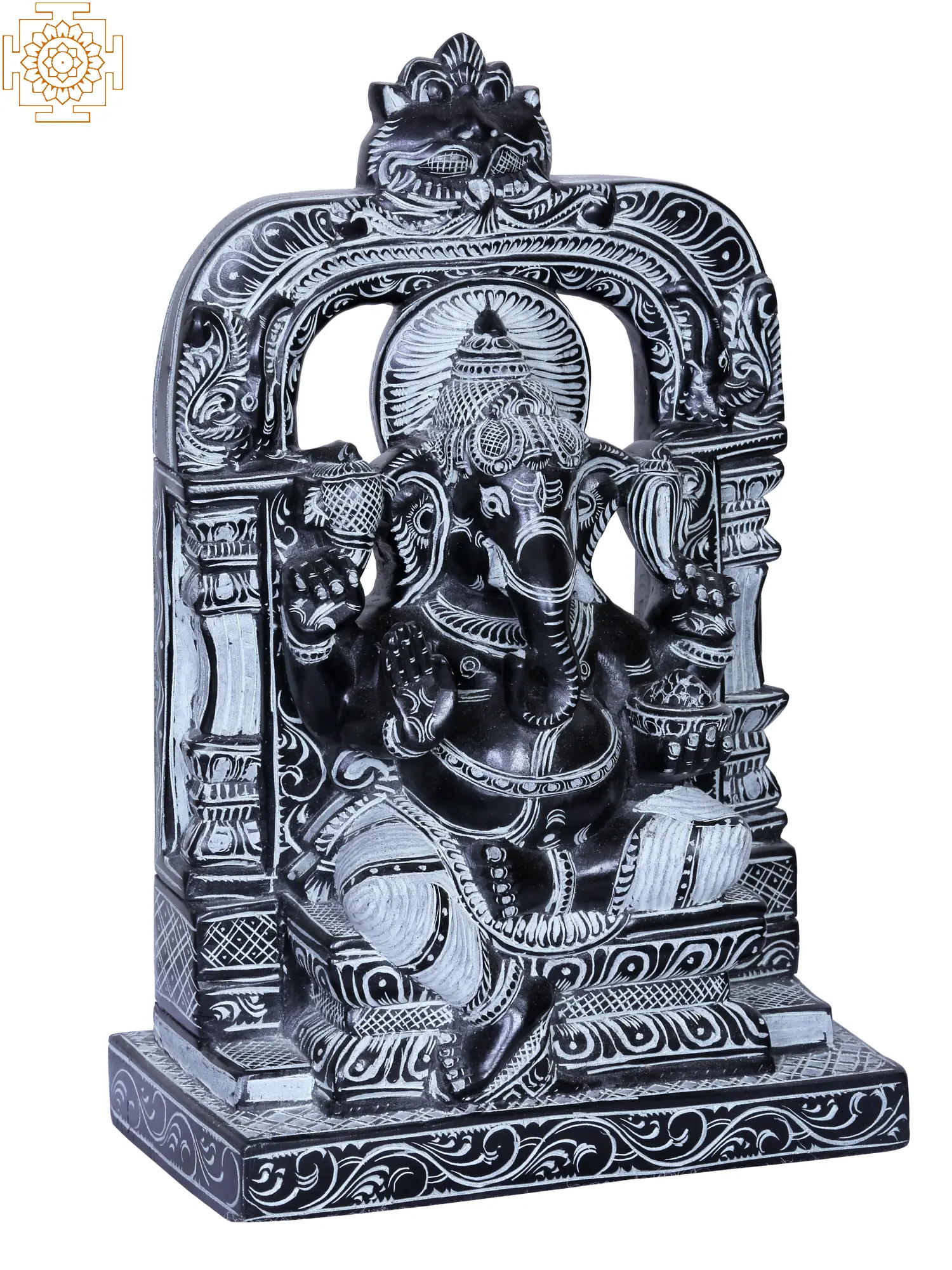 The four arms of Ganesha are symbolic of his dominion over the four aspects of the inner self: mind, intellect, ego, and consciousness. In this depiction, his upper hands often hold the noose and the goad, representing his power to restrain negativity and guide devotees towards righteousness. His lower hands are typically shown in a gesture of blessing (abhaya mudra) and holding his favorite sweet, the modak, signifying the rewards of spiritual attainment. The seated posture indicates his serene and benevolent nature, bestowing peace and stability. The elaborate arch and pillar design behind him further emphasizes his exalted status as the god invoked at the commencement of all ventures, be it a new project, a journey, or a marriage. ––––––––––