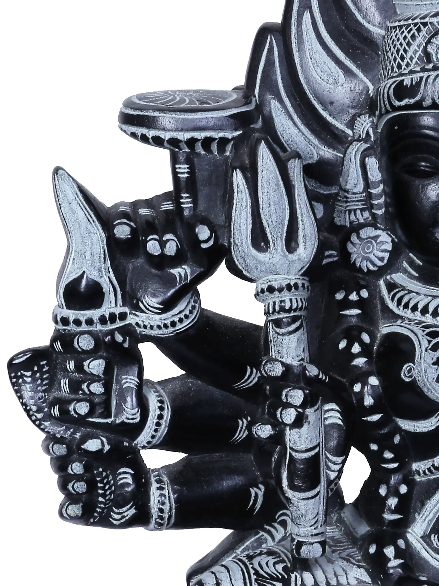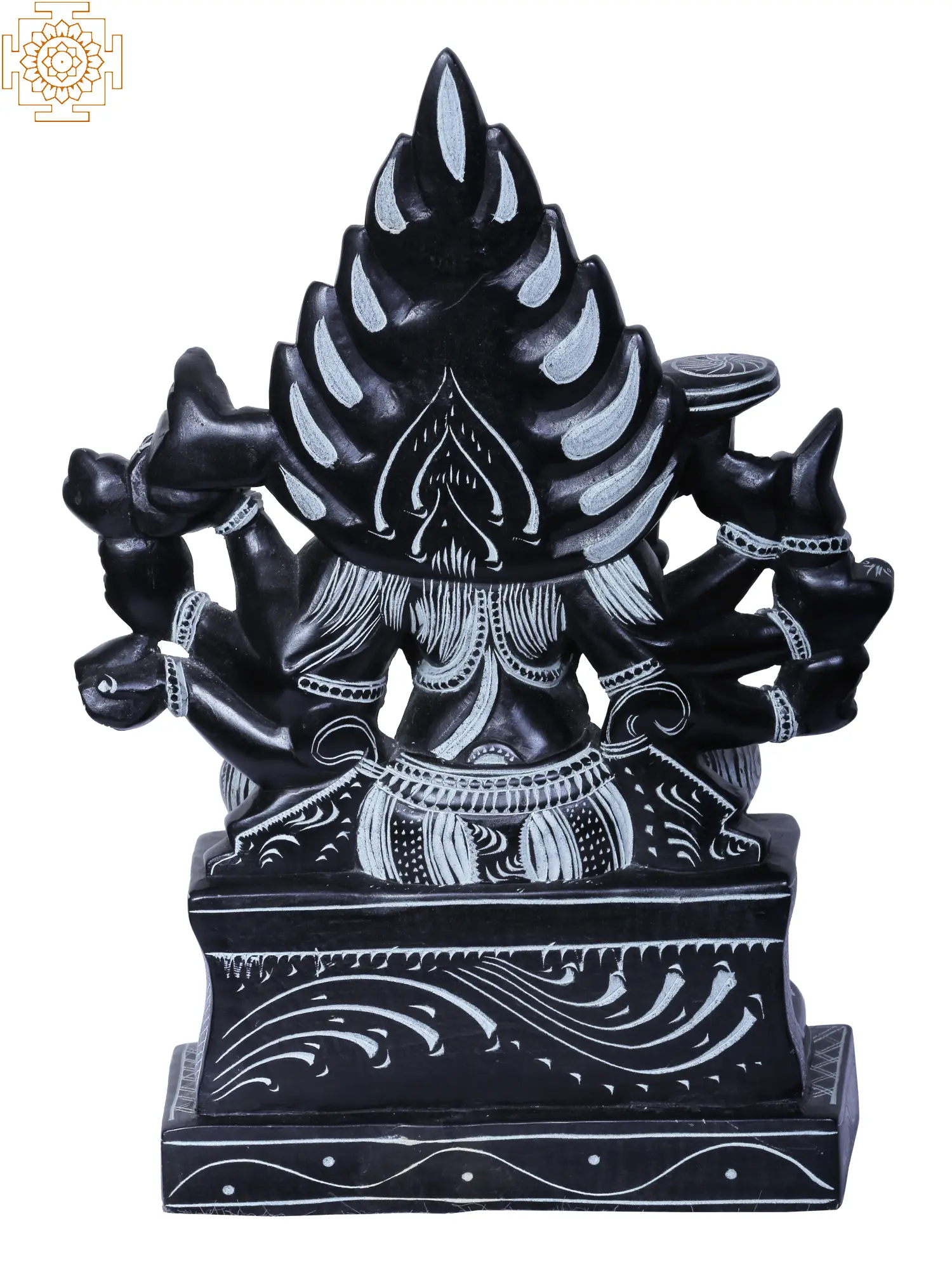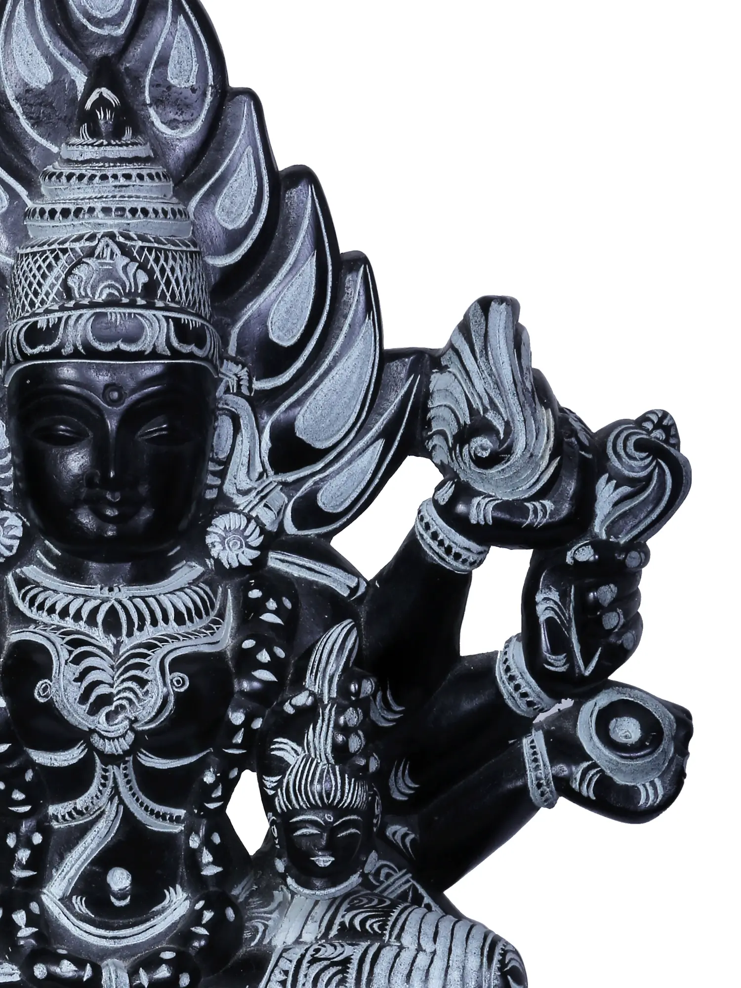 This exquisite stone statue from South India captures the formidable and benevolent presence of Goddess Durga, revered as Devi Mariamman in her regional form. Carved from durable stone, this piece embodies the rich artistic heritage of Mahabalipuram, a UNESCO World Heritage site renowned for its monolithic rock-cut sculptures and temples. The artist has skillfully rendered the goddess with multiple arms, each holding symbolic implements of power and protection. Her serene yet resolute expression speaks volumes of her divine authority and unwavering commitment to safeguarding the cosmos from malevolent forces. The intricate detailing, from the layered crown atop her head to the ornate patterns adorning her garments and the elaborate base, showcases the mastery of traditional South Indian craftsmanship.