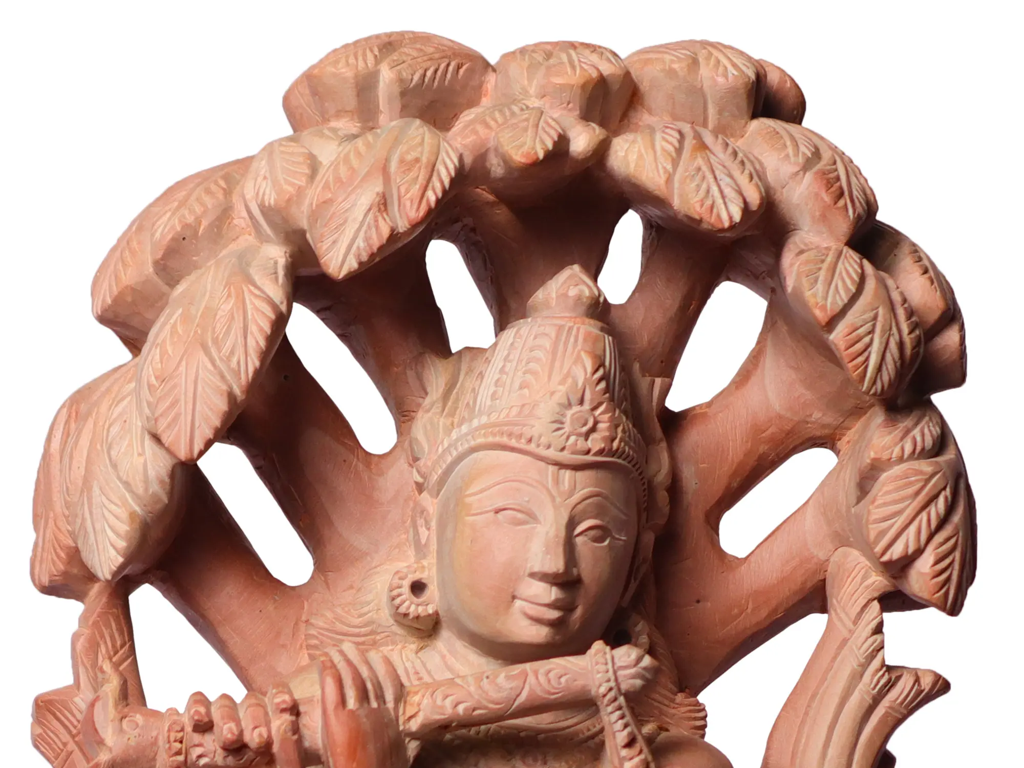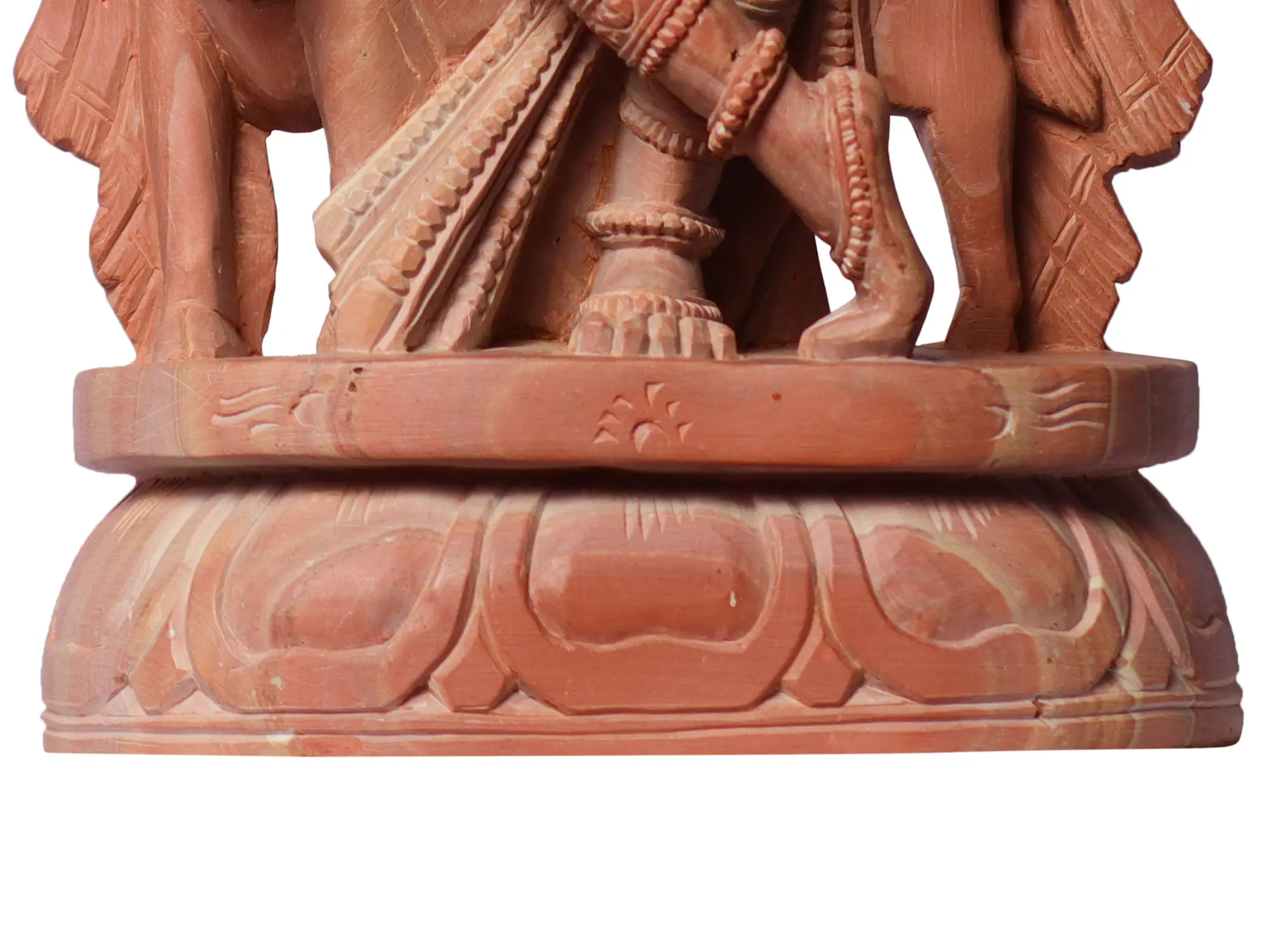 Krishna, who’s the destroyer of all afflictions for his devotees is the noble embodiment of head and heart. Considered to be the Purna Avatar (Complete\Perfect incarnation) of Lord Vishnu, he’s the source of all the elixir and infinite knowledge. In this pink stone idol, Krishna who is Vanamali is presented standing in a Tribhnaga under a tree among the forests of Vrindavana as he plays his divine flute which symbolizes Pranava. Crossing his lotus feet gracefully - they draw the devotees to bow in his reverence while his dear ‘Gau - cow’ peaks amusingly from the back.
