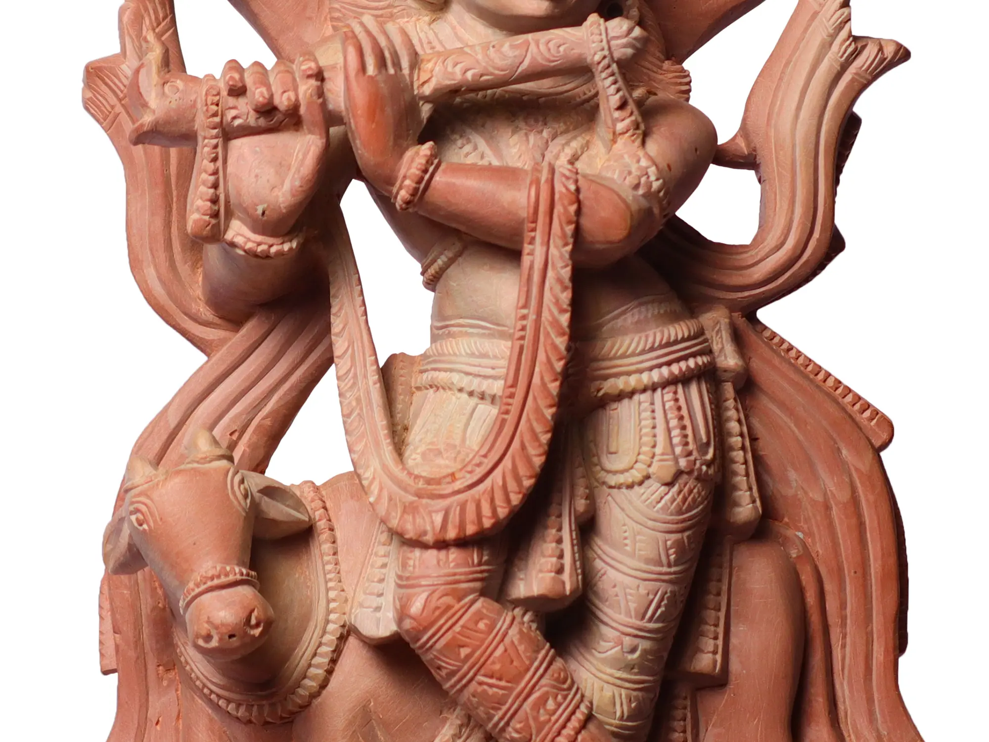 Immerse your sacred space in the divine presence of Lord Krishna, the beloved deity of love, compassion, and joy. This exquisite statue captures the essence of Krishna in his most celebrated persona as the divine flutist, standing beneath the shelter of a grand tree, with a gentle cow by his side. The warm, inviting hue of the pink stone evokes the earthy, natural beauty of the divine forests of Vrindavan, where Krishna spent his enchanting childhood. Crafted with meticulous detail and devotion, this artwork is more than just a decorative piece; it is a conduit to spiritual serenity. The delicate rendering of Krishna's serene countenance, the graceful posture as he brings his flute to his lips, and the intricate patterns adorning his attire speak of the unparalleled artistry and reverence with which it was created. The surrounding tree branches, rendered with lifelike texture and form, create a naturalistic backdrop, reminiscent of the lush groves where Krishna’s melodies captivated the hearts of the Gopis and the very creatures of the forest. The presence of the cow, a symbol of nurturing and abundance, further enhances the aura of peace and prosperity this idol embodies.