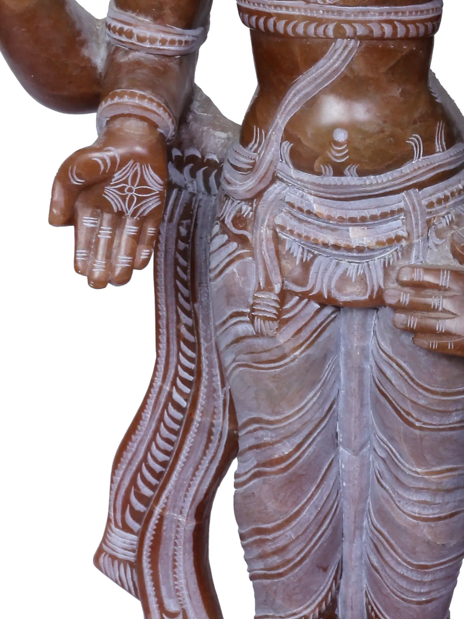 This exquisite stone sculpture captures the essence of Lord Vishnu, the preserver and protector of the universe in Hindu tradition. Crafted from a beautiful red stone, this statue emanates a sense of timeless grace and divine power. Lord Vishnu is revered as the supreme being, the force that upholds the cosmos and restores balance when it is disrupted. His presence is associated with peace, prosperity, and the assurance of righteousness. The meticulous craftsmanship evident in this piece reflects the deep spiritual significance attached to the deity.