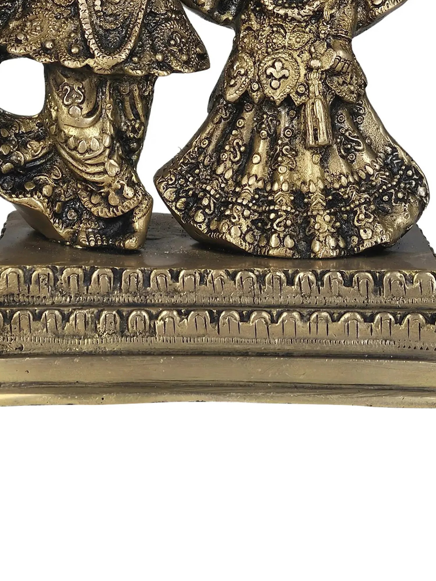 A standing Radha Krishna brass statue is a revered representation of the divine love between Lord Krishna and his beloved consort Radha in Hindu mythology. Crafted with meticulous detail, the sculpture portrays Radha and Krishna in an intimate embrace, standing together in a loving pose. Radha, often depicted with her distinctive attire and adornments, embodies the epitome of devotion and divine love. Lord Krishna, with his characteristic flute and divine crown, exudes a sense of divine grace and charm. The use of brass as the medium for this sculpture allows for intricate detailing, capturing the essence of their eternal bond. This statue serves as a powerful symbol of love, devotion, and the union of the individual soul with the divine, making it a cherished representation in Hindu worship and spiritual devotion.