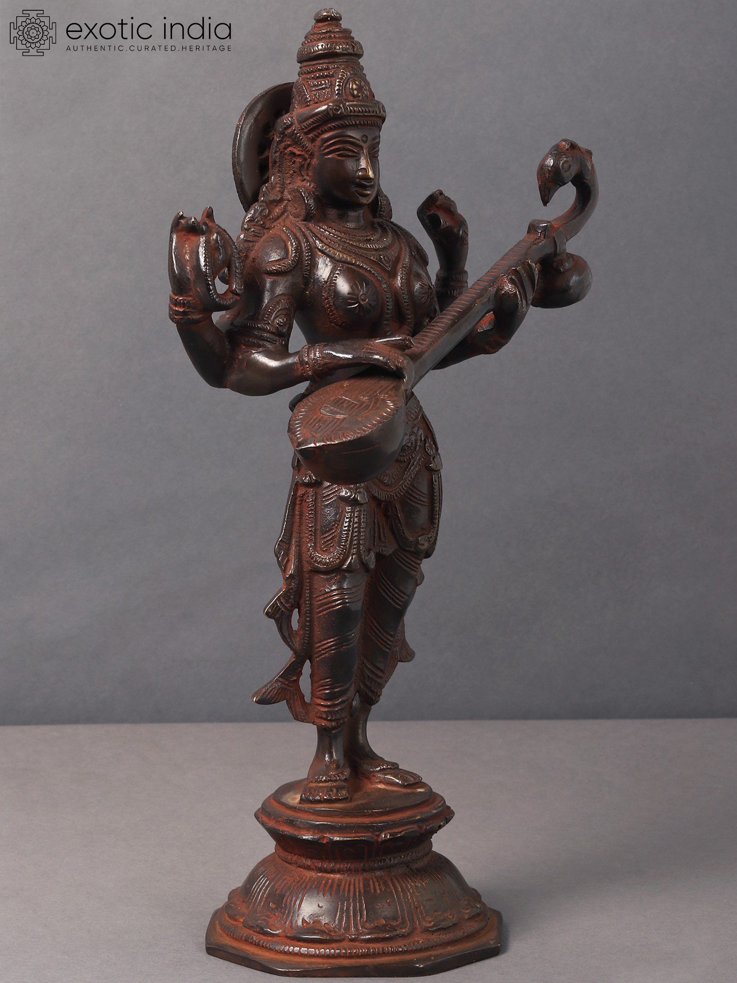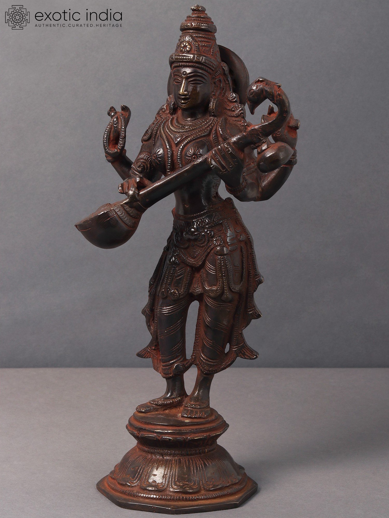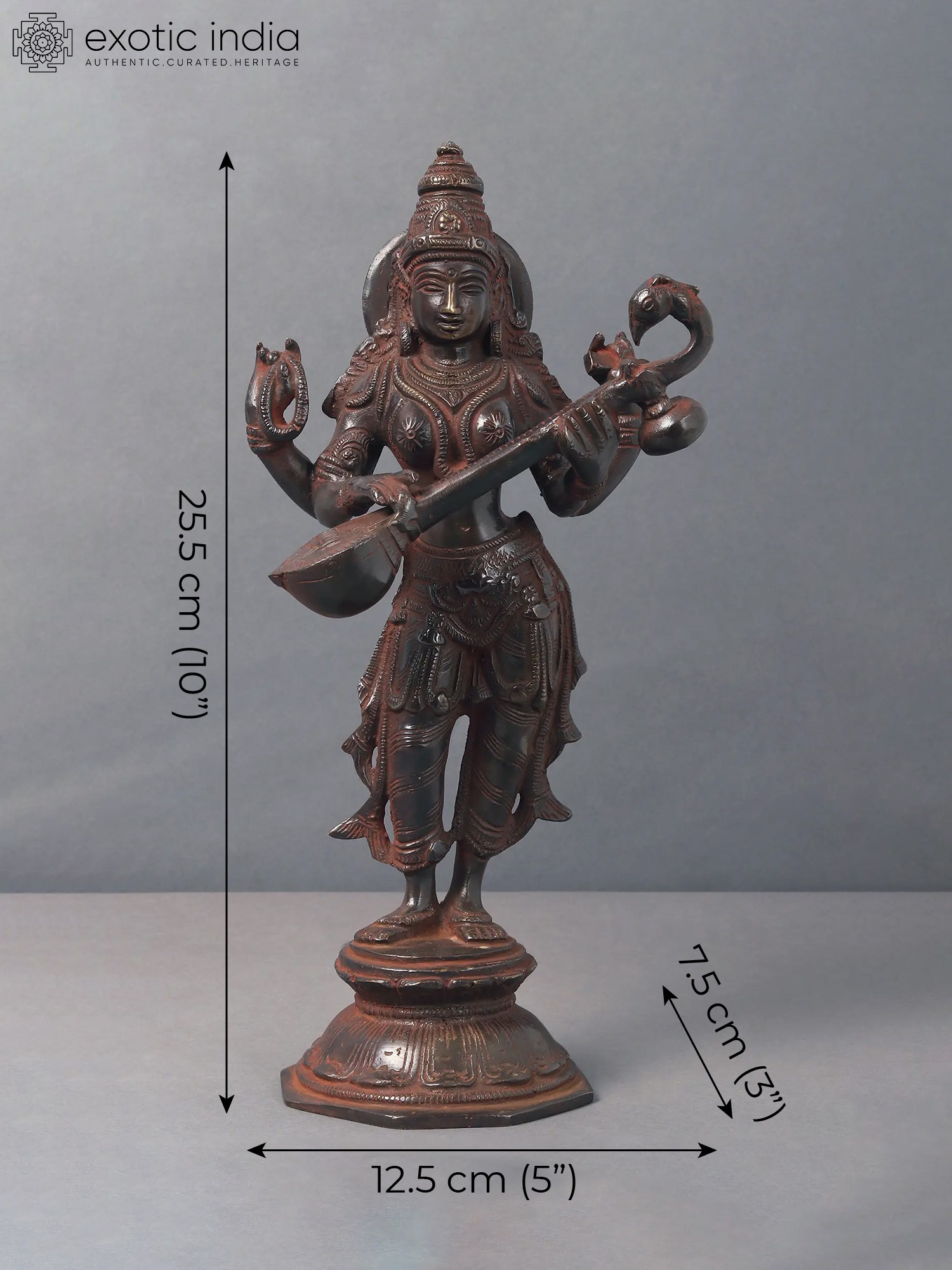 Embrace the goddess of knowledge and art with this Brass Standing Saraswati idol. Crafted in India, this sculpture embodies the essence of wisdom, creativity, and the interconnectedness of learning and artistry. Saraswati is revered as the patron of knowledge, arts, and music. Her standing form signifies the constant flow of wisdom and creativity. The intricately crafted brass statue serves as a visual reminder of the interconnectedness of learning and artistic expression, echoing the core concept of "Vidya-Dana" - the gift of knowledge. Having Saraswati in your space not only adds a touch of intellectual depth but also invites the energy of creativity and learning. It serves as a profound reminder of the interconnectedness of knowledge and the blossoming of artistic expression.