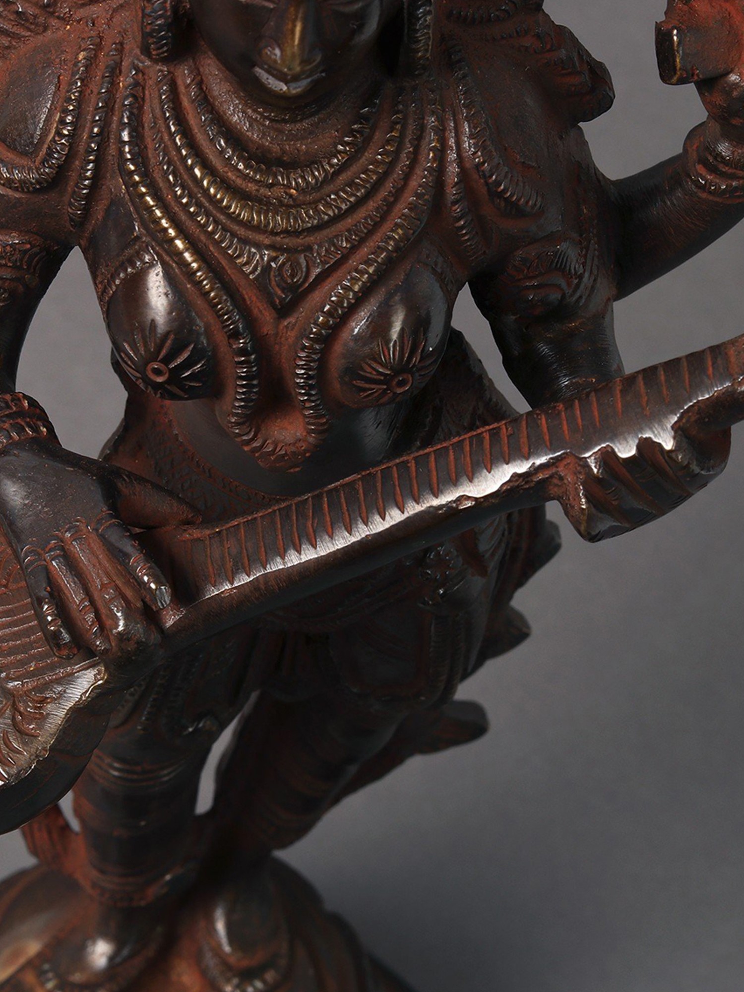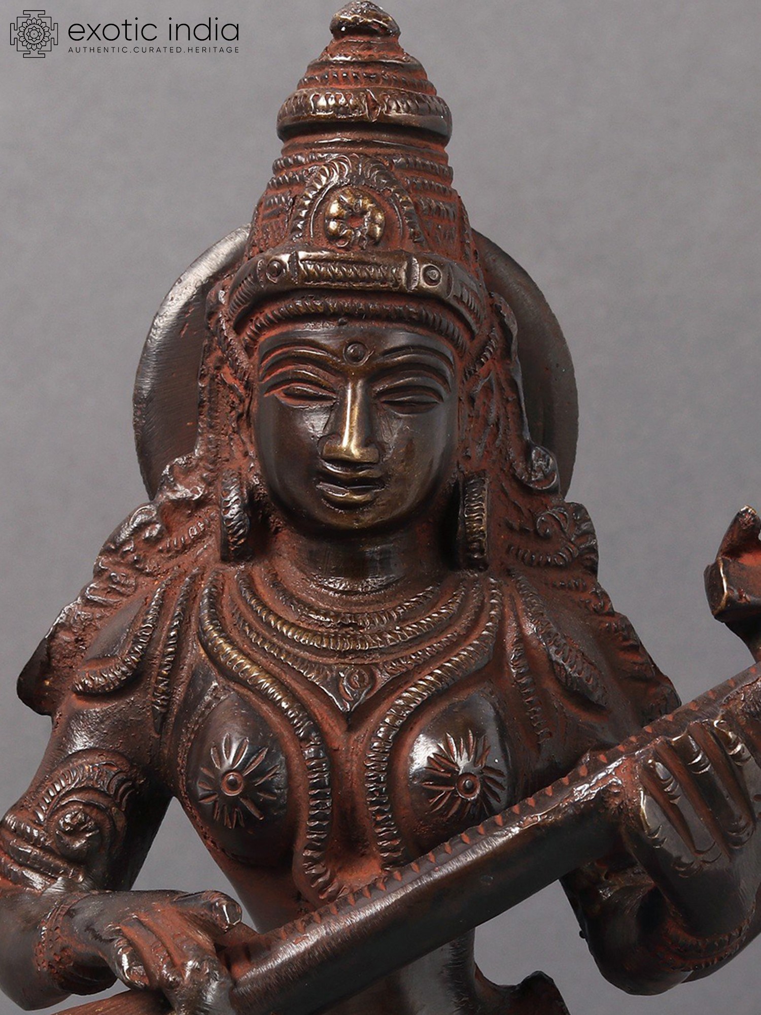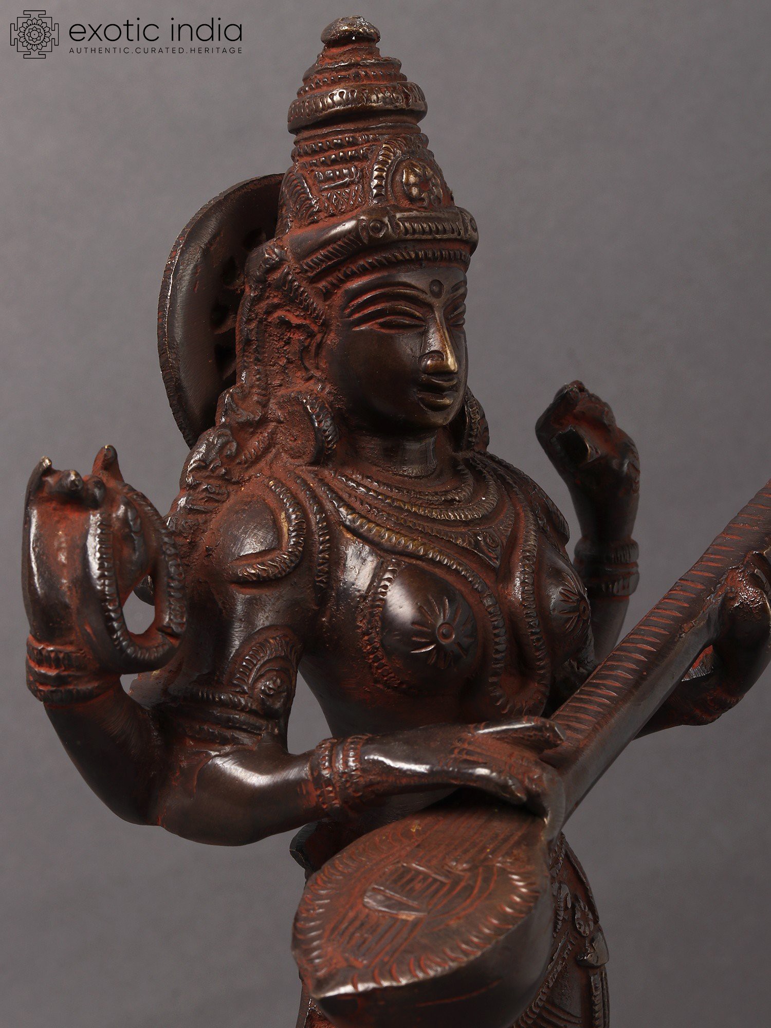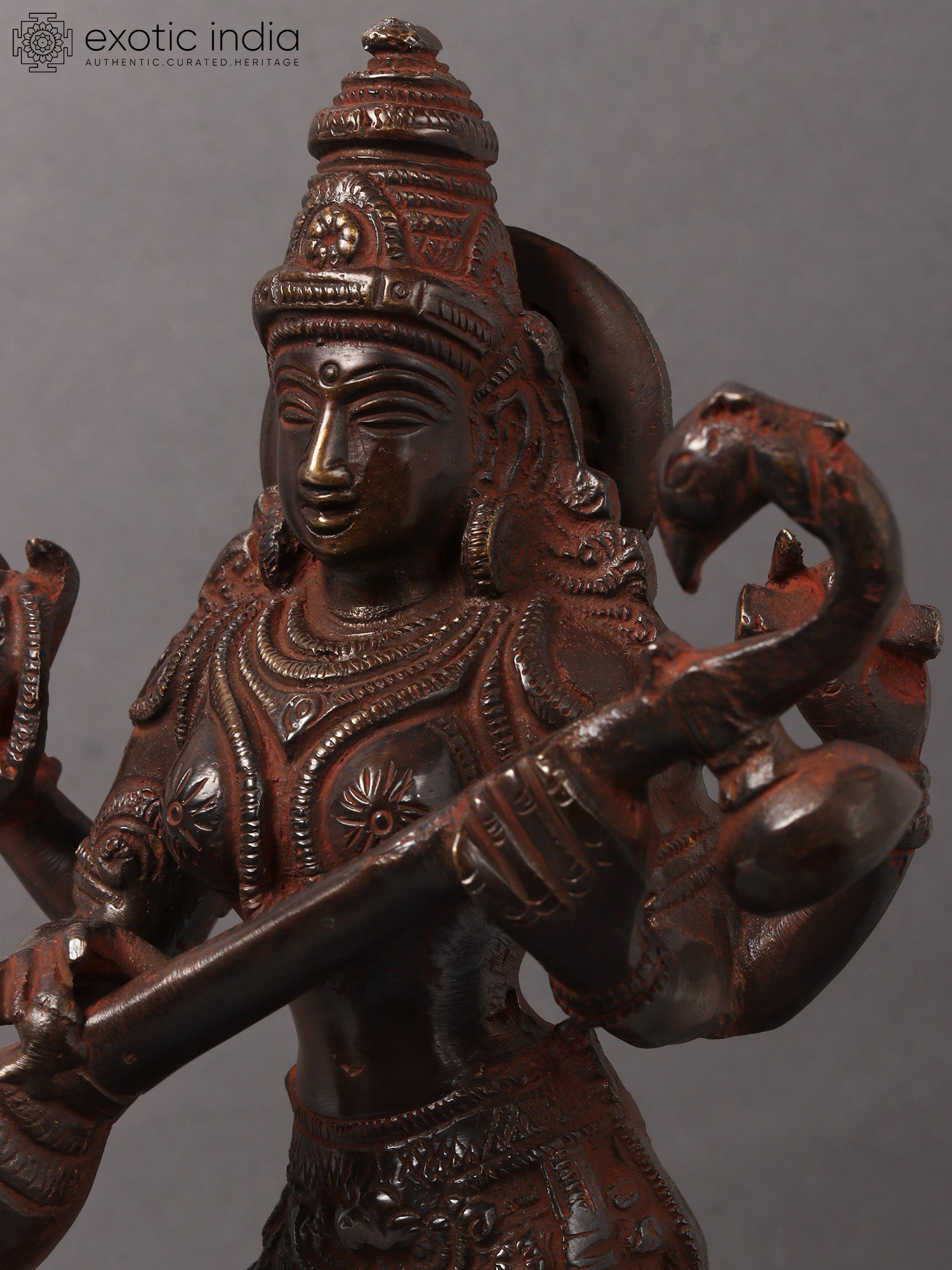 Embrace the goddess of knowledge and art with this Brass Standing Saraswati idol. Crafted in India, this sculpture embodies the essence of wisdom, creativity, and the interconnectedness of learning and artistry. Saraswati is revered as the patron of knowledge, arts, and music. Her standing form signifies the constant flow of wisdom and creativity. The intricately crafted brass statue serves as a visual reminder of the interconnectedness of learning and artistic expression, echoing the core concept of "Vidya-Dana" - the gift of knowledge. Having Saraswati in your space not only adds a touch of intellectual depth but also invites the energy of creativity and learning. It serves as a profound reminder of the interconnectedness of knowledge and the blossoming of artistic expression.