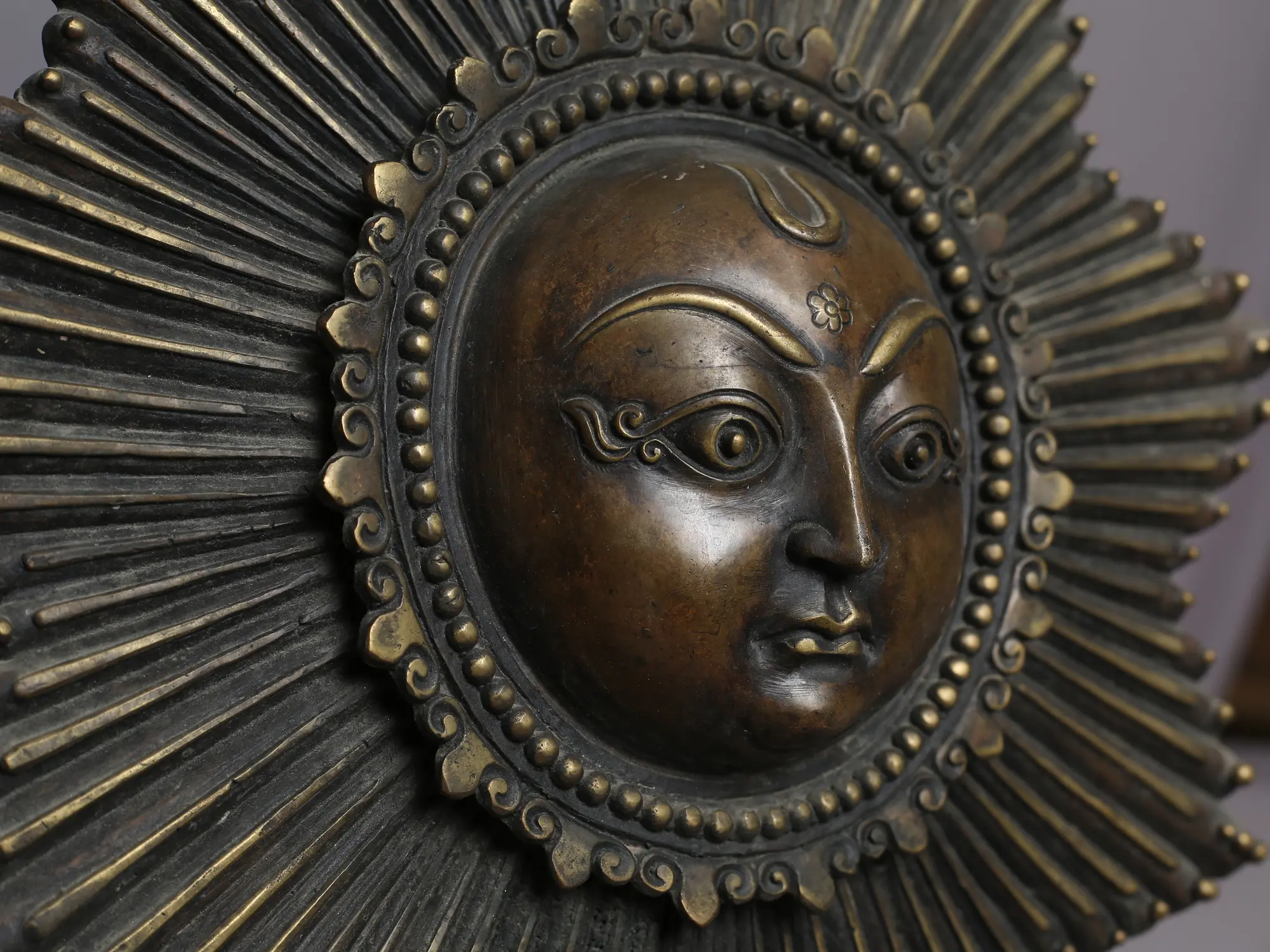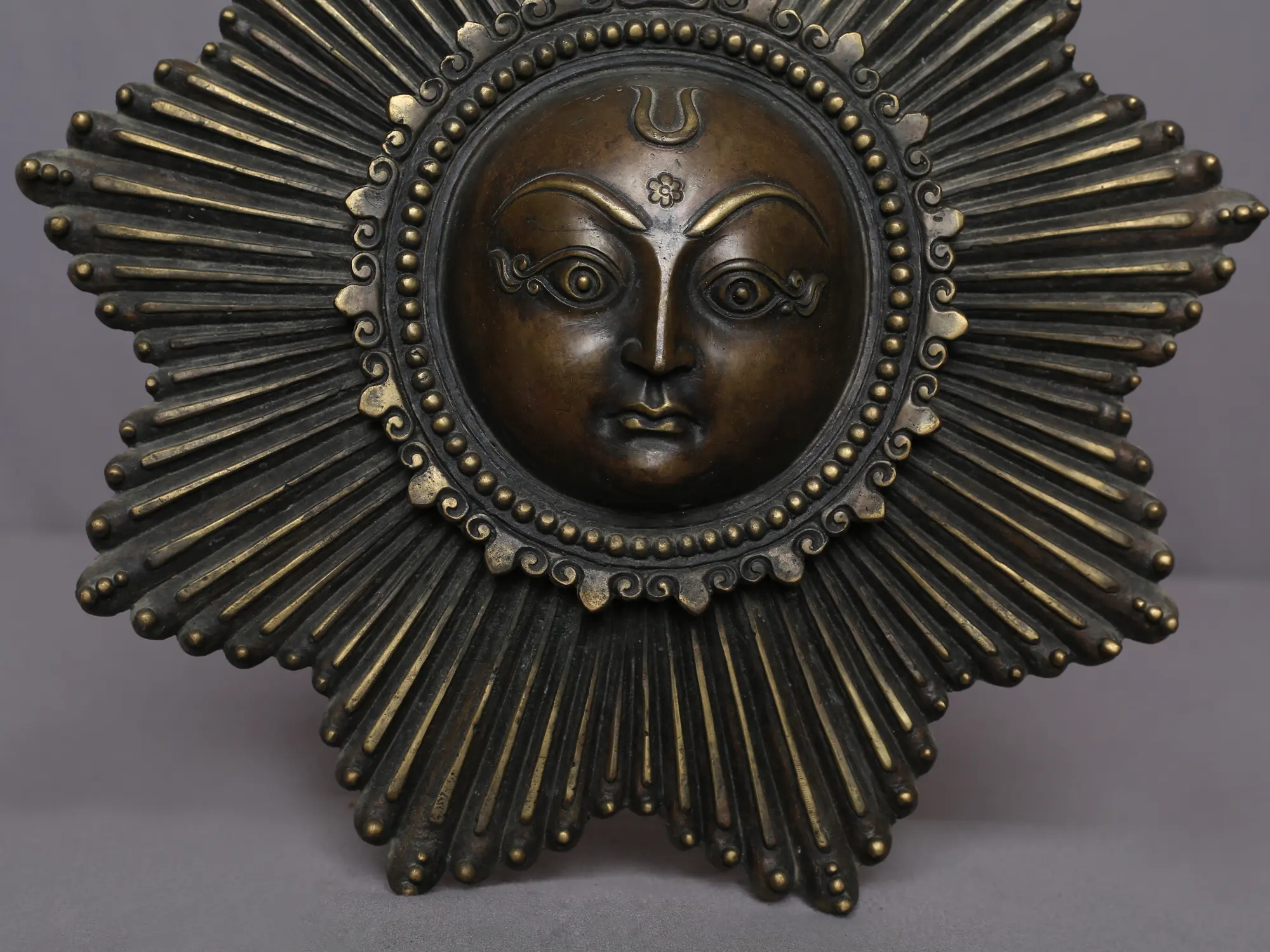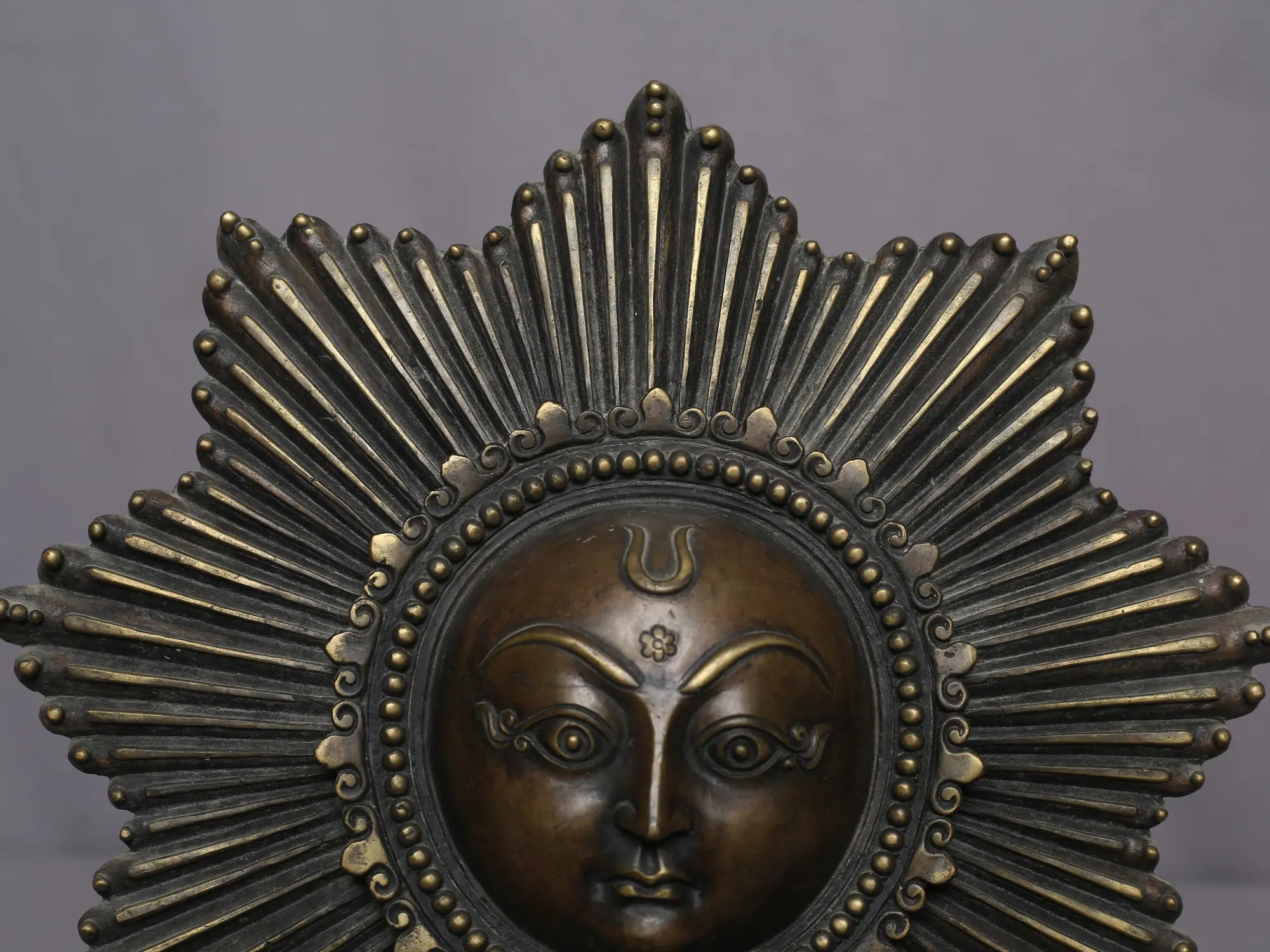 It is a solar-faced wall-hanging sculpture. To the devout Hindu, it is the facial divinity of Lord Soorya. Comprises a perfectly round, remarkably expressive face in the centre; surrounded by rays, the tips of which vary in length to form some kind of kaleidoscopic symmetry.