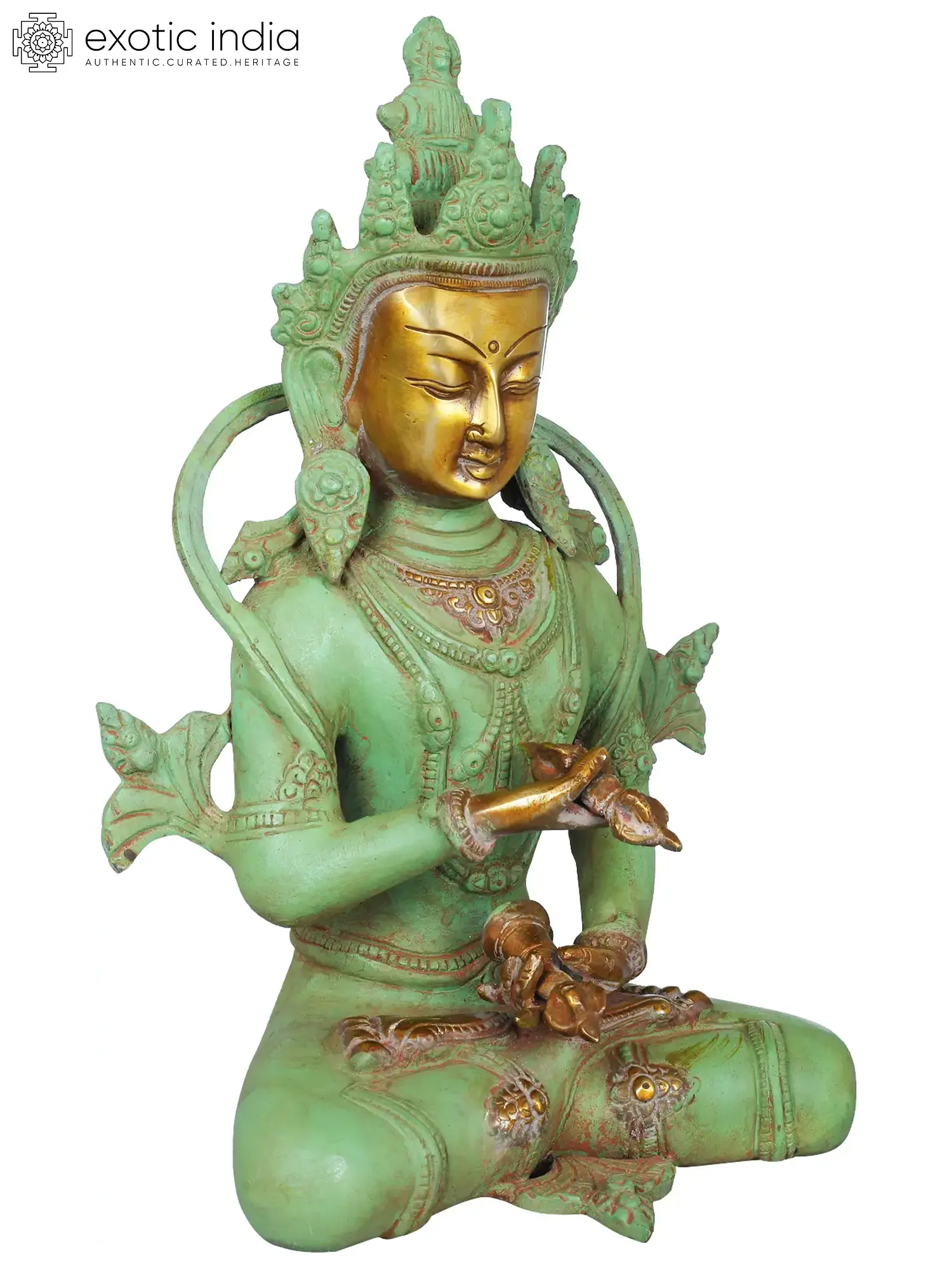 The iconography of Vajrasattva is rich with symbolic meaning. He is often depicted holding a vajra in his right hand, representing wisdom and the indestructible nature of enlightenment, and a bell (ghanta) in his left, symbolizing emptiness and the understanding of the interconnectedness of all phenomena. This particular rendition masterfully captures the essence of this divine being, with delicate craftsmanship evident in every detail. The serene expression on his face invites contemplation and peace, while the posture conveys a sense of profound stability and grace. The vibrant verdigris patina, achieved through traditional methods, adds a sense of age and spiritual depth, hinting at centuries of devotion and reverence.