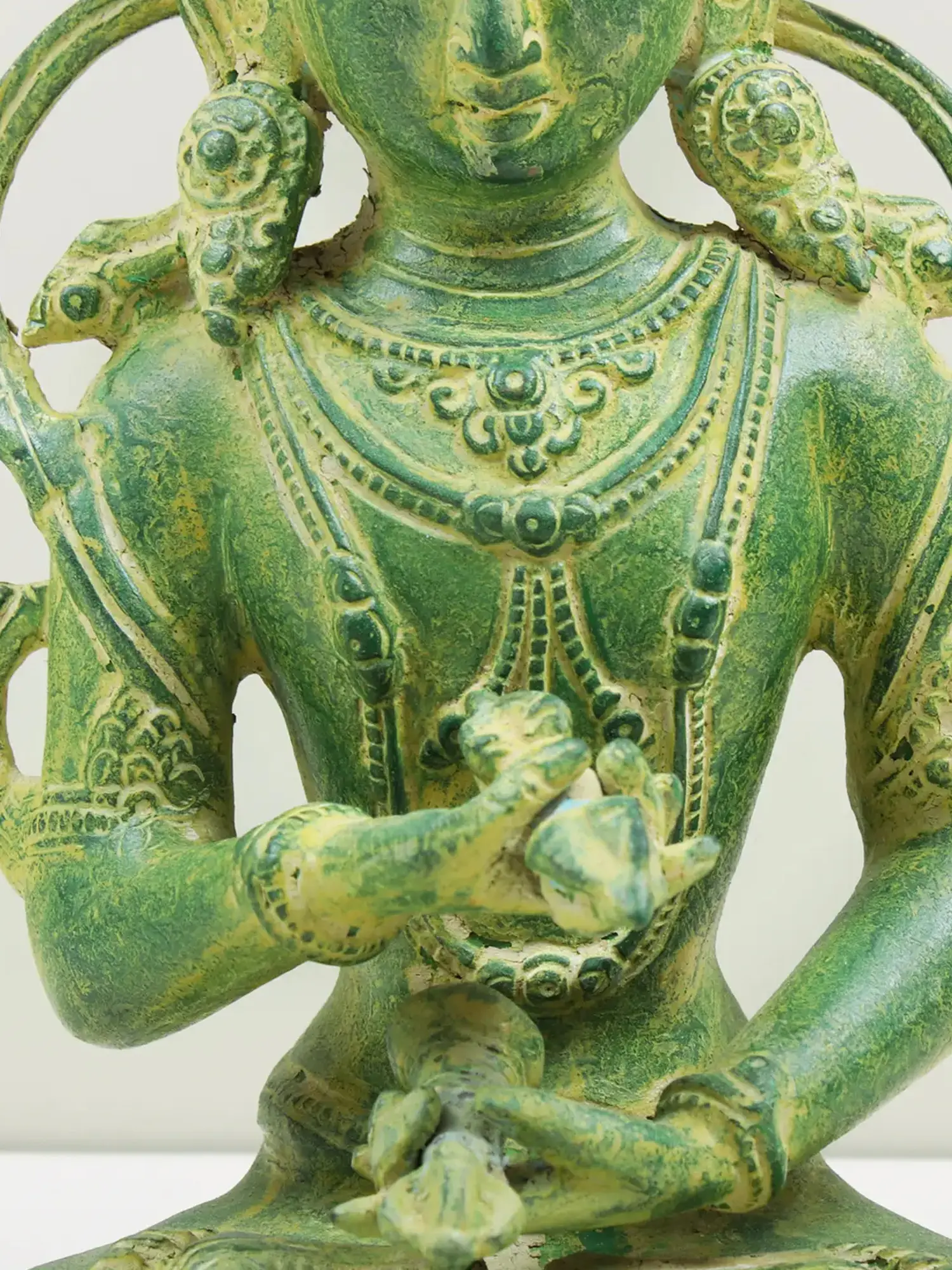 The iconography of Vajrasattva is rich with symbolic meaning. He is often depicted holding a vajra in his right hand, representing wisdom and the indestructible nature of enlightenment, and a bell (ghanta) in his left, symbolizing emptiness and the understanding of the interconnectedness of all phenomena. This particular rendition masterfully captures the essence of this divine being, with delicate craftsmanship evident in every detail. The serene expression on his face invites contemplation and peace, while the posture conveys a sense of profound stability and grace. The vibrant verdigris patina, achieved through traditional methods, adds a sense of age and spiritual depth, hinting at centuries of devotion and reverence.