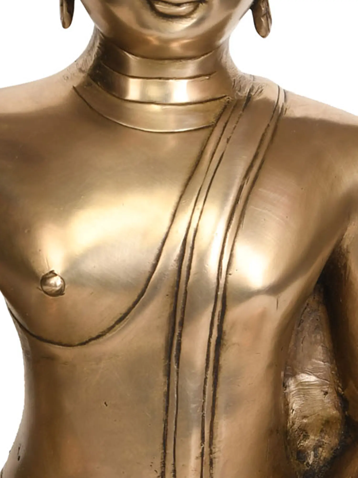 The posture of the Medicine Buddha in this sculpture is deeply significant. Seated in the lotus position, the embodiment of perfect stability and mindfulness, he exudes an unparalleled sense of peace. His right hand, resting on his knee, is held in the *varada mudra* (the gesture of giving and charity), palm facing outwards, signifying his boundless generosity and willingness to grant blessings and healing. In his left hand, cradled in his lap, he holds a medicinal bowl, representing the nectar of healing. A single sprig of the *Artemisia* plant, a herb known for its medicinal properties, emerges from behind his left arm, further emphasizing his role as the Lord of Medicine. This statue is not merely an object of devotion but a testament to the skill of Indian artisans. Each curve of the body, the serene expression on the face, and the intricate rendering of the monastic robe are meticulously sculpted by hand. The smooth, polished surface of the brass catches the light, highlighting the divine form and imbuing it with a warm, inviting radiance. The topknot, a symbol of his enlightened wisdom, is adorned with a crown of small, raised dots, a common iconographic detail. ––––––––––––––––––