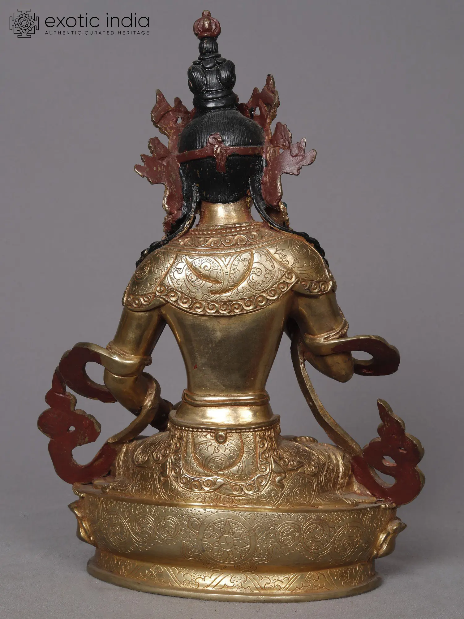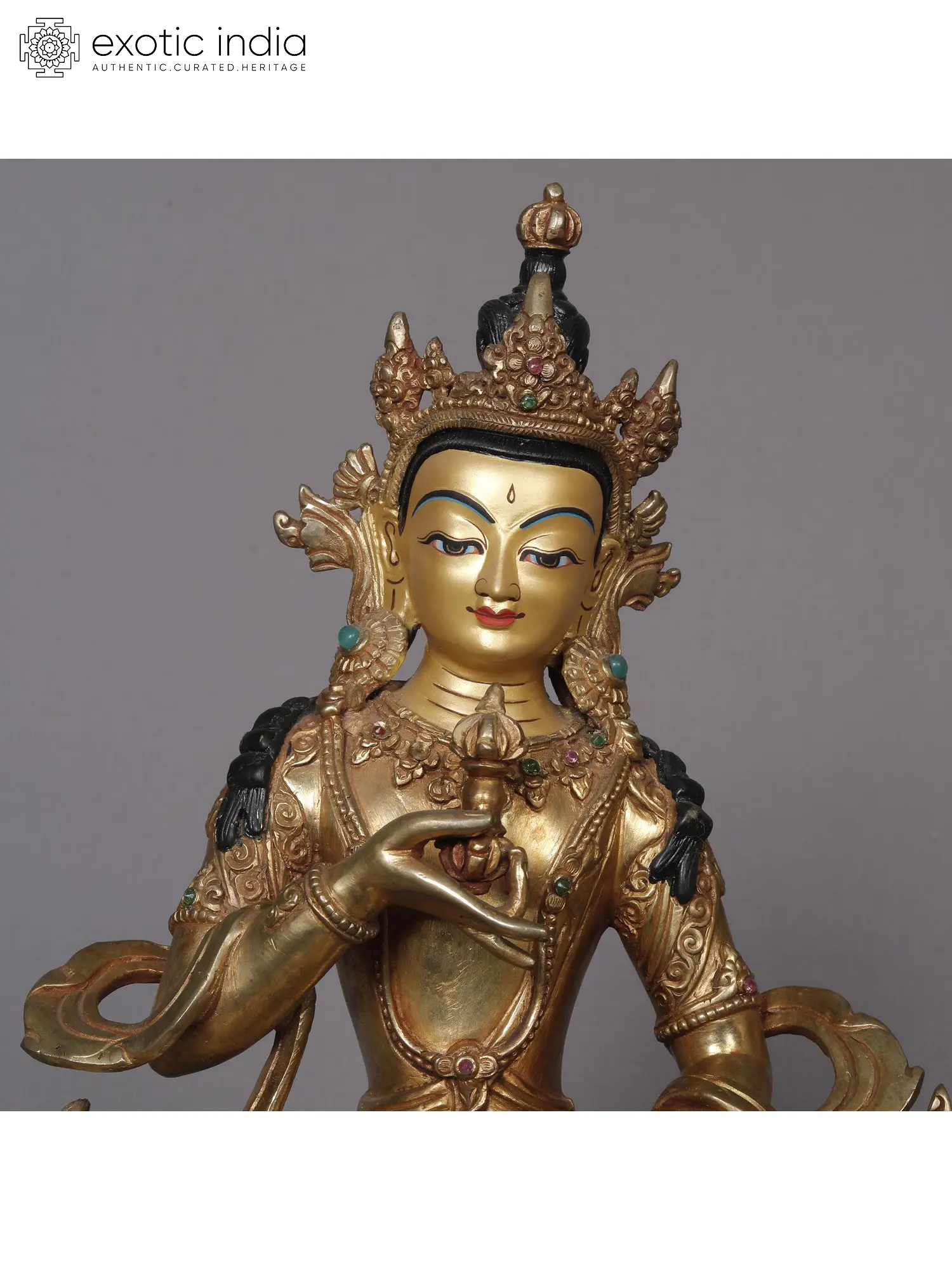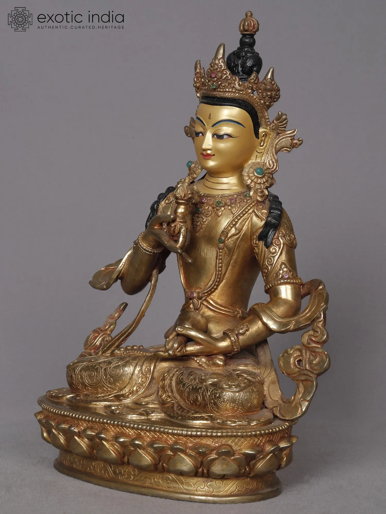 A majorly revered deity in traditions of Mahayana and Vajrayana Buddhism - this is a gold-plated copper statue of Vajrasattva. Seated in a padmasana, his soles face the sky in his positioning on the Padma. The energy of this form of bodhisattva has been a crucial part of Tantric and Yogic initiations in Tibetan Buddhism historically and contemporarily. With his face reading heightened enrichments - he holds a Dril-bu (bell) and Dorje (specter) in each of his hands.