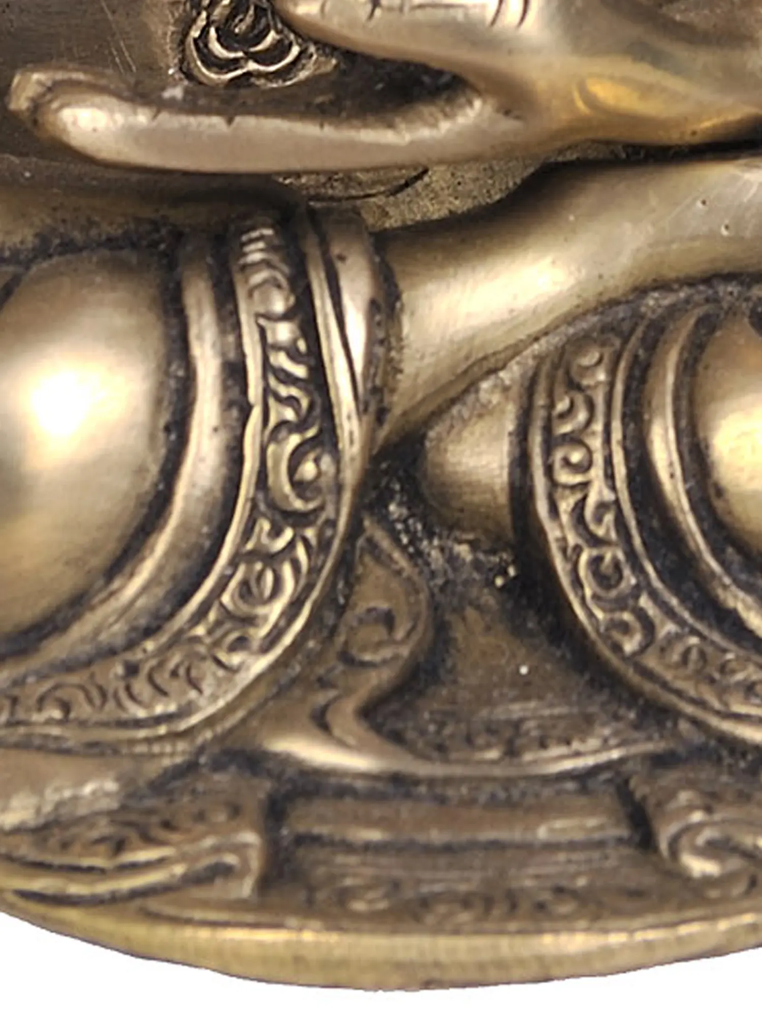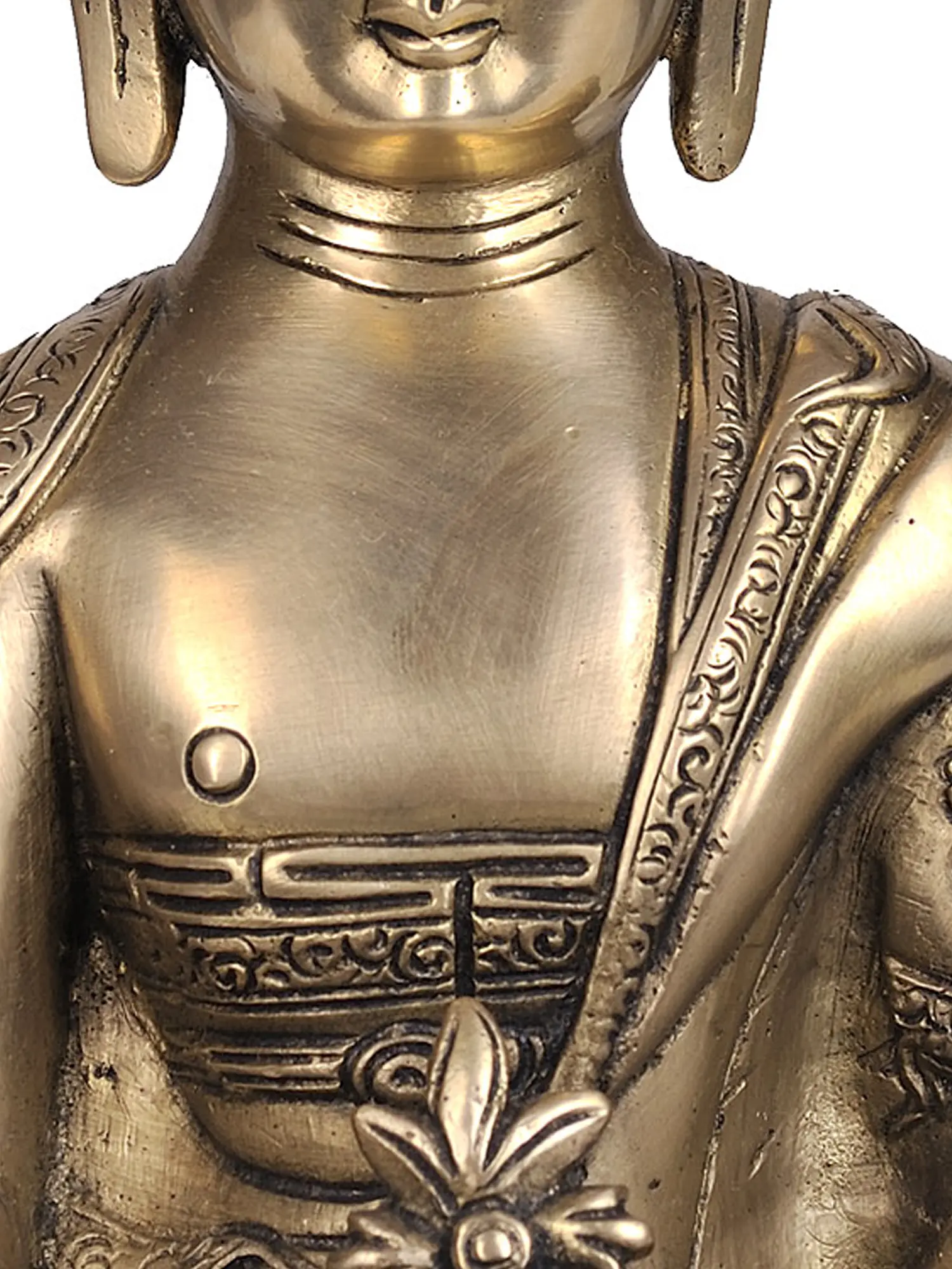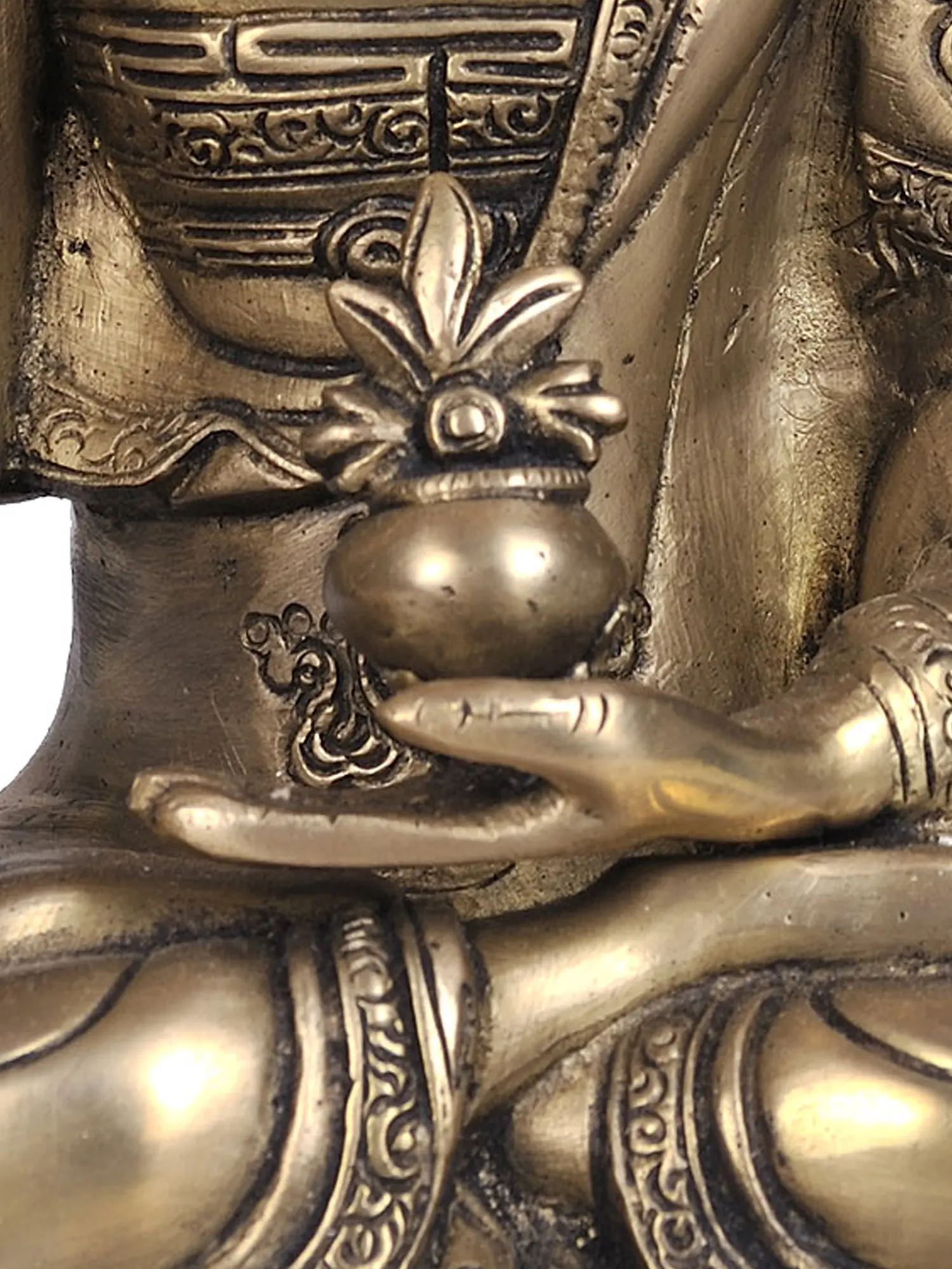 Seated in the Padmasana or the lotus posture, the medicine Buddha, also known as Bhaisajyaguru, is seen here holding medicinal herbs in what appears to be a mortar. There is another myrobilan twig that appears from the side of his lap. The robe of Buddha is sanctified with Ashtamangala symbols. The sculpture has been made out of high-quality brass and is a symbol of care, compassion, and healing. The composure shown on the face of the medicine Buddha exudes peace and positivity.