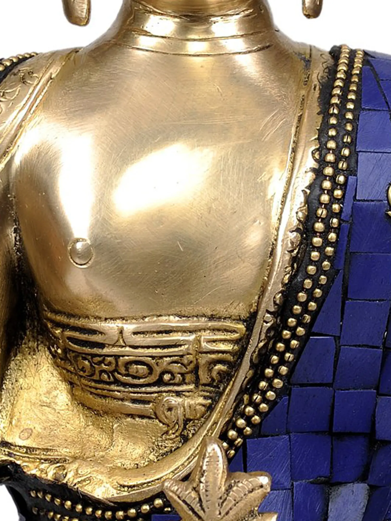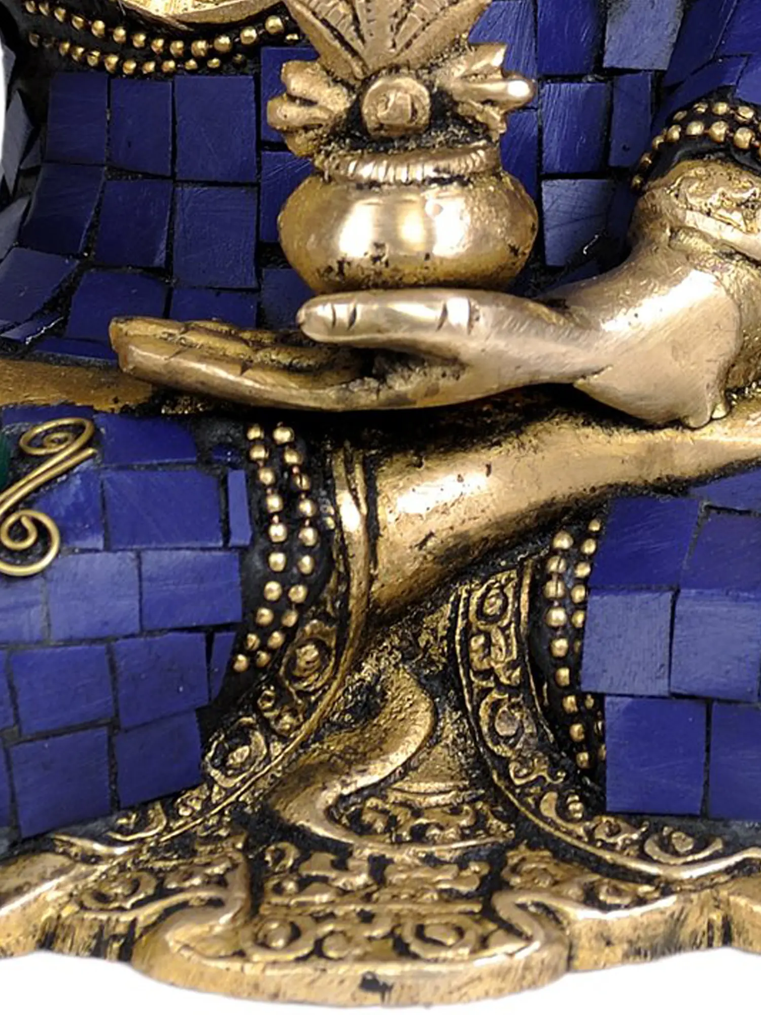 Crafted in India, this statue showcases exceptional artistry and meticulous attention to detail. The figure is rendered in warm brass, symbolizing purity and spiritual illumination. The intricate inlay work, featuring vibrant blue tiles and accents of red and green stones, enhances the statue's visual appeal and carries symbolic meaning. Blue, often associated with lapis lazuli, represents the sky and the infinite, reflecting the boundless nature of the Medicine Buddha's healing energy. The robe, detailed with fine golden patterns and beadwork, signifies the monastic discipline and the sacredness of the Buddha's teachings. The Medicine Buddha's right hand rests on his knee in the *vitarka mudra*, a gesture of debate and teaching, symbolizing the dispelling of ignorance. His left hand cradles the *arura* fruit, a medicinal herb, and a bowl, representing his power to heal all ailments.