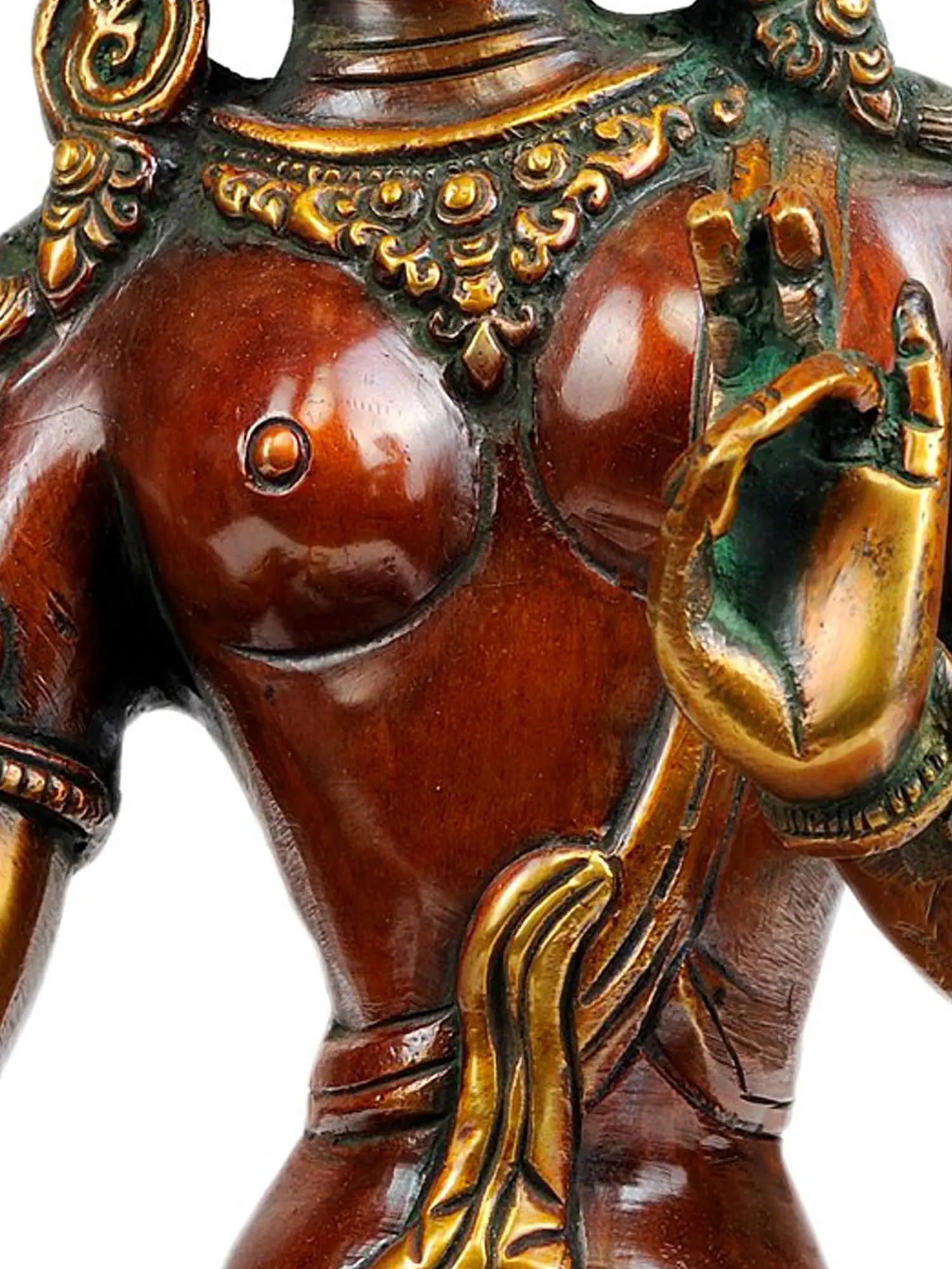 Every curve and detail of this sculpture is testament to the skill and dedication of Indian artisans, employing time-honored techniques passed down through generations. The casting process, the intricate detailing of her crown and jewelry, and the application of the aged finish, are all performed meticulously by hand. The brass material lends a weight and substance that speaks to the enduring nature of Tara's presence. Notice the delicate lotus flower blossoming near her left shoulder – a symbol of purity, spiritual awakening, and the unfolding of inner potential. This is more than just a decorative piece; it is a tangible representation of spiritual ideals, crafted with reverence and imbued with cultural significance. Let this sacred image serve as a constant reminder of the boundless compassion that resides within us all.