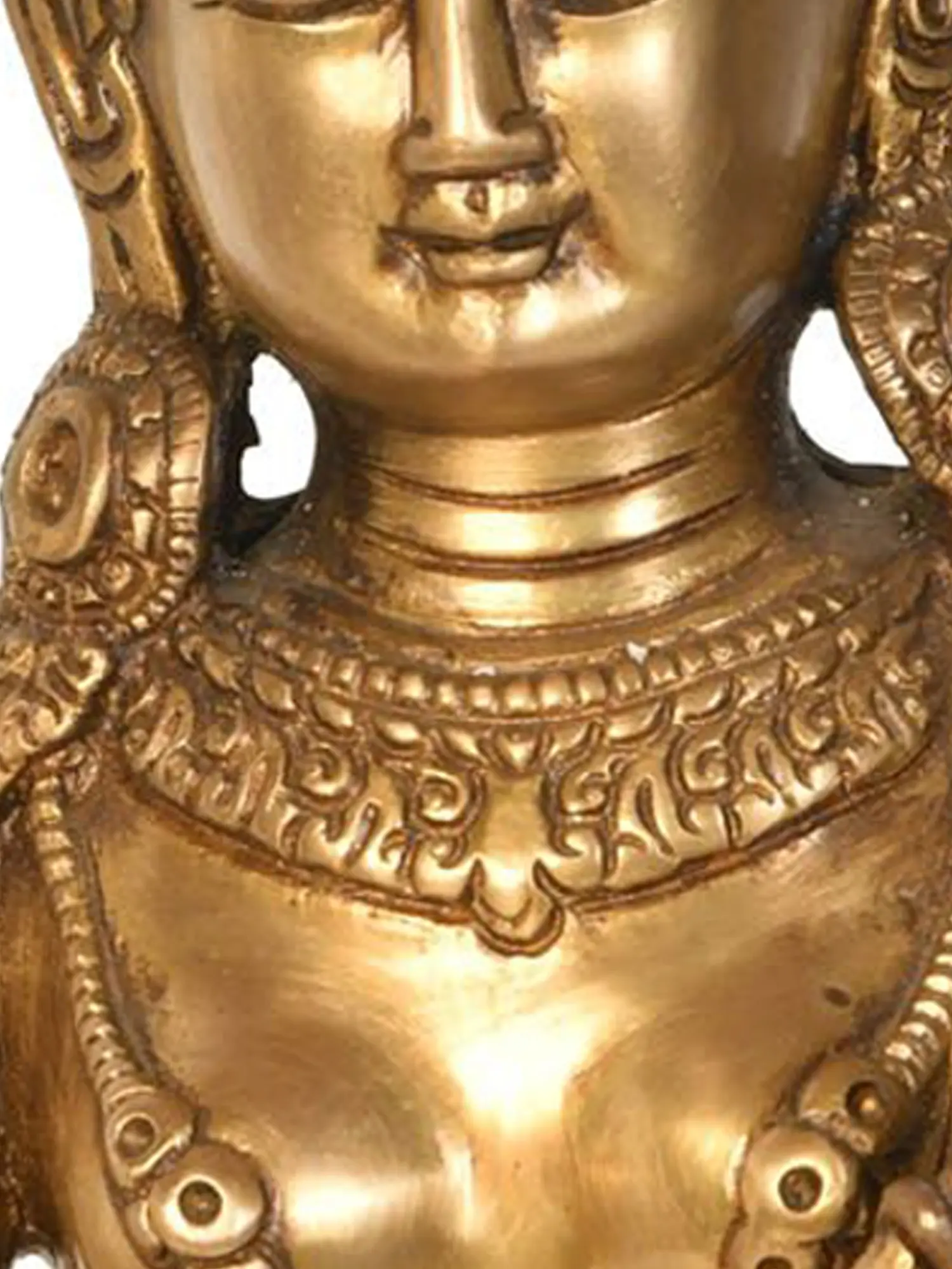 This exquisite brass sculpture captures the serene and compassionate essence of Green Tara, a revered bodhisattva in Tibetan Buddhism. Known as the "Mother of Liberation" and the "Goddess of Unified Action," Tara embodies swift, decisive action and compassionate responsiveness to the suffering of all sentient beings. Her emerald hue signifies her connection to nature, growth, and the untamed energy of compassion that blossoms like a lotus in the mud. The artistry of this piece, meticulously handcrafted in India, speaks volumes about the dedication and spiritual devotion poured into its creation. The lustrous brass, polished to a warm glow, highlights the intricate details of Tara's divine form. Her tranquil expression, with eyes gently downcast in meditation, conveys a profound sense of peace and wisdom. She is seated in the graceful posture of lalitasana, her right leg pendant, ready to spring into action at any moment to offer aid. ––––––––––––––––––––