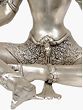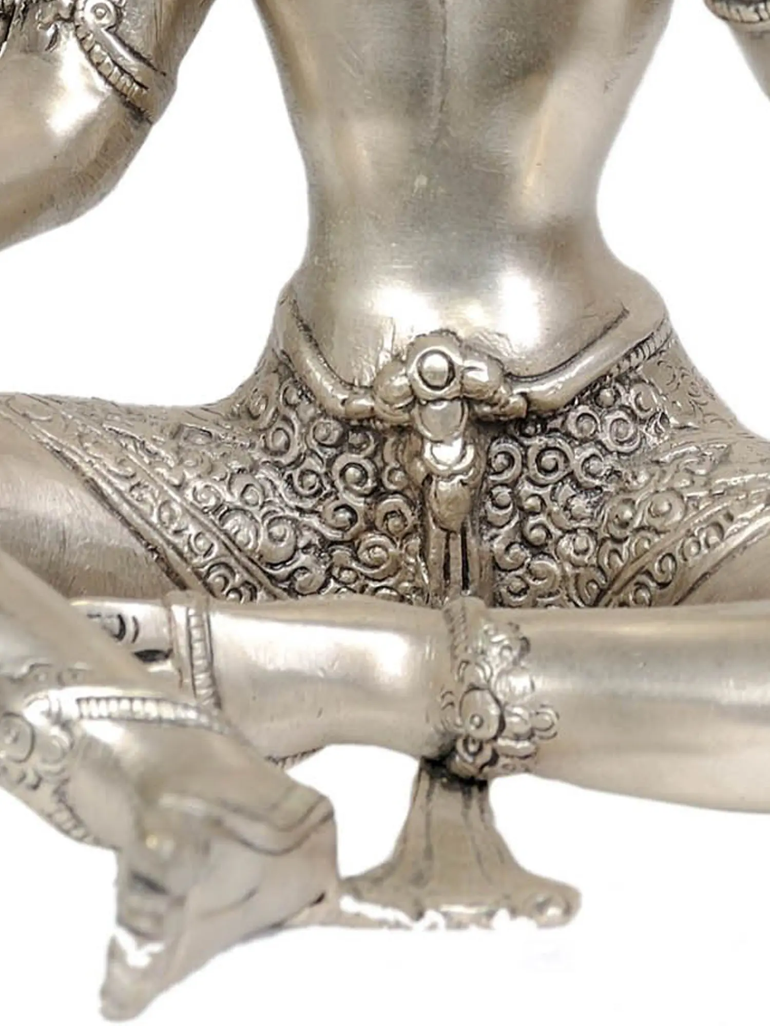 Handmade in India, this statue is a testament to the rich tradition of Indian craftsmanship. The artisans have meticulously sculpted the brass to bring forth the delicate features of Green Tara. Her serene facial expression, with downcast eyes suggesting deep meditation and boundless compassion, is beautifully rendered. The intricate details of her ornamentation, from the elaborate crown adorning her head to the delicate jewelry that graces her neck, wrists, and ankles, showcase the skill and devotion of the creators. The flowing drapery and the finely incised patterns on her garments add to the statue's visual richness. The silver finish lends a timeless elegance, enhancing the divine aura of this sacred icon.