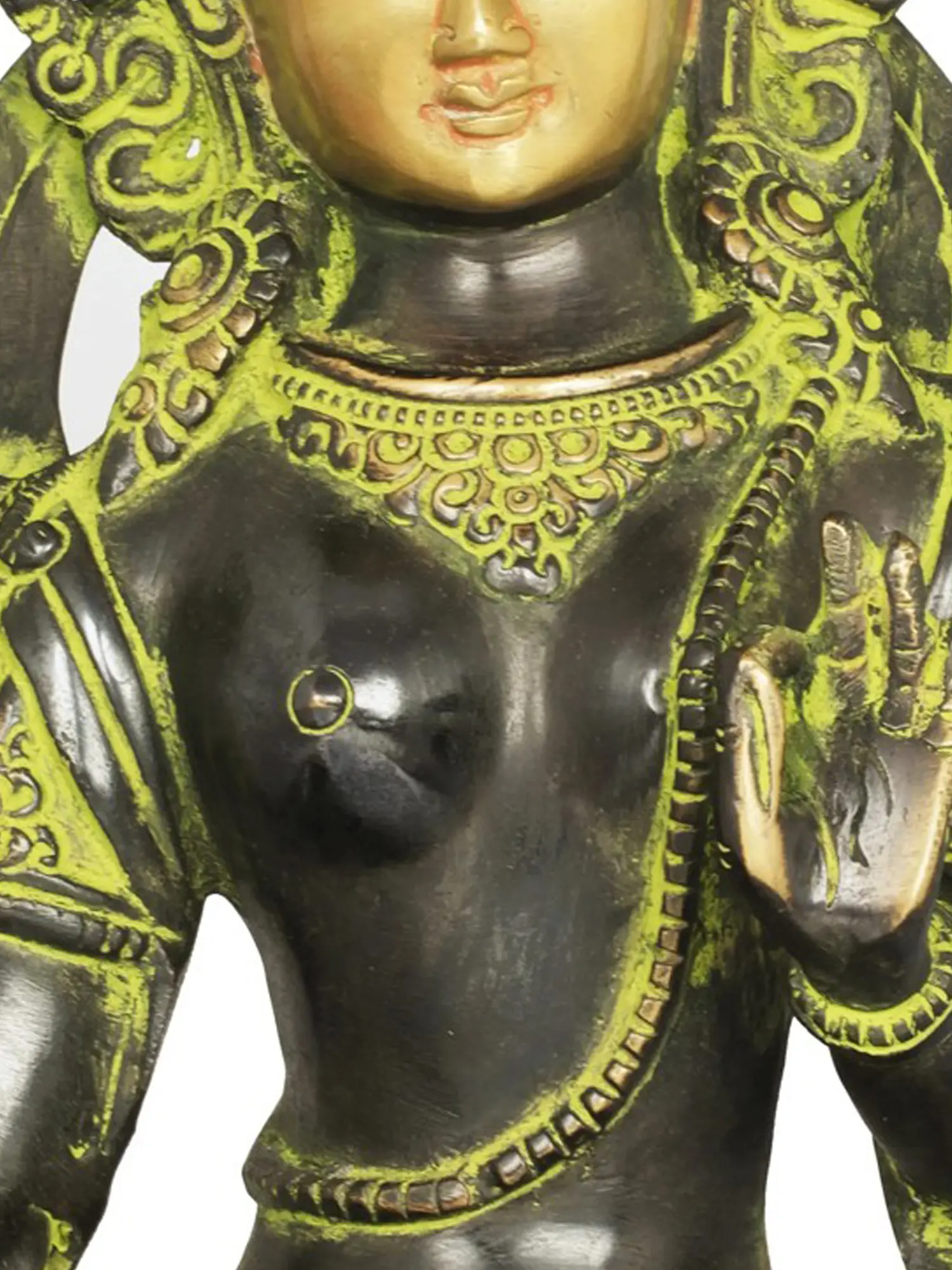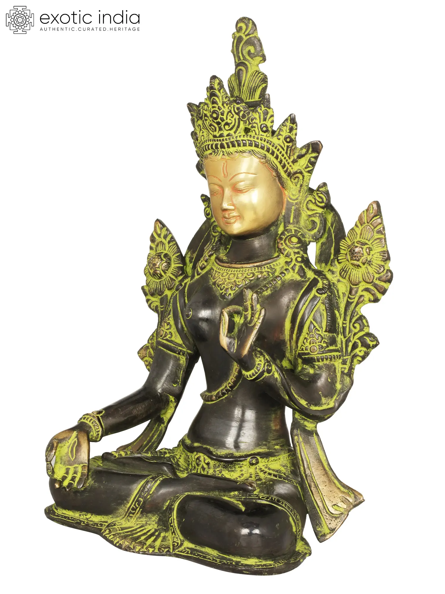Embrace the tranquillity of Tibetan Buddhist philosophy with this handmade brass statue of White Tara. In Tibetan Buddhism, White Tara is revered as a symbol of compassion, healing, and long life. This beautifully crafted piece, made in India, embodies the essence of Tara's grace and nurturing presence. Display it in your sacred space to invoke her blessings of peace and well-being.