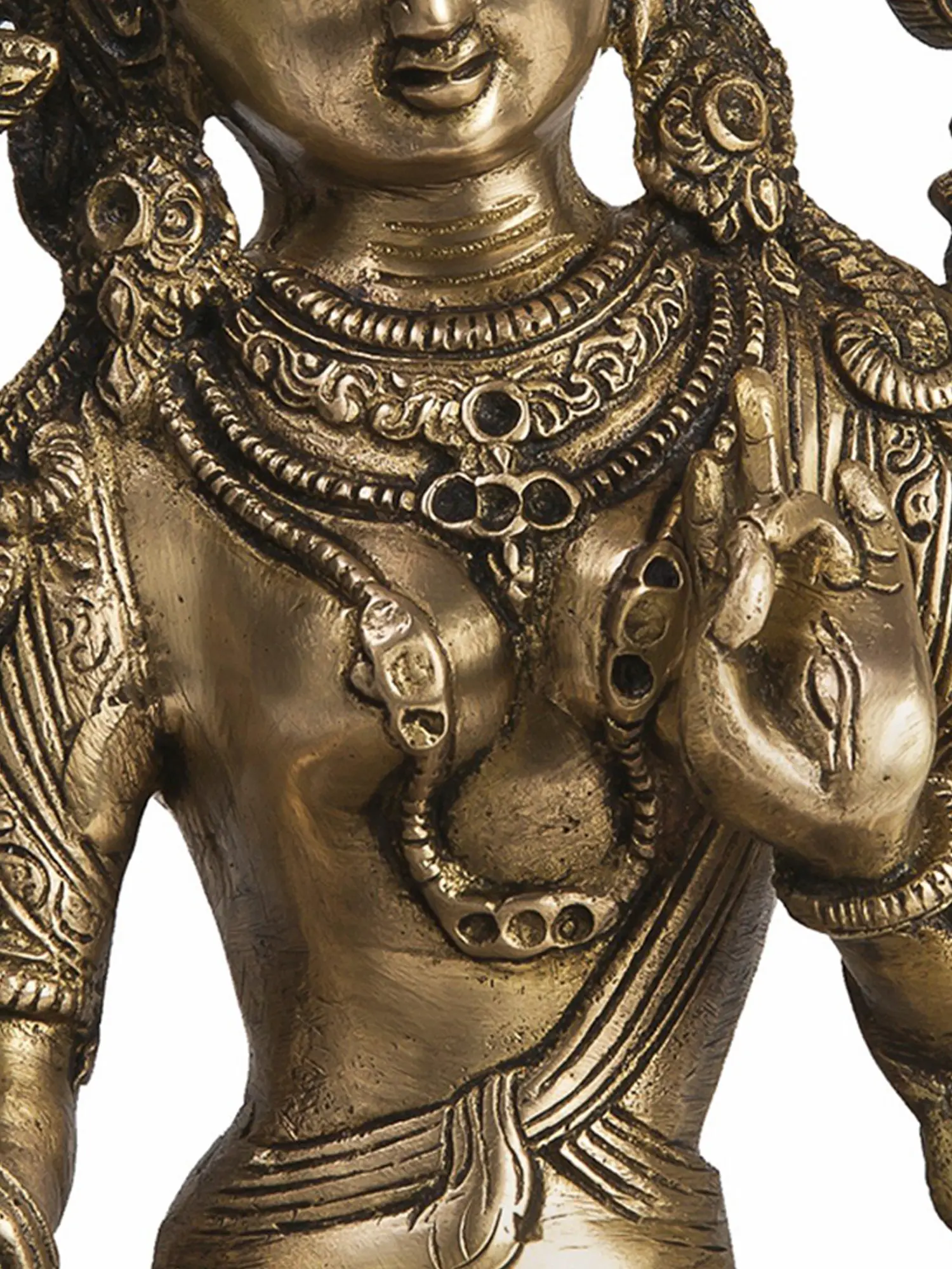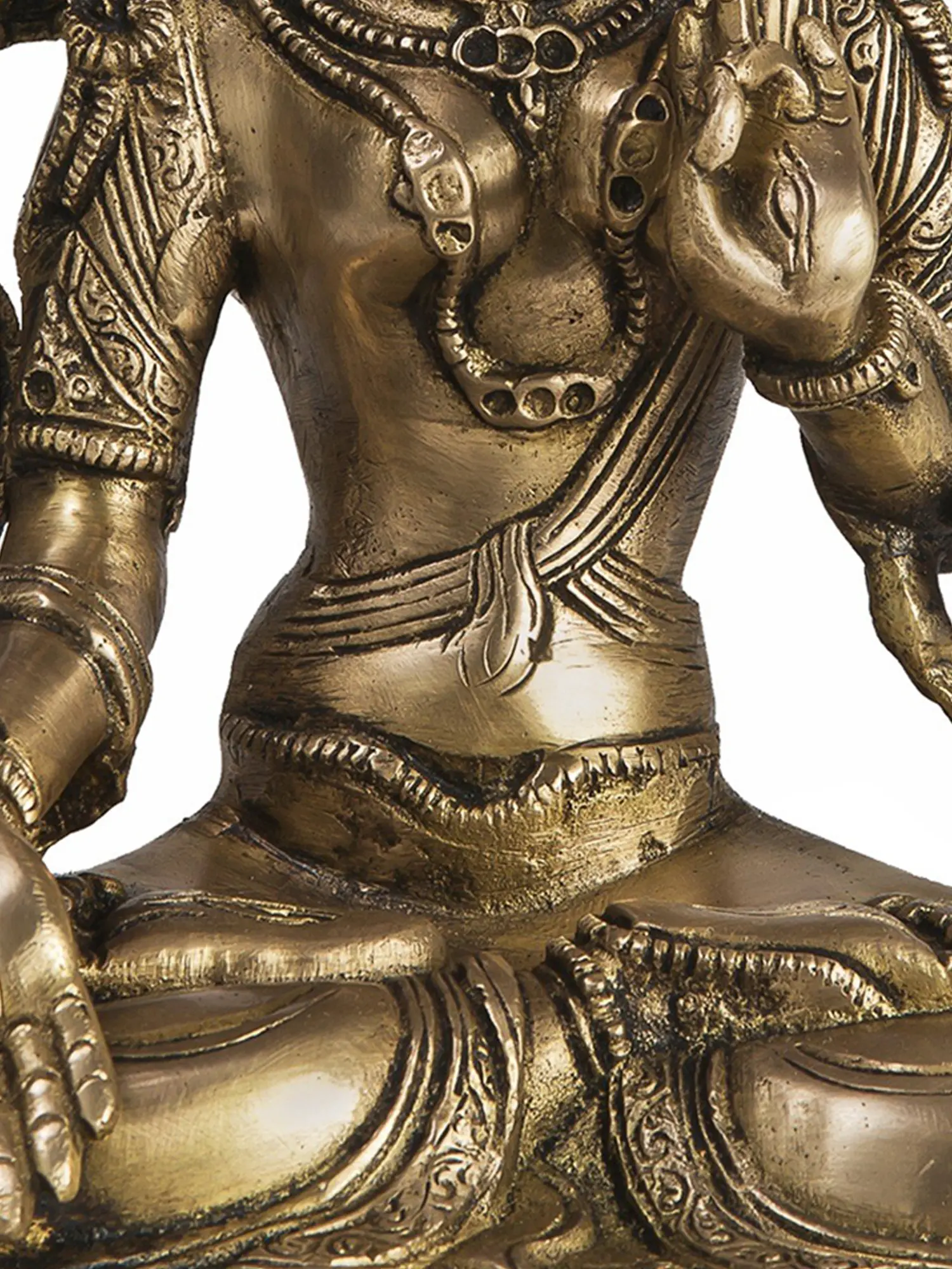 White Tara is distinguished by her seven eyes – three on her face (the third eye on her forehead signifying wisdom and insight), and one on each of her hands and feet, symbolizing her ability to perceive suffering in all realms and her swiftness in offering aid. Her right hand is in the Varada Mudra, the gesture of generosity and bestowing blessings. Her left hand holds a lotus flower, a symbol of purity and spiritual awakening. Seated in the lotus position, she represents tranquility and balance. The intricate details of her crown, jewelry, and garments showcase the exquisite craftsmanship involved in bringing this revered figure to life. The brass material itself adds a richness and warmth to the sculpture, inviting contemplation and reverence.