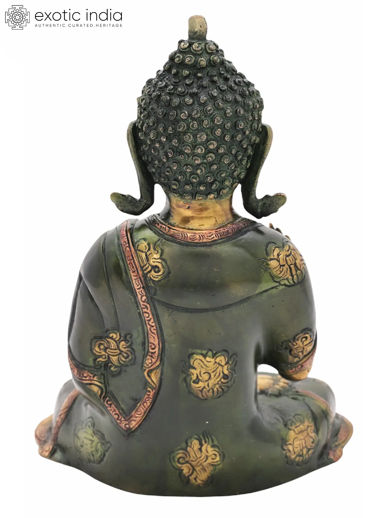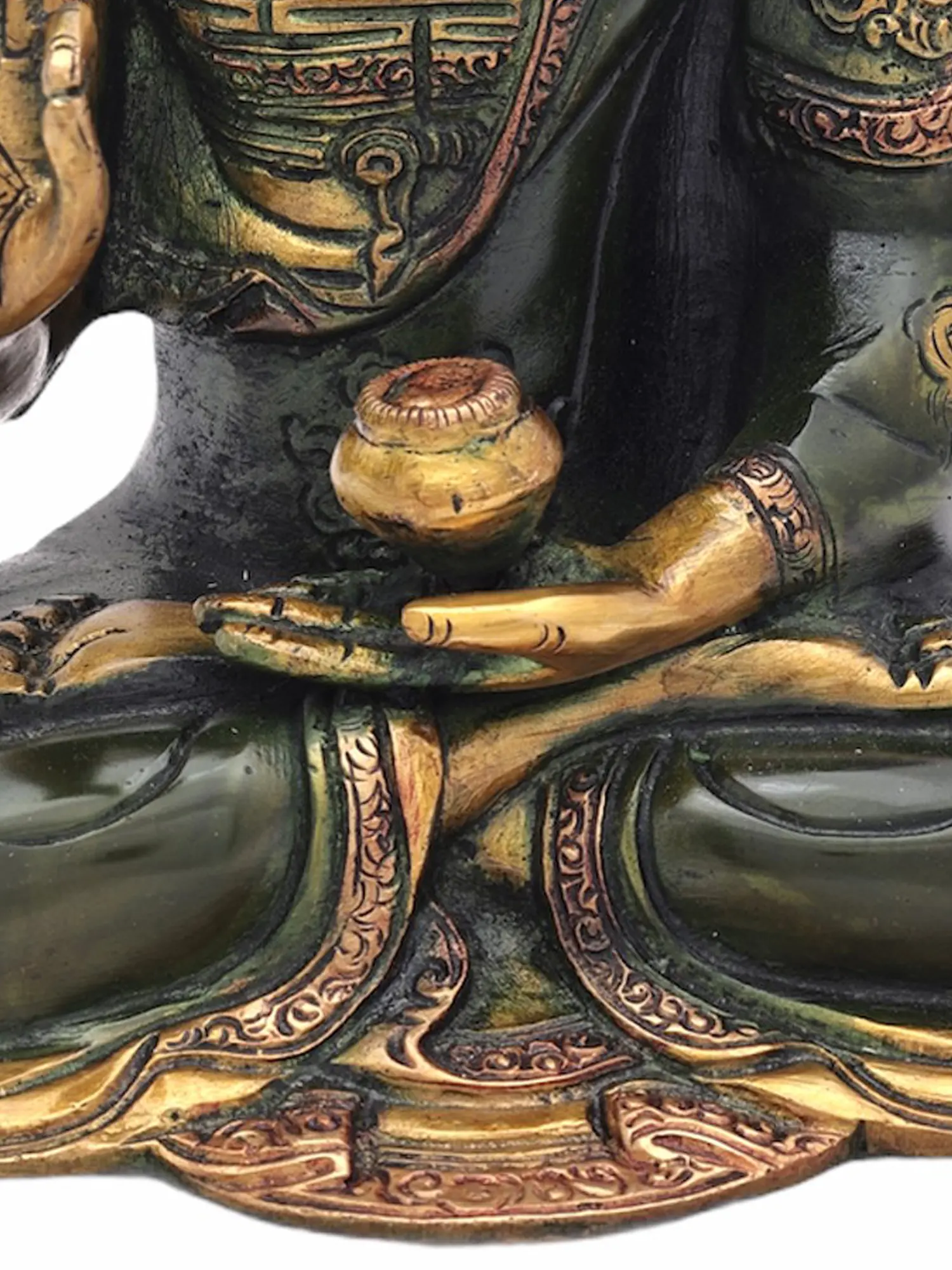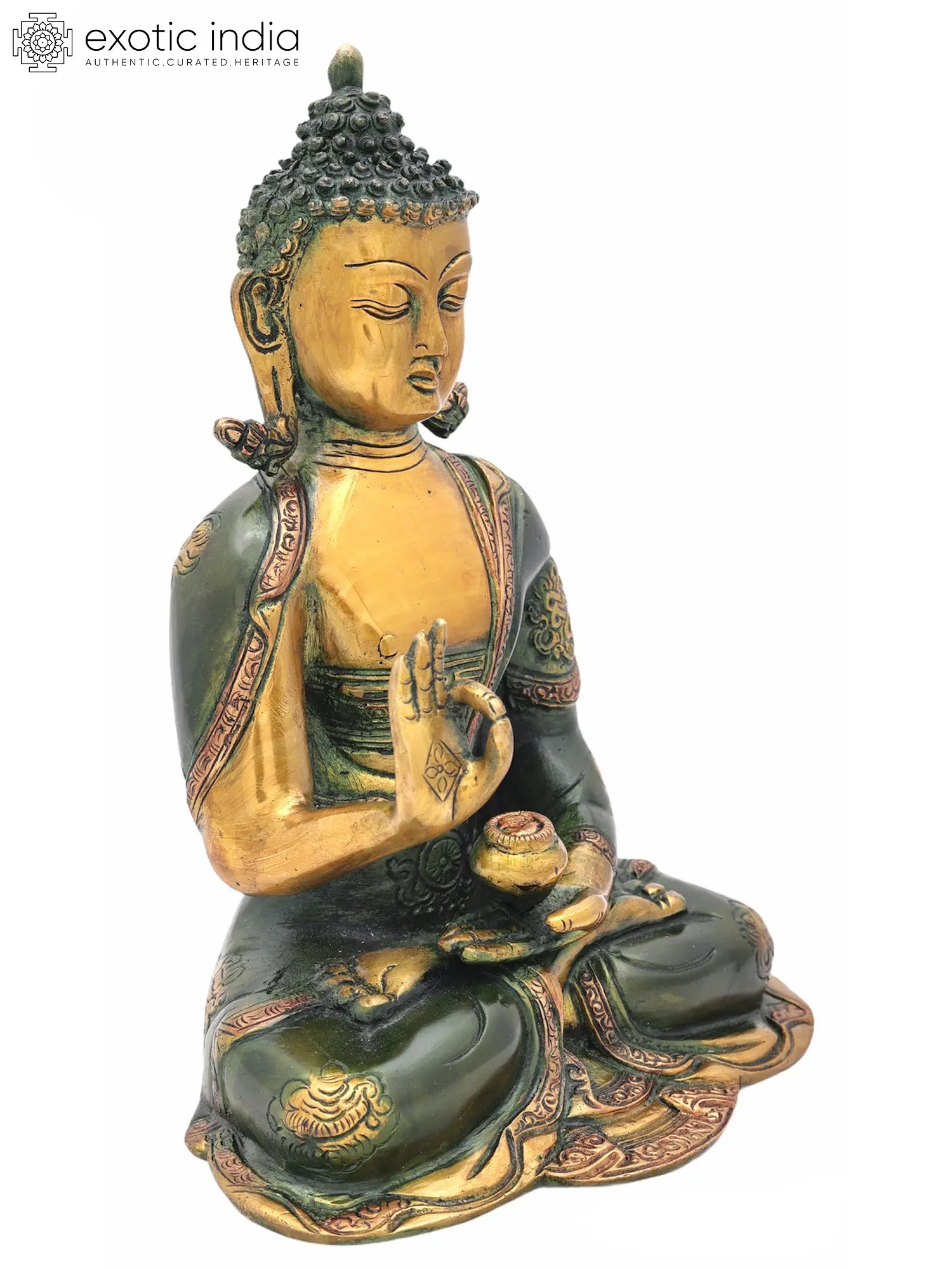 This resplendent statue is rendered in brass, a material chosen for its durability and its ability to capture intricate details. The artist's skilled hands have brought forth a figure of remarkable grace. The deep, rich green patina on the robes contrasts beautifully with the warm, golden hue of the Buddha's skin, creating a visually striking piece. Intricate detailing adorns the monastic robe, with delicate patterns that speak of ancient craftsmanship. The right hand is raised in the Abhaya Mudra, a gesture of fearless protection, bestowing blessings and dispelling fear. In his left hand, cradled in his lap, he holds the alms bowl containing the nectar of immortality and healing herbs, symbolizing his power to cure all forms of illness and delusion. His coiled hair and serene gaze are characteristic of depictions of the Buddha, radiating peace and wisdom. ––––––––––