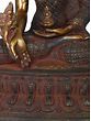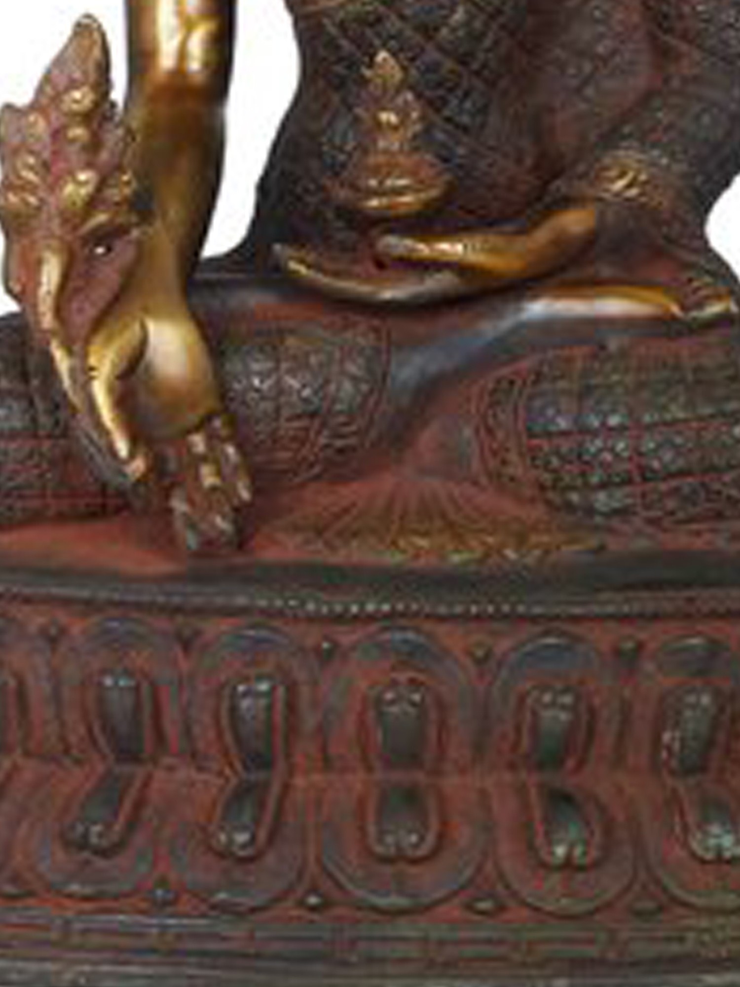 This exquisite brass statue captures the serene and compassionate form of the Medicine Buddha, also known as Bhaisajyaguru. Seated in a meditative posture upon an ornate lotus pedestal, this representation embodies profound healing and spiritual well-being. The intricate details of the robe, adorned with delicate patterns, speak to the masterful craftsmanship involved in its creation. The serene countenance, with closed eyes and a gentle smile, radiates an aura of peace and tranquility, inviting contemplation and solace.