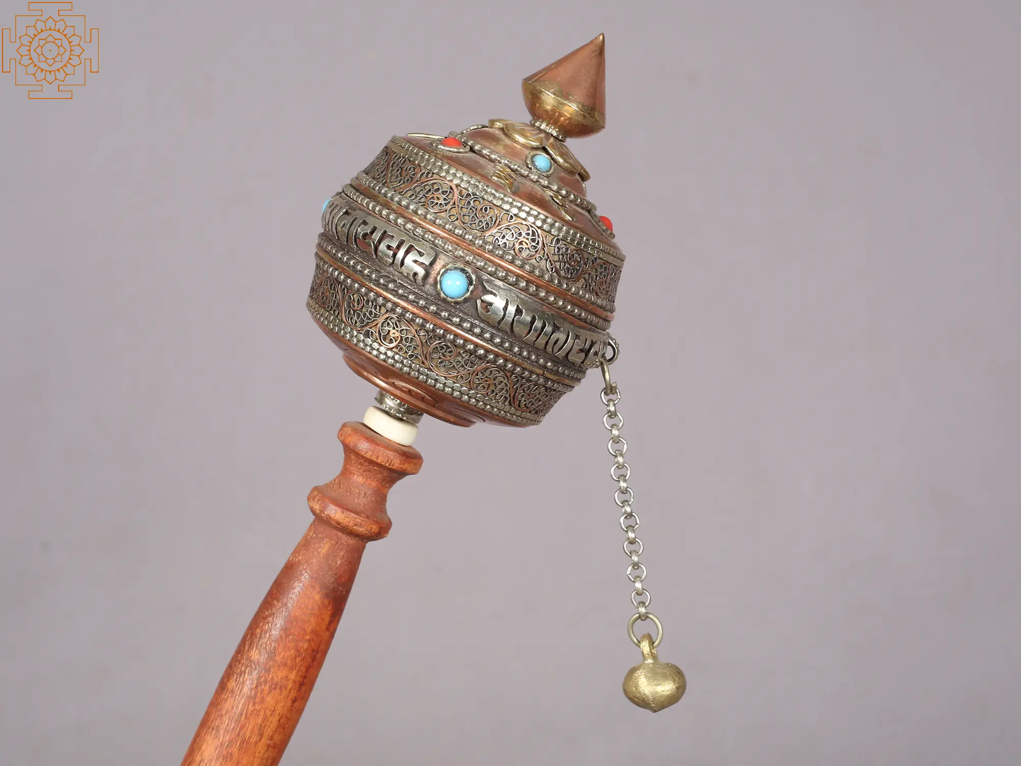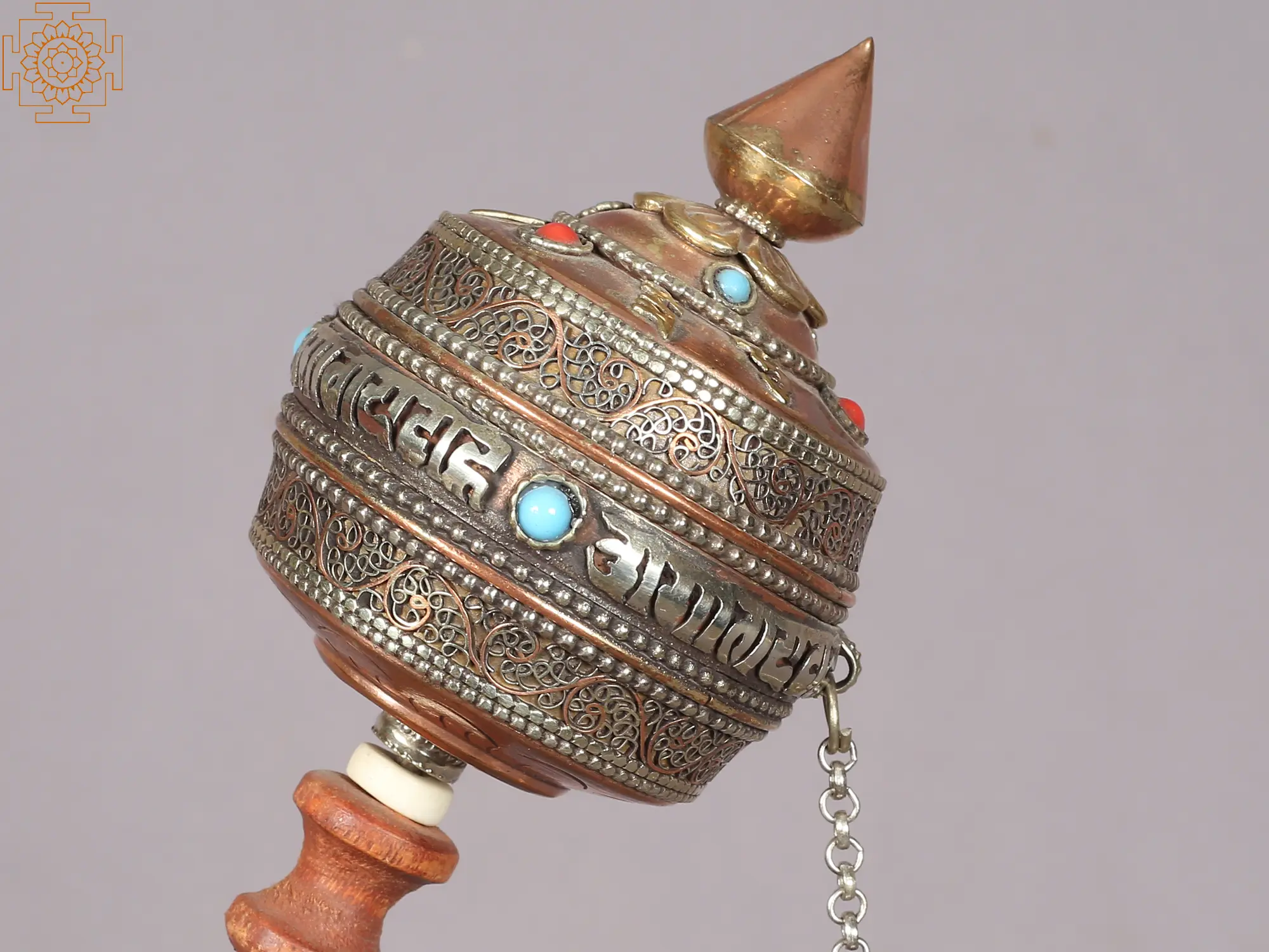 This exquisite prayer wheel offers a tangible connection to ancient spiritual traditions and a path towards inner peace. Crafted with a beautiful blend of copper and wood, it embodies the artistry and devotion central to Tibetan Buddhism. The cylindrical barrel, meticulously adorned with intricate silver filigree and turquoise inlays, evokes the sacred mountains and celestial realms of Buddhist cosmology. The Sanskrit mantra, "Om Mani Padme Hum," is elegantly inscribed around the barrel, each repetition a silent prayer that, when spun, is believed to multiply its spiritual merit. The practice of turning a prayer wheel is deeply rooted in Buddhist philosophy. It is said that the great bodhisattva Avalokiteshvara, the embodiment of compassion, revealed the prayer wheel to a king in ancient India. By turning the wheel, one not only recites mantras but also generates positive karma and purifies negative obscurations. The act of spinning the wheel is considered equivalent to verbally reciting the mantras contained within, and each rotation is believed to purify the mind, accumulate merit, and bring blessings to all sentient beings. The small pendulum, often a metal ball on a chain, helps to maintain the momentum of the wheel, symbolizing the continuous flow of enlightened wisdom.