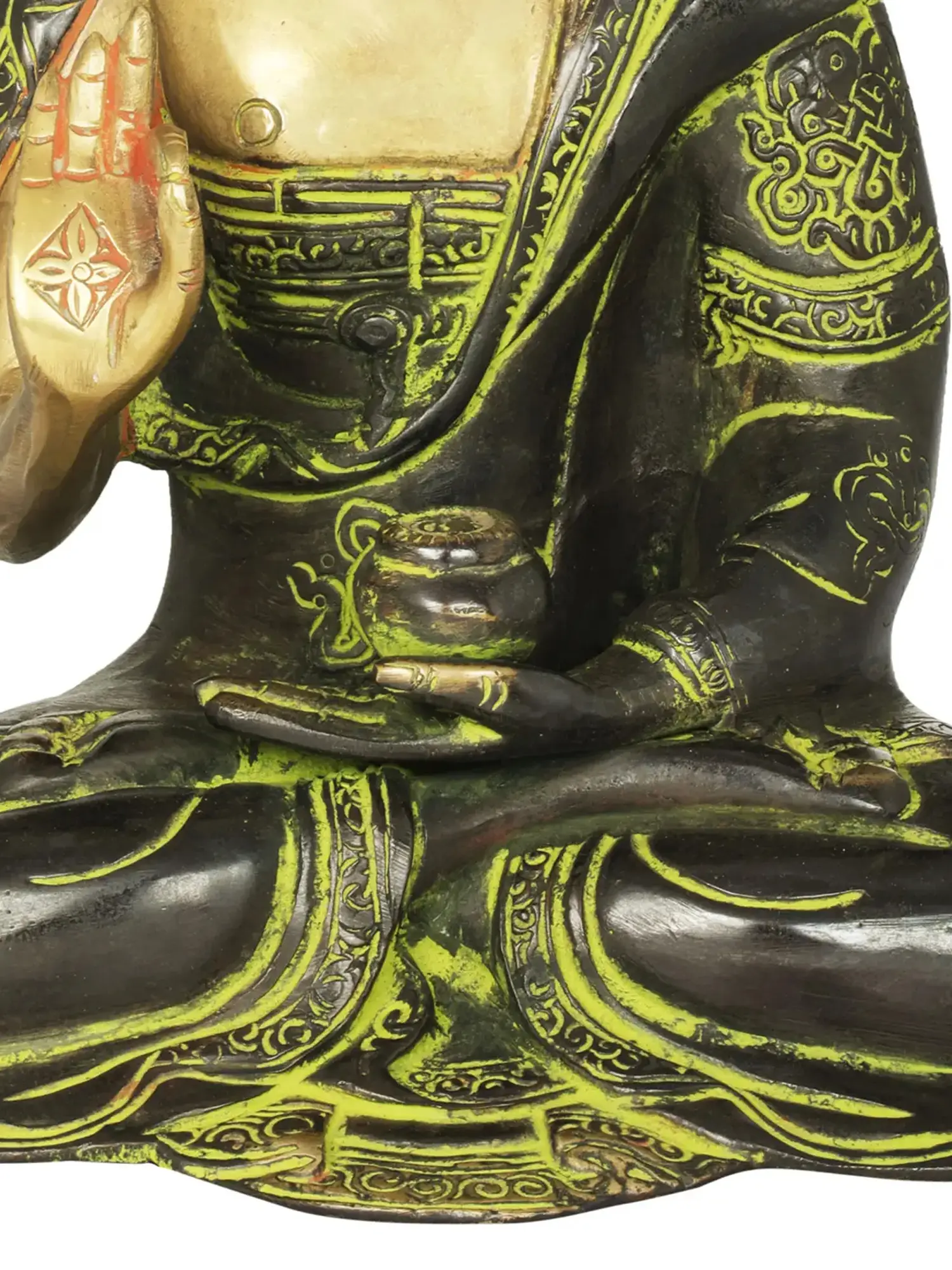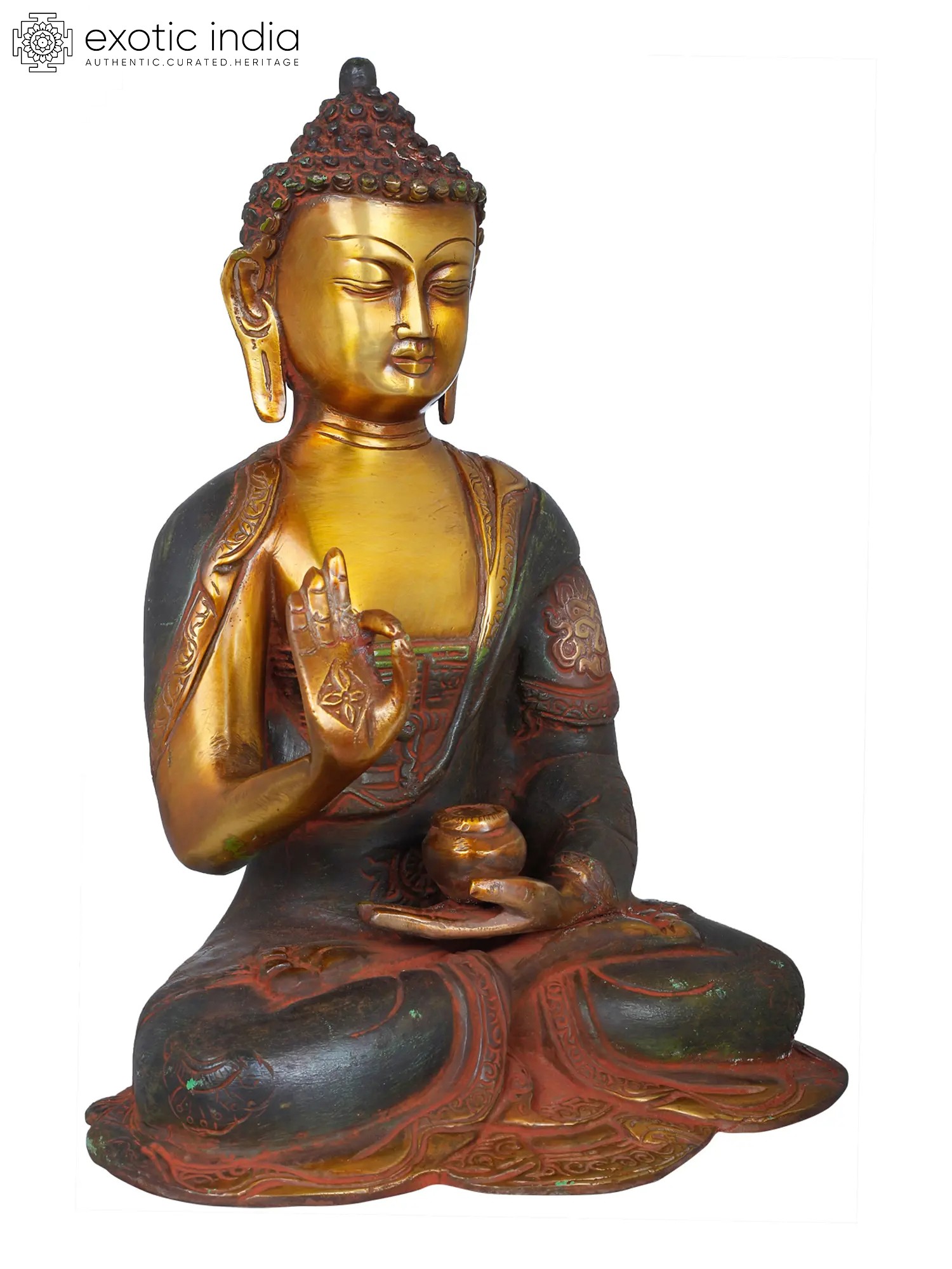 This exquisite brass statue captures the serene essence of the Buddha in a moment of profound teaching. The figure is seated in the classic lotus posture, symbolizing spiritual enlightenment and detachment from worldly desires. The right hand is raised in the Abhaya Mudra, a gesture of fearless protection and reassurance, banishing fear and bestowing peace upon the observer. The left hand rests in the lap, palm upwards, holding an alms bowl, representing the Buddha's renunciation of earthly possessions and his acceptance of sustenance to continue his spiritual journey. The detailed artistry, showcasing the delicate folds of his monastic robes and the serene expression on his face, speaks to the reverence and skill of the artisans who brought this piece to life in India.