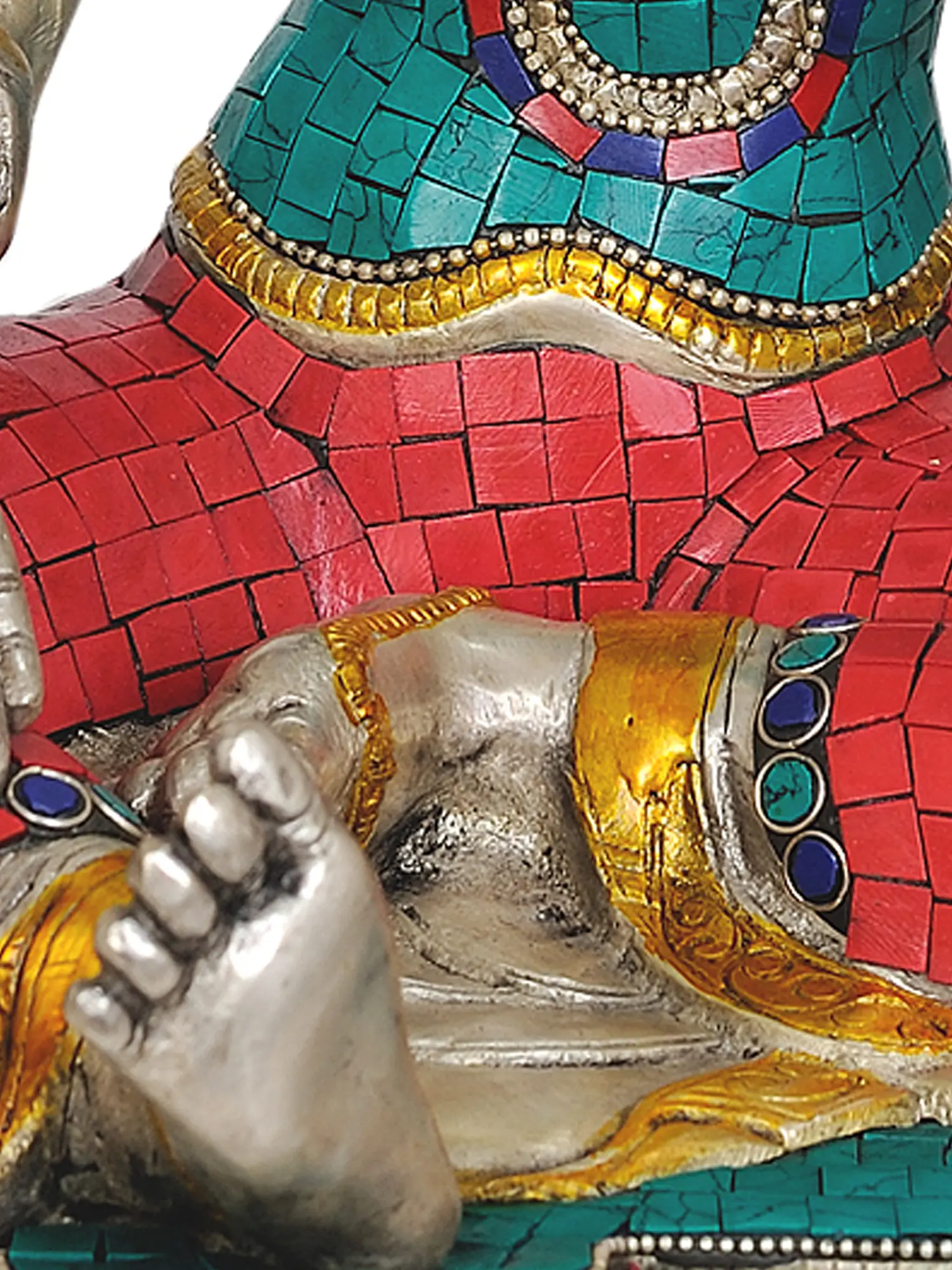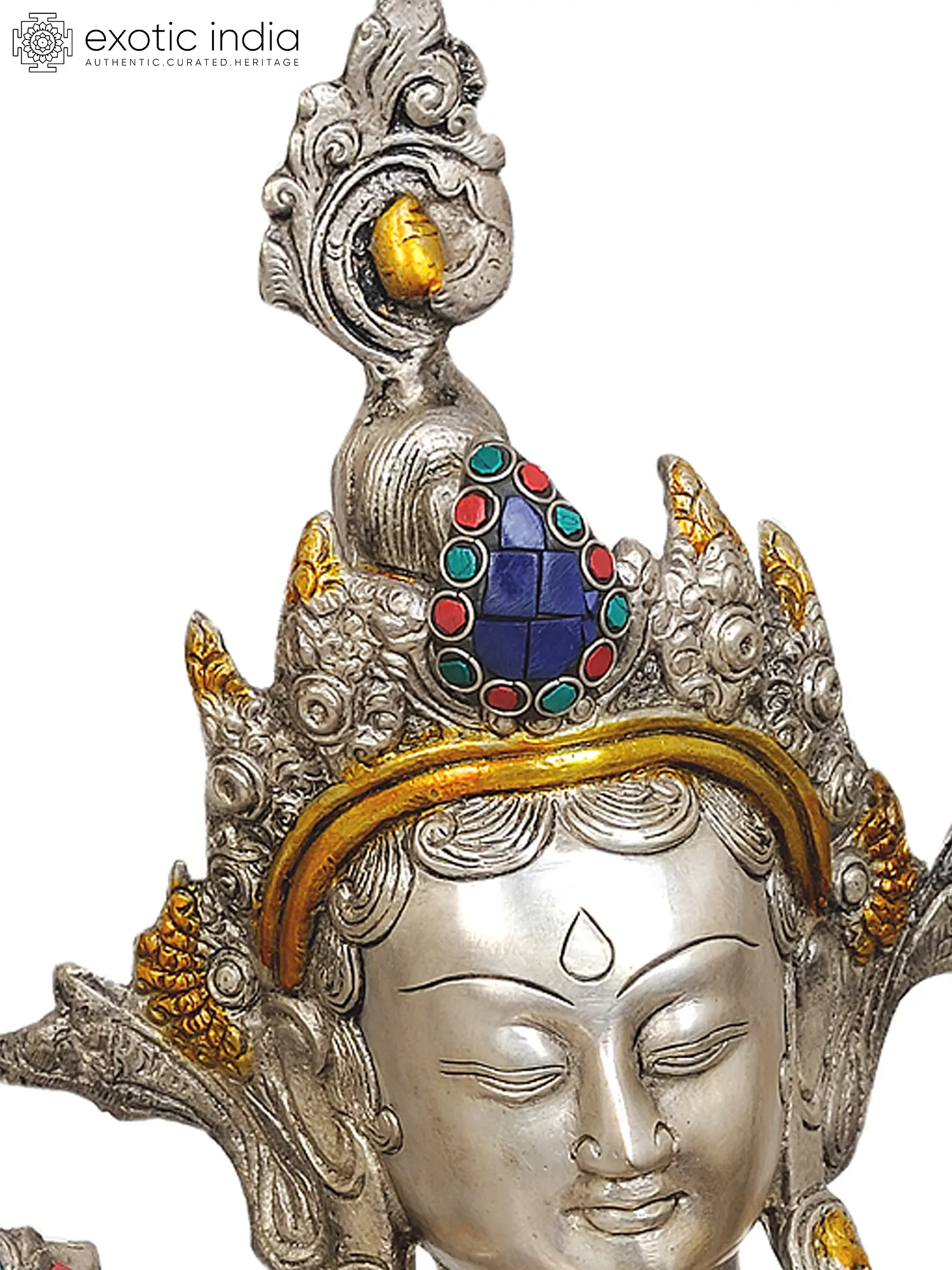 The artistry of this statue is truly captivating, a testament to the skill of Indian artisans. The smooth, lustrous brass forms the foundation, providing a noble canvas for the intricate detailing. What elevates this representation to extraordinary heights is the vibrant inlay work. Rich hues of turquoise and coral, meticulously placed, adorn her divine form, imbuing the statue with a breathtaking visual appeal. These stones are not merely decorative; they hold symbolic significance within Buddhist traditions, representing various qualities and elements. The deep blues of turquoise often symbolize wisdom and the vastness of the sky, while the vibrant reds of coral are associated with vitality, compassion, and overcoming obstacles. The interplay of these colors against the silver-toned brass creates a dynamic and harmonious composition that draws the eye and stirs the soul. From the ornate crown adorning her head, itself a masterpiece of detailed metalwork and inlaid stones, to the flowing garments that drape her form, every element of this statue speaks of divine artistry and devotion. The elaborate jewelry, including necklaces and armbands, further enhances her regal and compassionate appearance. The lotus throne upon which she sits is equally adorned, showcasing the same meticulous inlay work and intricate carving, creating a majestic pedestal worthy of the goddess.