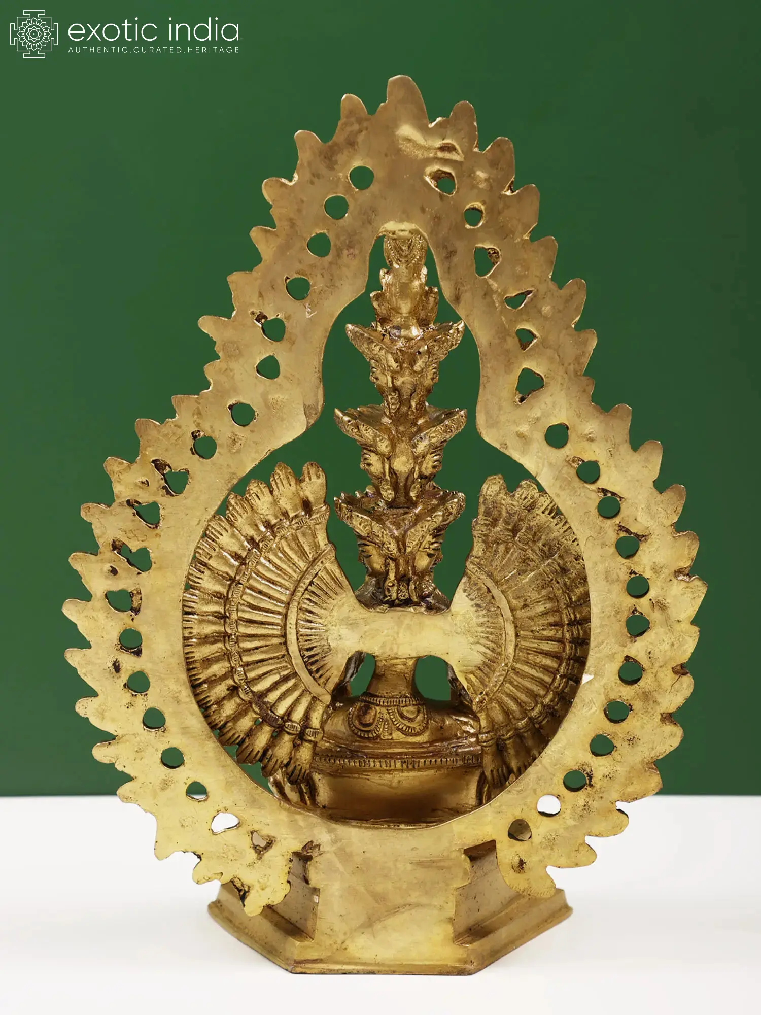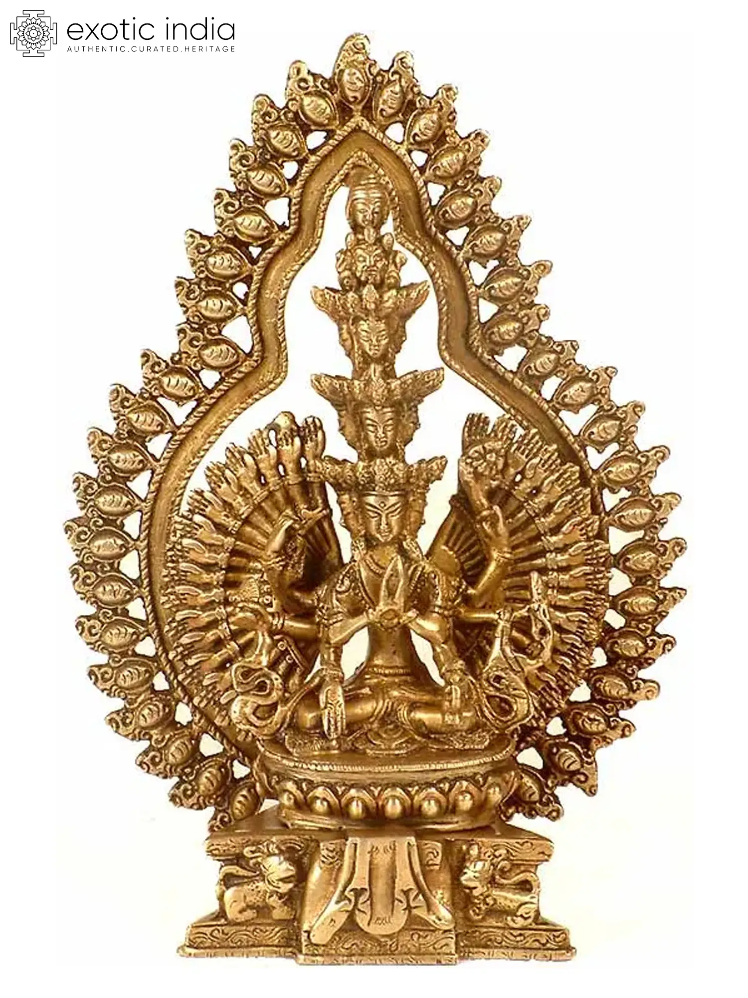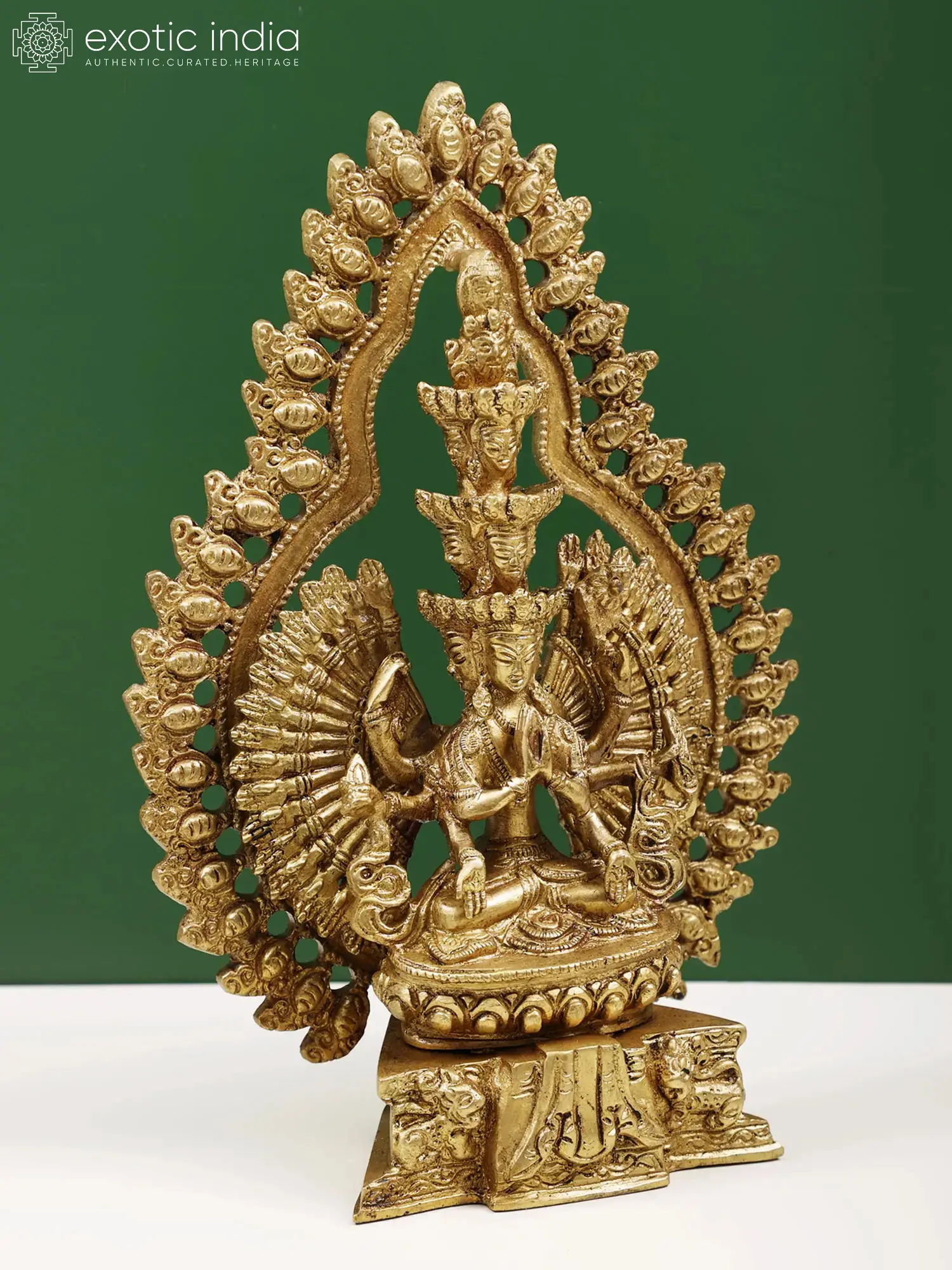 The Avalokiteshwara, one of Amitabha's attendants, is the one who observes and hears the devotees' cries. One time, he felt so impassioned as a result of his devotees' anguish that his skull broke. After observing this, Amitabha gave him eleven heads and capped them with his own head. The eleven heads were to assist him in observing an infinite number of worshippers. He also received a thousand hands to support them. This Avalokiteshwara's iconic sculpture made in brass, portrays only forty-two hands but represents his power to erase the pain from every part of the universe. He is depicted seated on a lotus pedestal in the Dhyani Mudra, with two of his upper hands in the Anjali Mudra, representing his contemplative aspect. Standing as a testament to compassion and enlightenment, this sculpture serves as a profound reminder of the boundless compassion and the potential for enlightenment within all sentient beings.