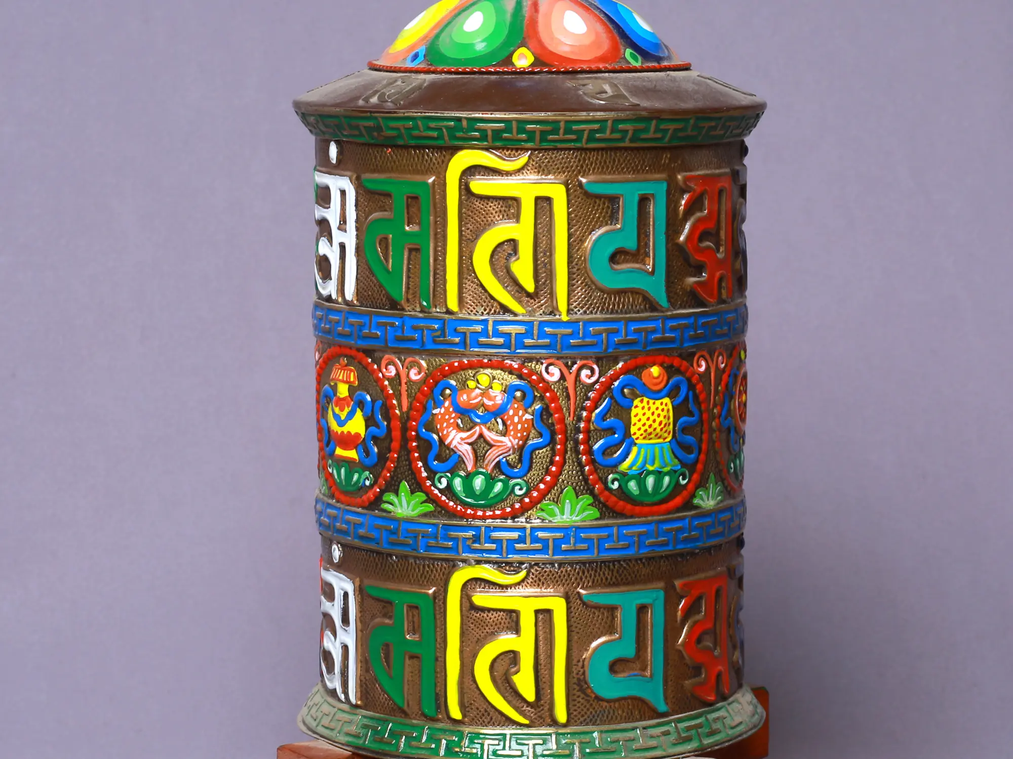 A mesmerizing combination of vibrant colors, sacred mantras, and auspicious symbols is this Two-Lined Mantra Ashtamangala Extra Fine Colorful Prayer. This exquisite prayer wheel from Nepal features two lines of sacred mantras intricately carved on its surface, invoking pious energies. At the center, eight auspicious symbols relating to Ashtamangala are beautifully painted and intricately carved, representing aspects of Buddhist teachings. The colorful design and symbolism of this prayer wheel hold the potential to uplift and heal one's mental well-being. Each element, from the bright colours to the meticulously carved symbols, contributes to a transformative spiritual experience.