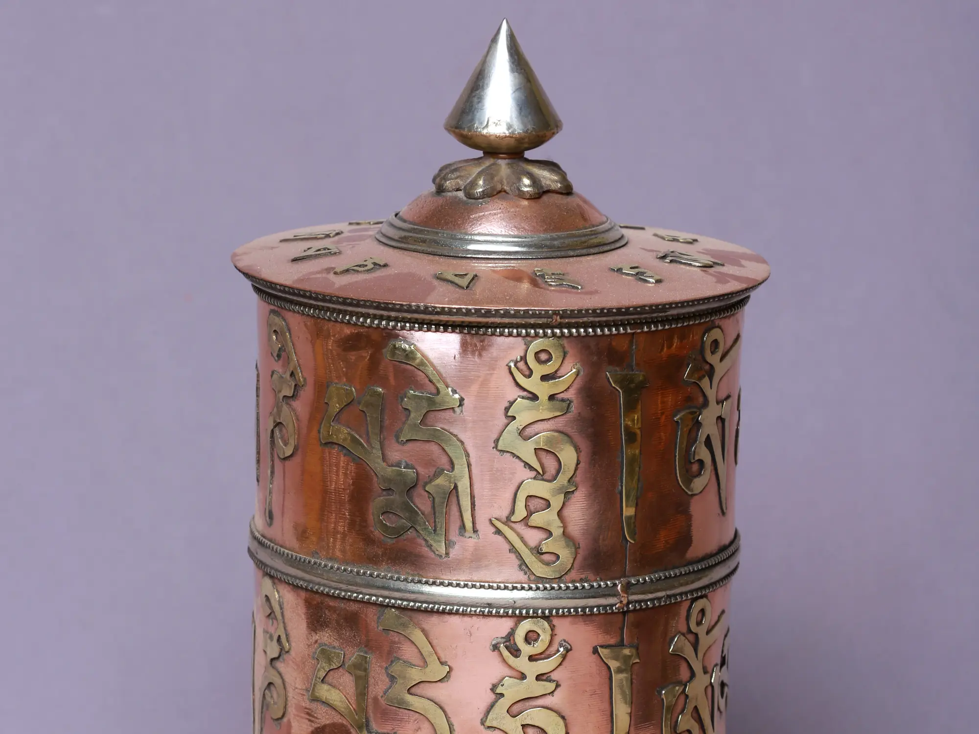 Adorned with intricately carved Tibetan letters, which form powerful mantras, invoking blessings and positive energy, this prayer wheel symbolises the teachings of Lord Buddha. The sacred mantras, according to practitioners, are released into the world by revolving the wheel, fostering compassion, and eradicating negativity. The Prayer wheel from Nepal, which was crafted with dedication and skill, represents the region’s rich spiritual and cultural traditions. Made from copper (a sacred metal in Buddhist tradition), the Prayer Wheel is a representation of devotion and compassion that serves as a reminder to practitioners of the value of cultivating mindfulness and benevolence. Wherever you place this precious piece of art, inlaid with Buddhist mantras, there will be an unbreakable serenity.