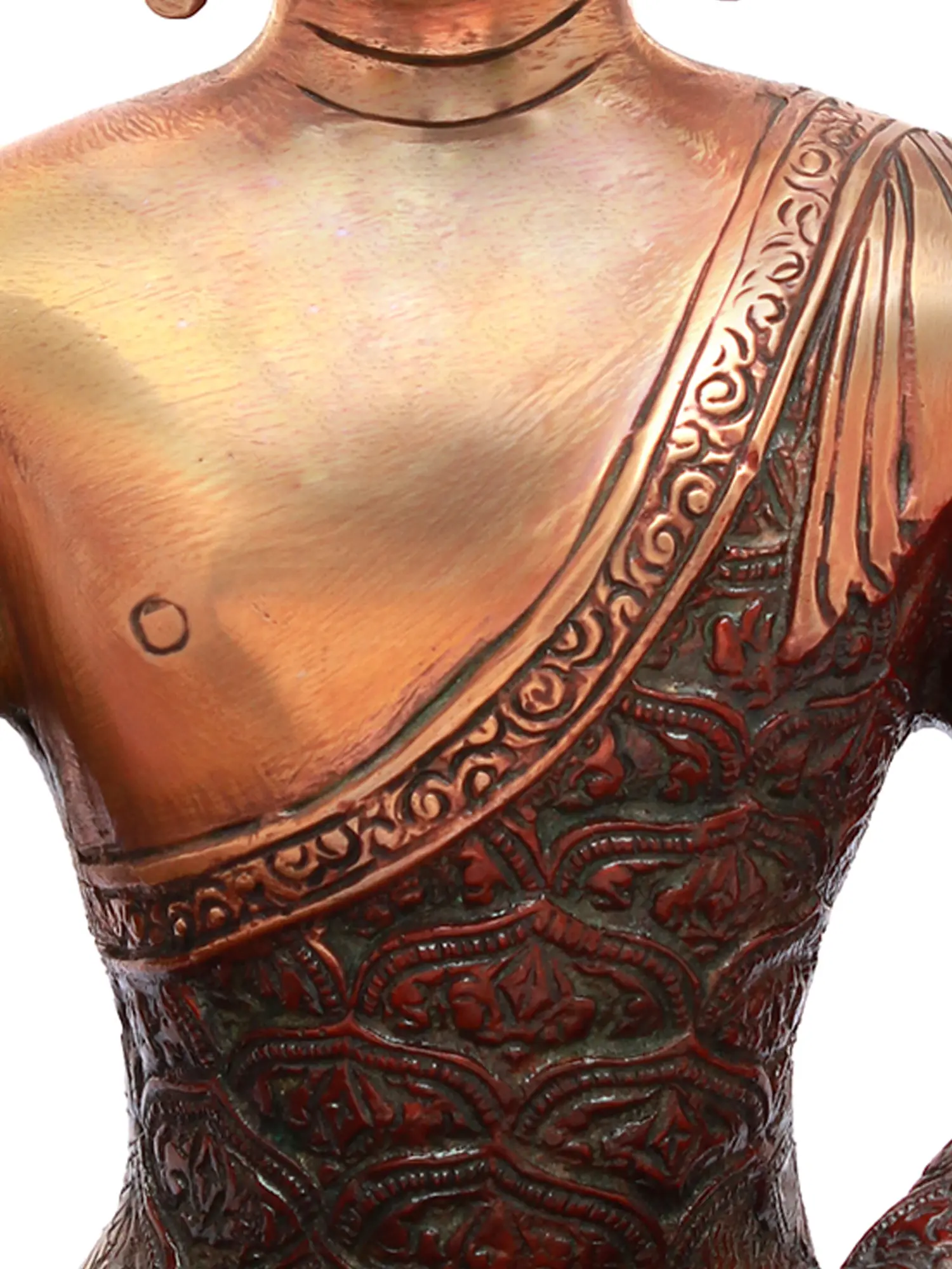 Handmade in India, this brass sculpture is a testament to the rich artistic traditions and devotional practices that have flourished on the subcontinent for centuries. The skilled artisans have meticulously crafted each detail, from the serene facial features to the complex patterns adorning the robes, using traditional techniques passed down through generations. The warm, lustrous finish of the brass enhances the divine aura of the Buddha, making it a truly captivating piece. Owning this sculpture is not just acquiring an object of beauty, but connecting with a lineage of craftsmanship that has served to bring spiritual iconography to life for countless devotees. Its presence can transform any space into a sanctuary of peace and reflection, evoking the profound wisdom and compassion of the Awakened One.
