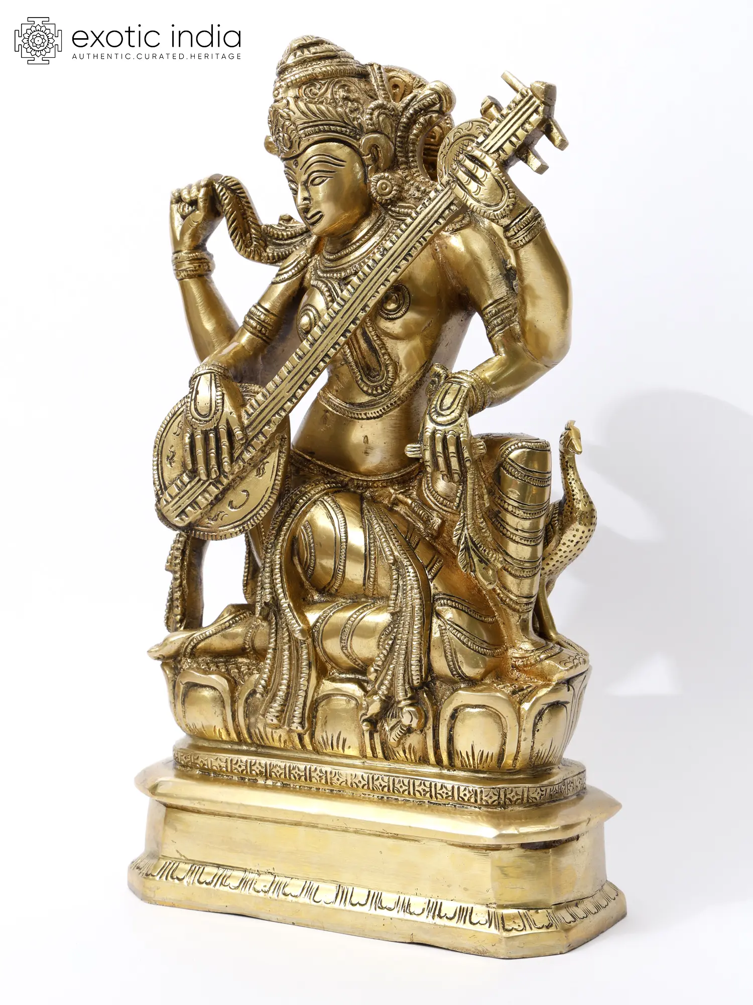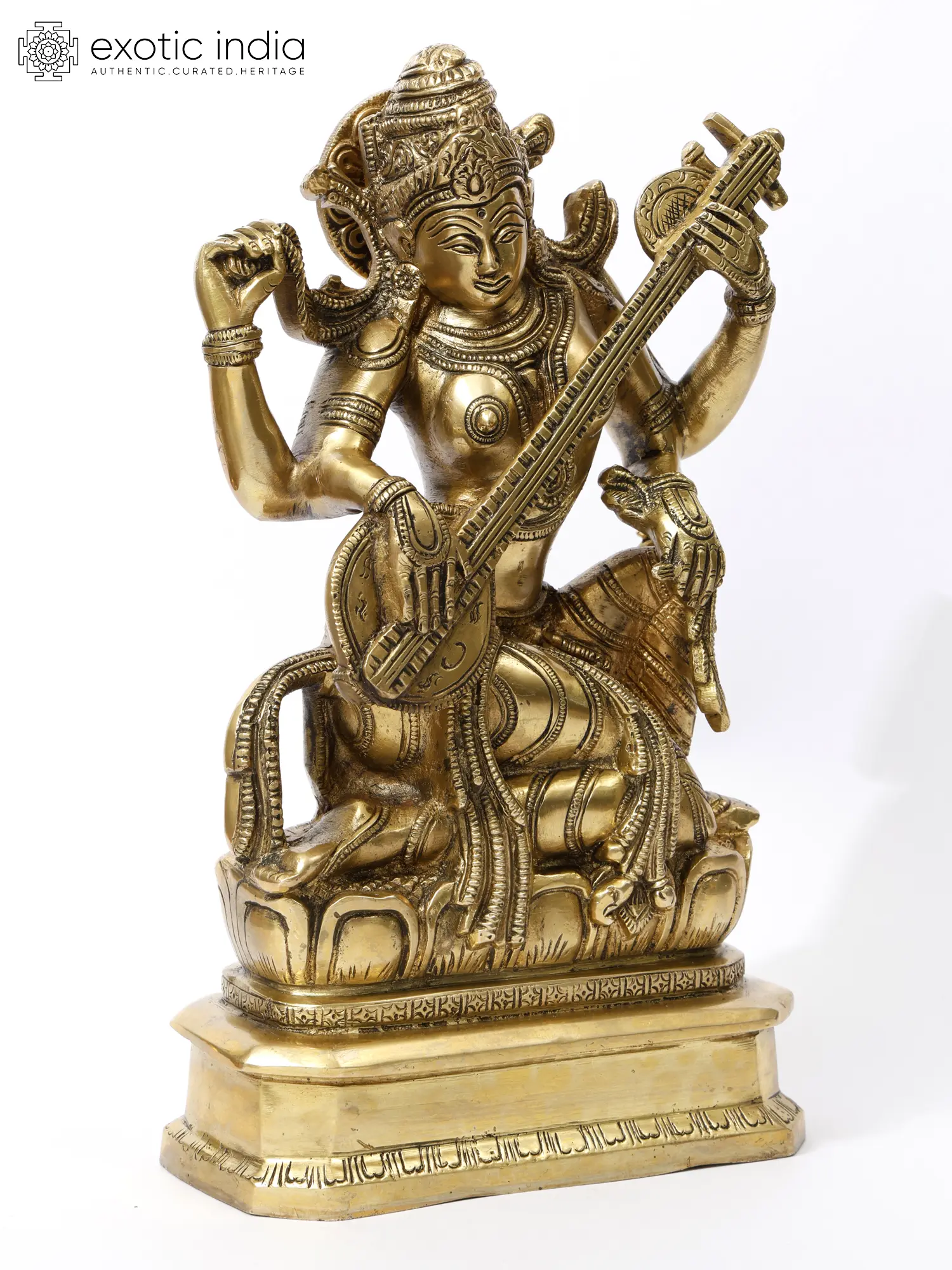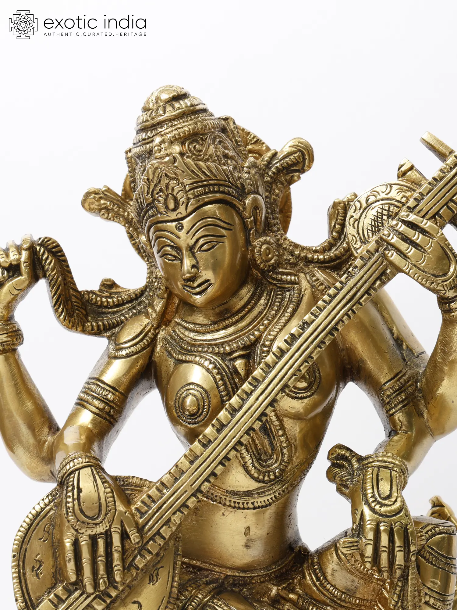Veenavadini (she who plays the Veena) Saraswati appears in this divine brass statue in the pose of a seasoned musician- one leg bent and the other folded under to support the instrument. With alertness, she seems to be immersed in creating melodious tunes with each strum.