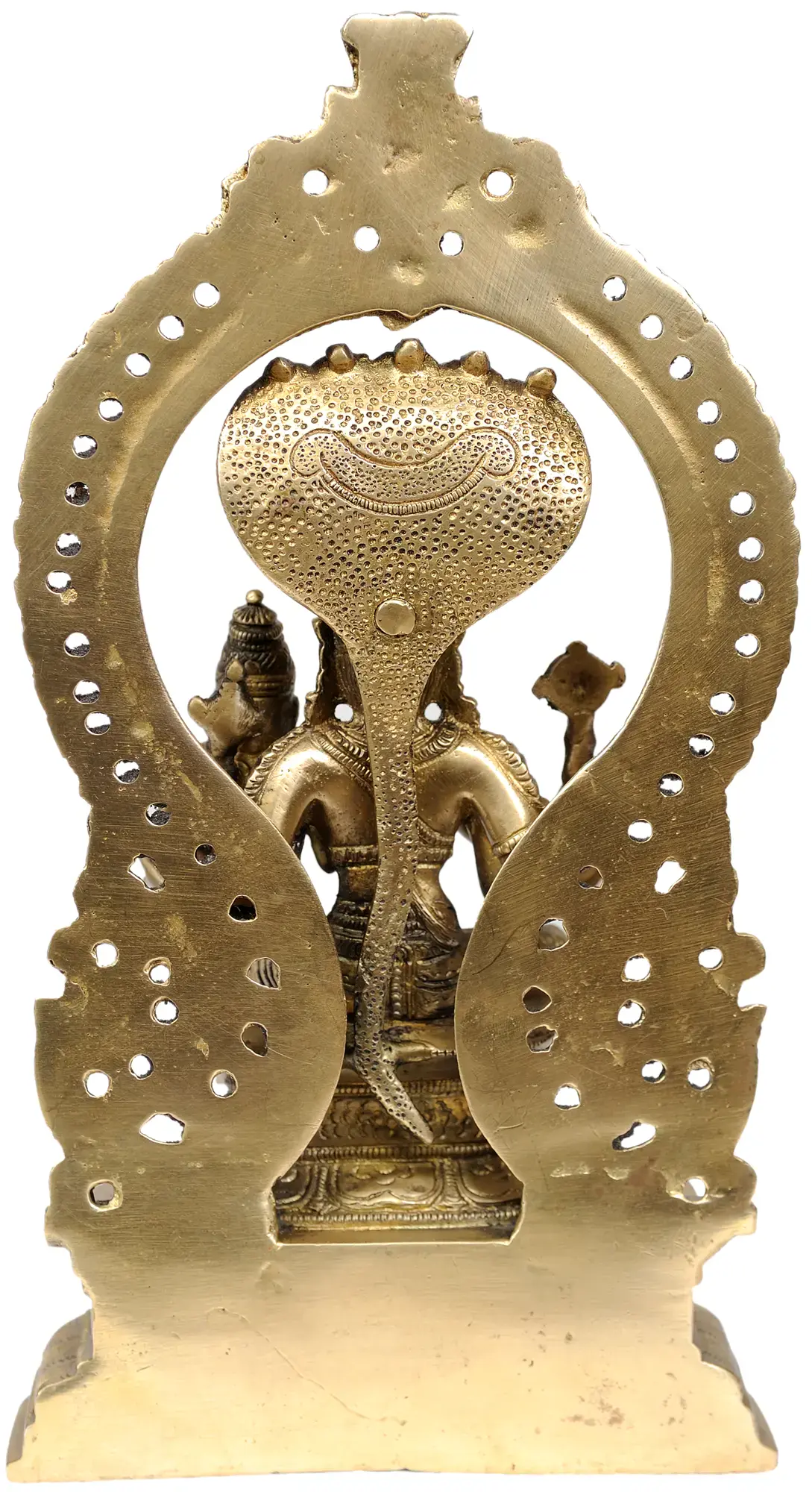 The presence of the multi-headed serpent, Shesha Naga, forming an elaborate arch over the divine couple, is deeply symbolic. Shesha Naga is the king of all serpents and is often depicted as the couch upon which Lord Vishnu rests during periods of cosmic dissolution, signifying eternity and infinite consciousness. The cobra's hoods protect and shelter the divine deities, representing a shield against all negativity and obstacles. This imagery evokes the primordial state of creation and the eternal cyclical nature of existence, as preached in the Vedas. The radiant brass material itself is considered sacred and auspicious in many Indian traditions, believed to purify the environment and attract positive energies.