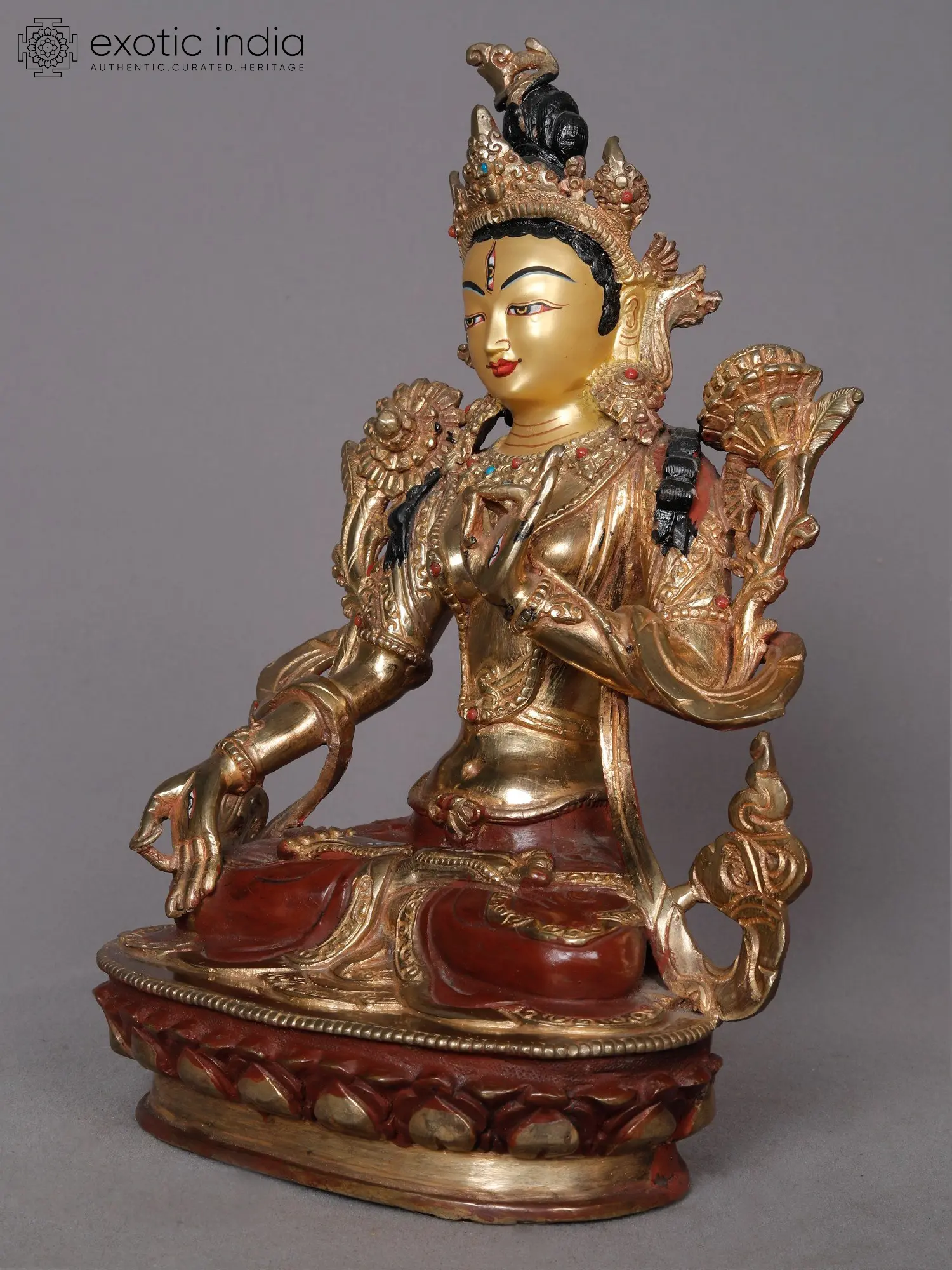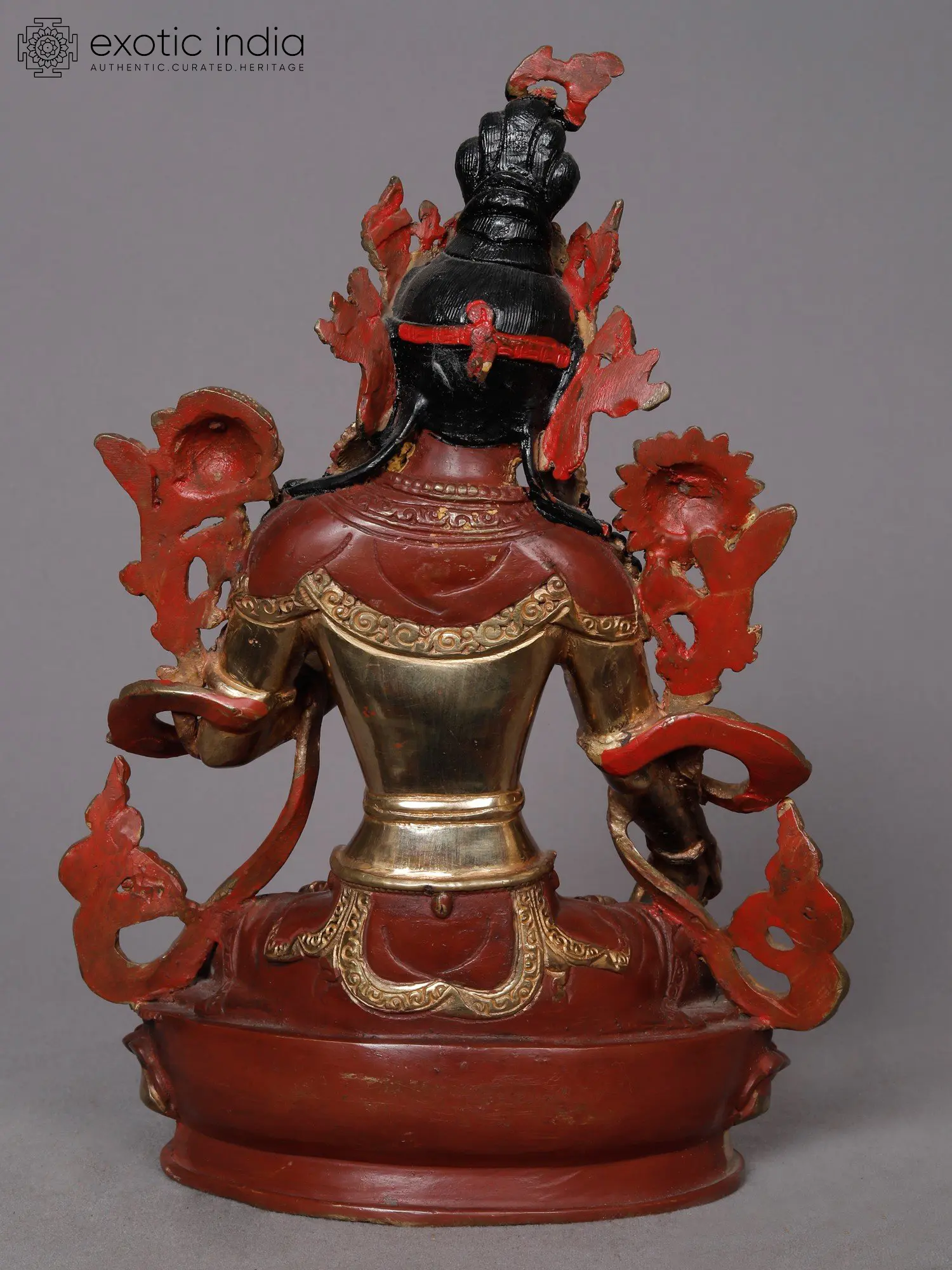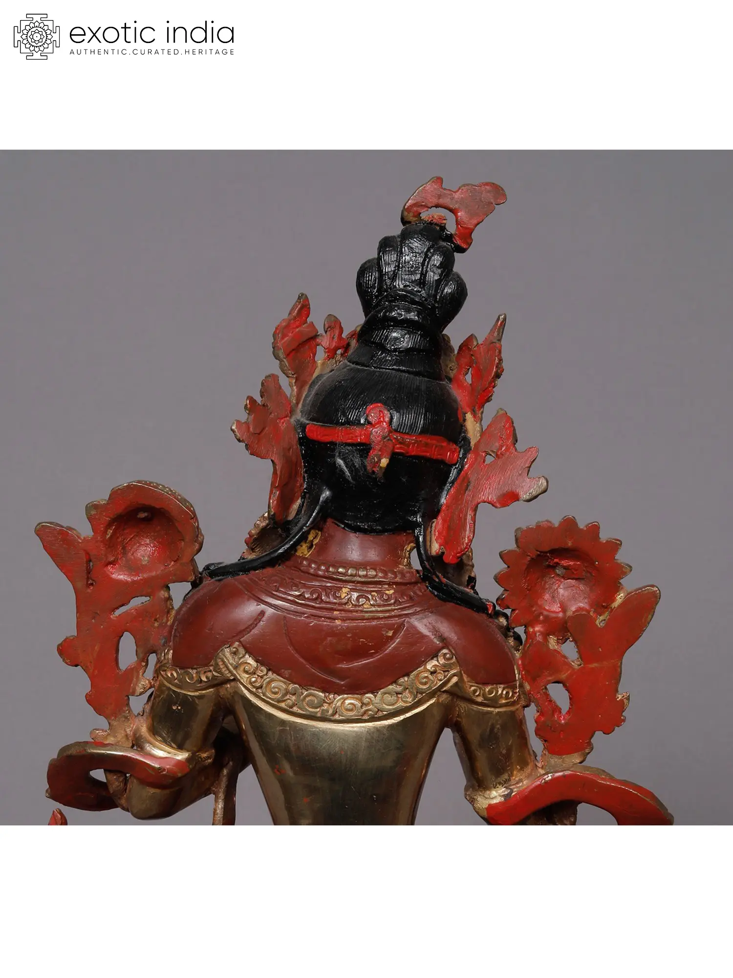 She, who vanquishes the negative karma and ends the Klesha; White Tara is the Buddhist goddess of driving away delusion from our lives. Seated on a lotus dais, two flowers shoot on both her sides. As her wavy tresses fall over her shoulders, one hand presents the mudra of protection and the other hand rests in the mudra of Varadans. In fine copper, this sculpture is made with the Newari technique, brought to you from the rich heritage of the Himalayas.