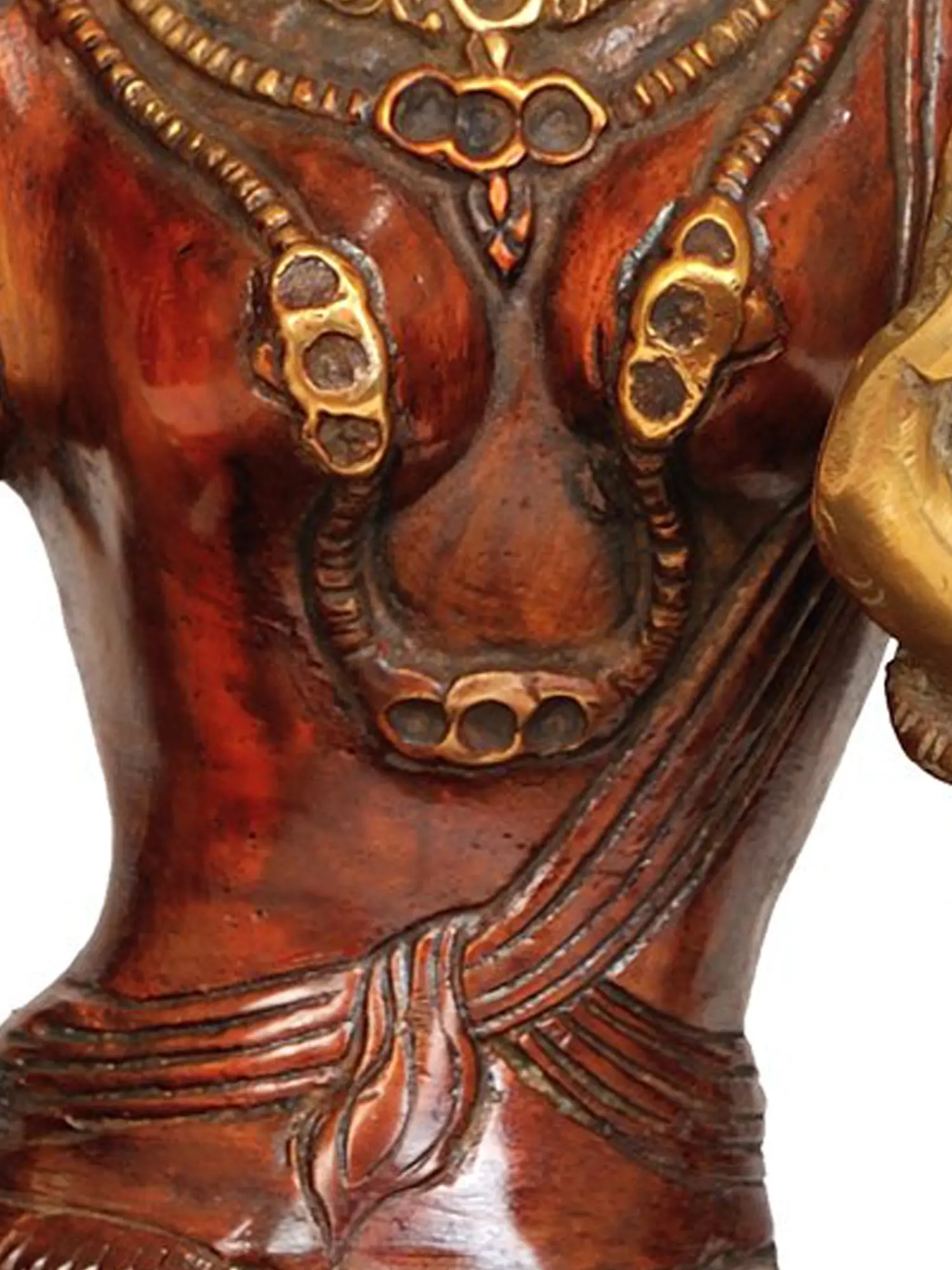 Tara is an important and revered deity in Tibetan Buddhism who appears as a female Bodhisattva. Buddhist monks and followers meditate on the image or deity of Tara to develop some good qualities such as compassion and kindness. Tara is known as the mother of compassion or liberation and is considered the female aspect of Avalokiteshvara (who possesses the compassion of all Buddhas). She manifests in different forms such as Green Tara and White Tara. Green Tara is associated with fearlessness and White Tara, as radiant as the moon, is associated with good health. Tara also appears in red, blue, and yellow colors.