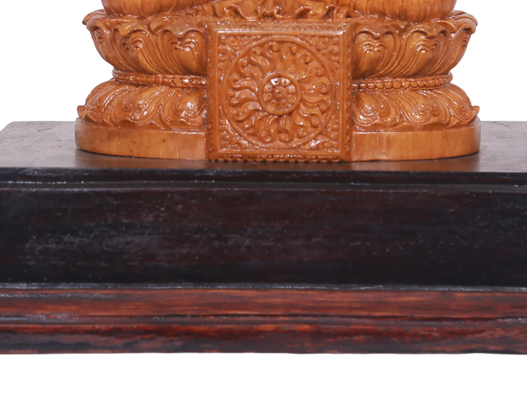 Invite a sense of profound peace and spiritual awareness into your home with this exquisite depiction of Lord Gautam Buddha. Crafted from fine teak wood, this statue captures the serene essence of the enlightened one as he shares his wisdom. The smooth, warm tones of the wood lend a natural beauty and timeless appeal to this sacred representation. The posture of the Buddha is significant. Seated in the traditional lotus position, he signifies a state of deep meditation and inner stillness. His right hand is raised, palm outward, in the gesture known as *abhaya mudra*, symbolizing protection, fearlessness, and reassurance. This gesture is a powerful reminder of the Buddha's compassionate presence, offering solace and dispelling anxieties. His left hand rests in his lap, palm upward, in the *dhyana mudra*, the gesture of meditation and concentration, further emphasizing his profound spiritual focus. The intricate detailing of the robe, with its graceful folds, speaks to the meticulous craftsmanship involved in creating this piece. The serene expression on the Buddha's face, with half-closed eyes, conveys a deep sense of contemplation and detachment from worldly concerns. Above his head, a beautifully carved halo or *ushnisha* represents his spiritual realization and the crown of wisdom. The base itself, adorned with intricate patterns, echoes the spiritual motifs found in Buddhist art and architecture, often drawing inspiration from the lotus flower, a symbol of purity, rebirth, and spiritual awakening. This statue is more than just a decorative object; it is a focal point for mindfulness and contemplation. In Buddhist tradition, the Buddha's teachings, the Dharma, are the path to liberation from suffering. To gaze upon an image of the Buddha in the act of teaching or offering solace can serve as a constant inspiration to cultivate wisdom, compassion, and inner peace in one's own life. The teak wood, known for its durability and rich grain, ensures that this sacred representation will be a cherished item for generations, a tangible connection to ancient wisdom and enduring spiritual principles.
