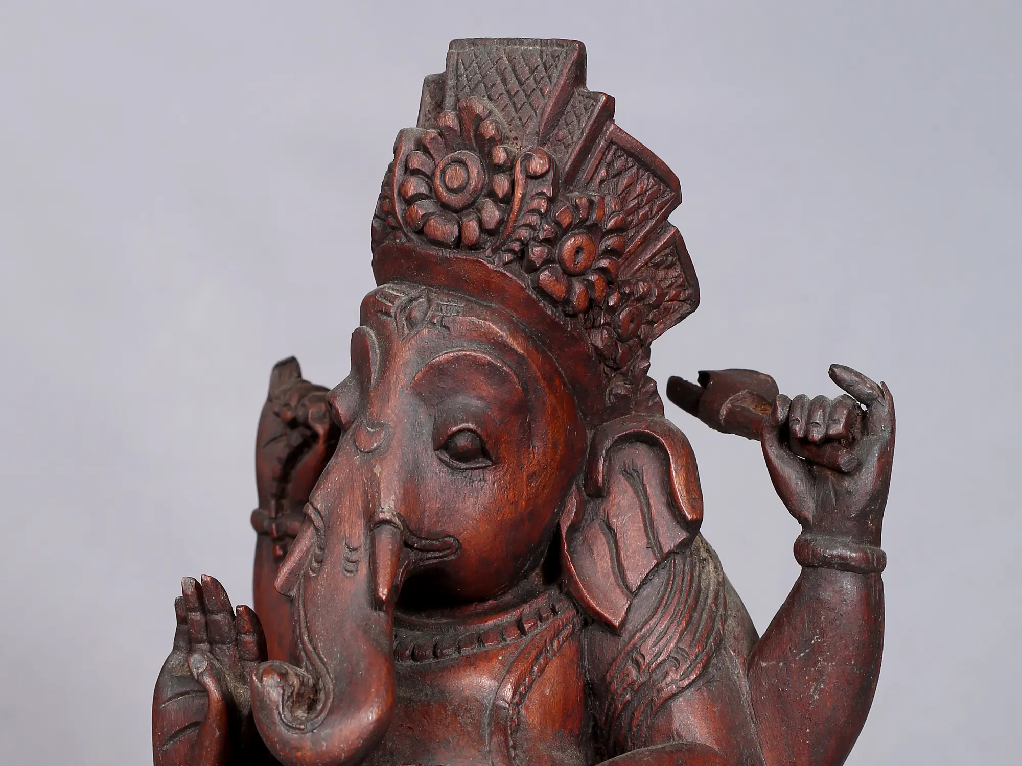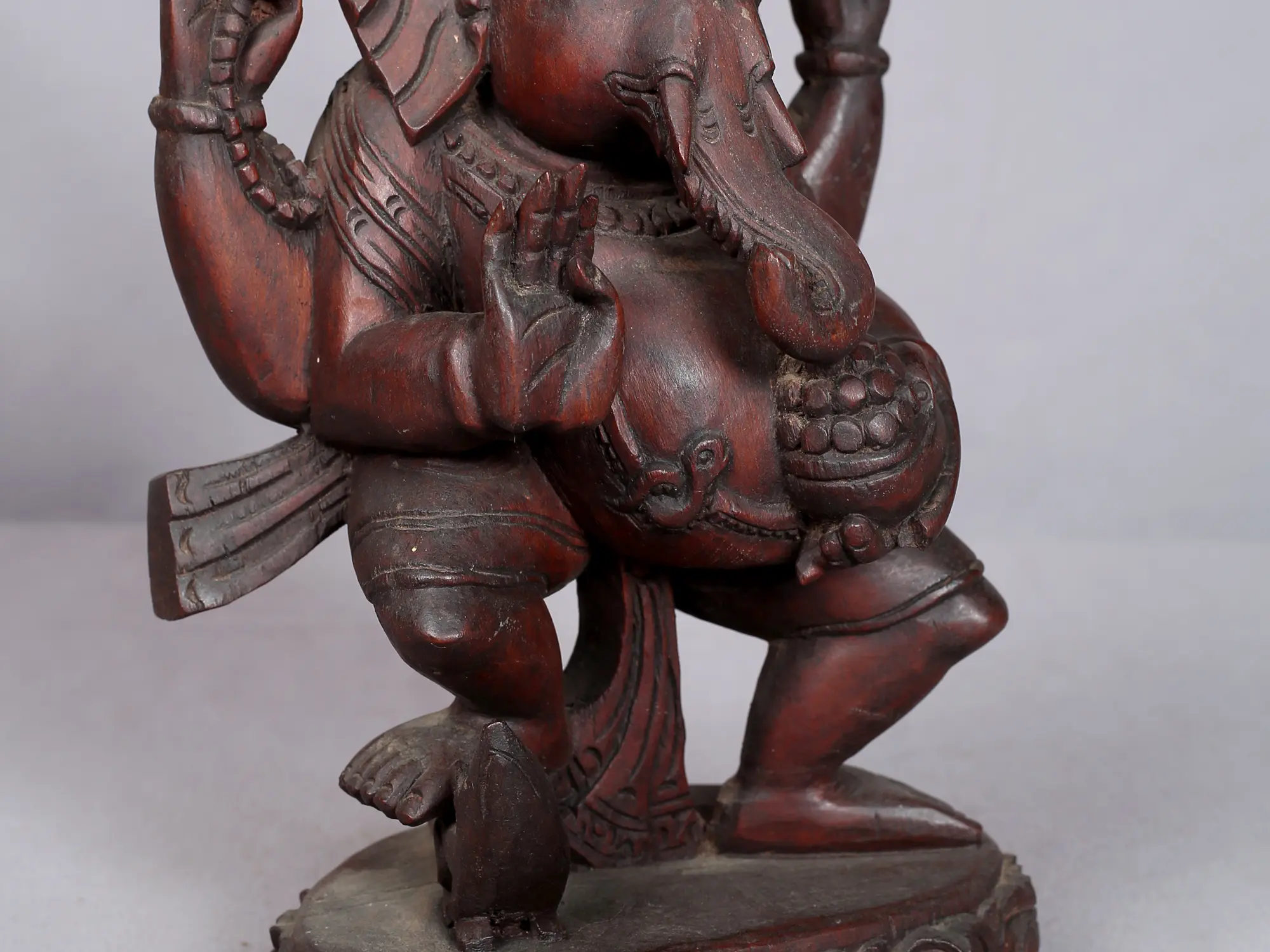 In the heart of Nepal, a wooden masterpiece stands, an ode to divine rhythm, the “Dancing Lord Ganesha”, also known as “Nritya Ganpati”. This enchanting statue, sculpted with reverence and skill, captures the essence of the celestial dance. With Tribhanga posture, Ganesha gracefully sways, embodying the harmonious fusion of spirituality and artistry. His every movement evokes a symphony of devotion and grace, as if the universe itself is entranced by his dance. Adorned in a regal crown, his benevolent right hand extends blessings, while his left cradles a bowl of delectable cakes, symbolising earthly pleasures. This Nepali creation is an invitation to witness the divine rhythm, a tribute to the Lord of beginnings and the eternal dance of life.
