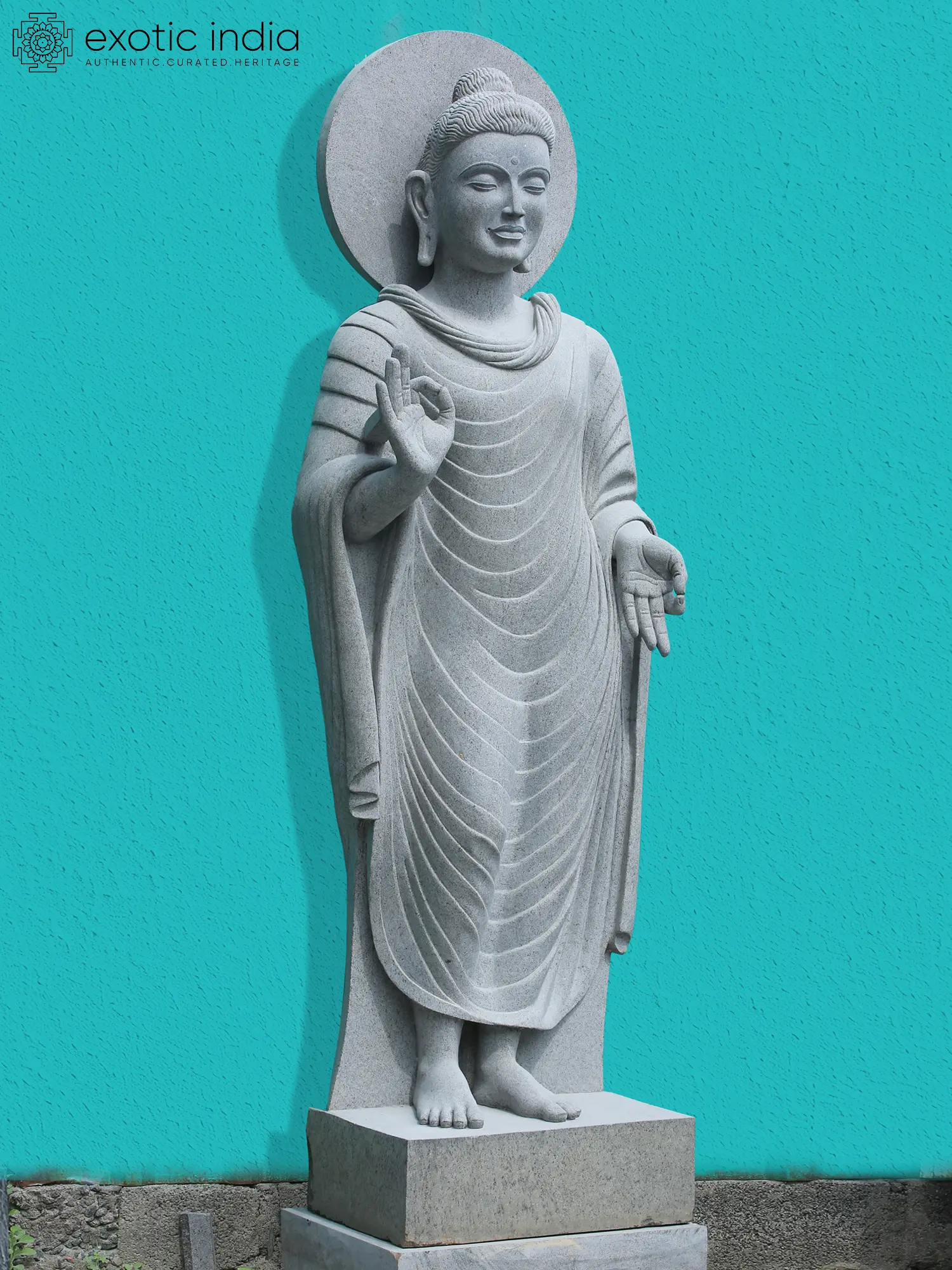 A representation of the iconic standing Gandhara Buddha, this 8-foot granite sculpture is a magnificent ode to the Enlightened One.