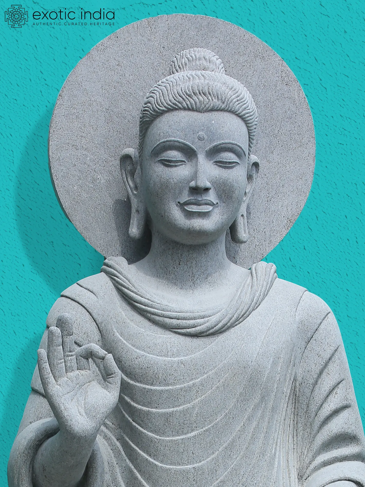 With a master’s calm on his face, Buddha raises his right hand in Vitarka- imparting knowledge while his left dangles in Varada, the gesture of giving.