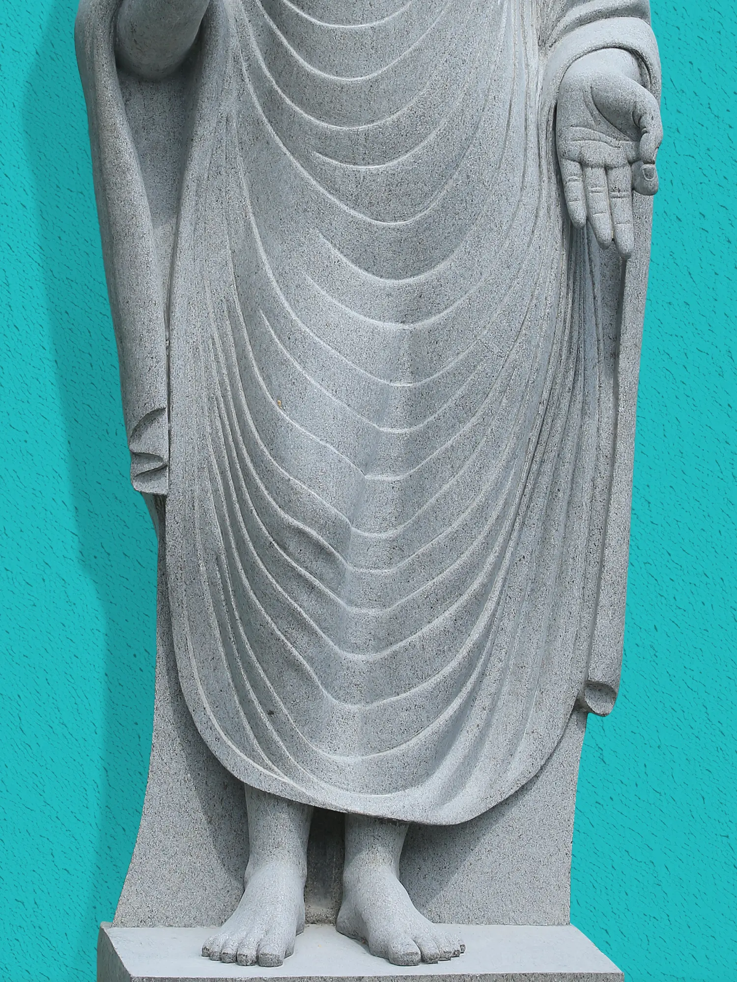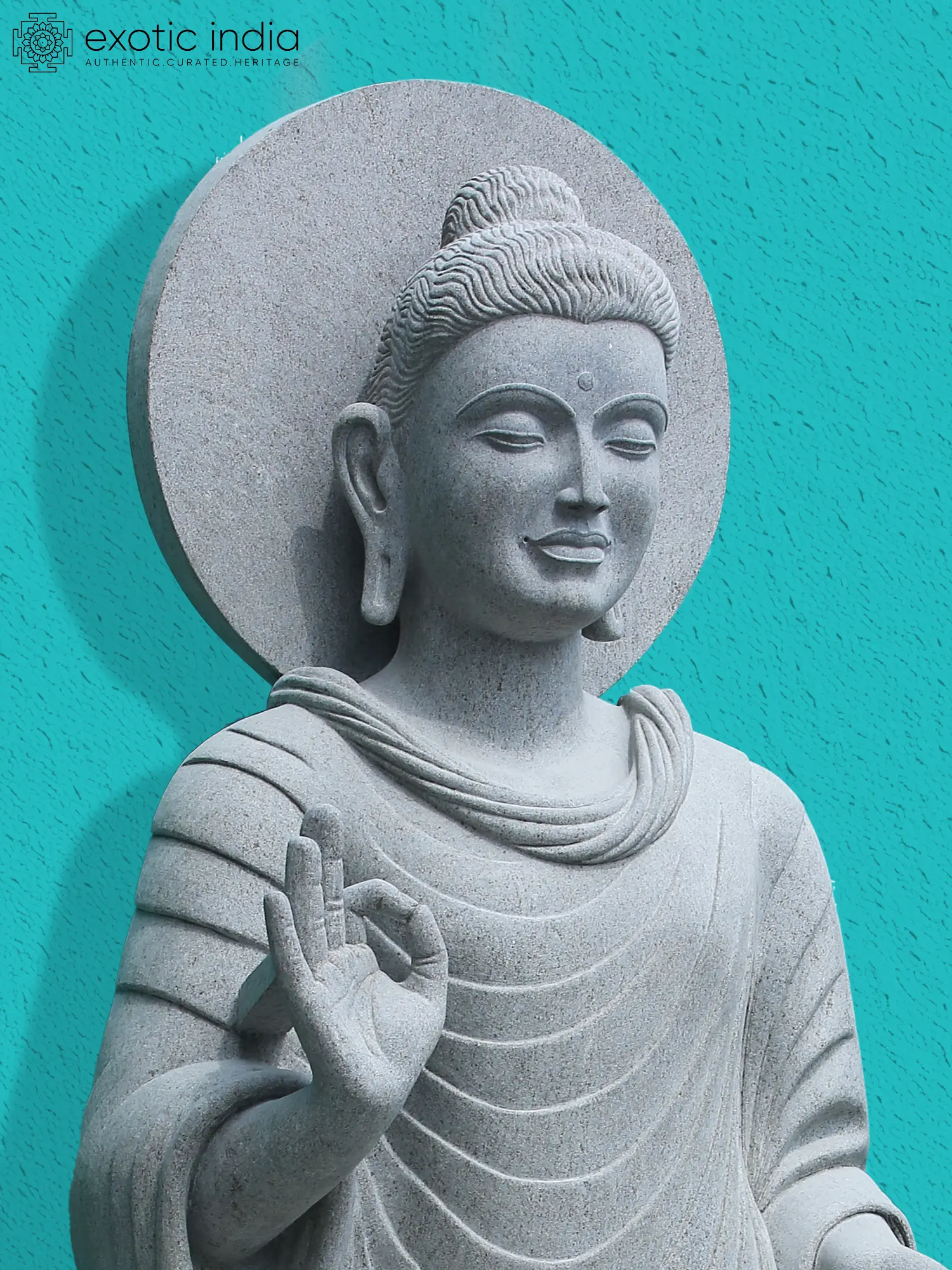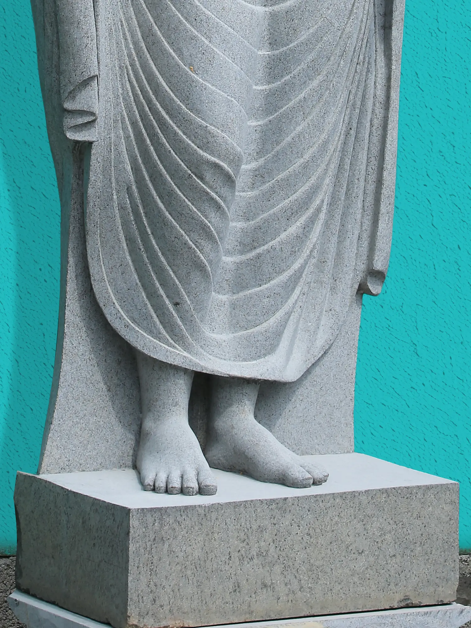 Granite forgets its hardness as the gentle presence of Buddha is infused in it by the artist, with the slight bent of his knee in a poised contrapposto, shifting weight on his left foot, suggesting graceful motion.