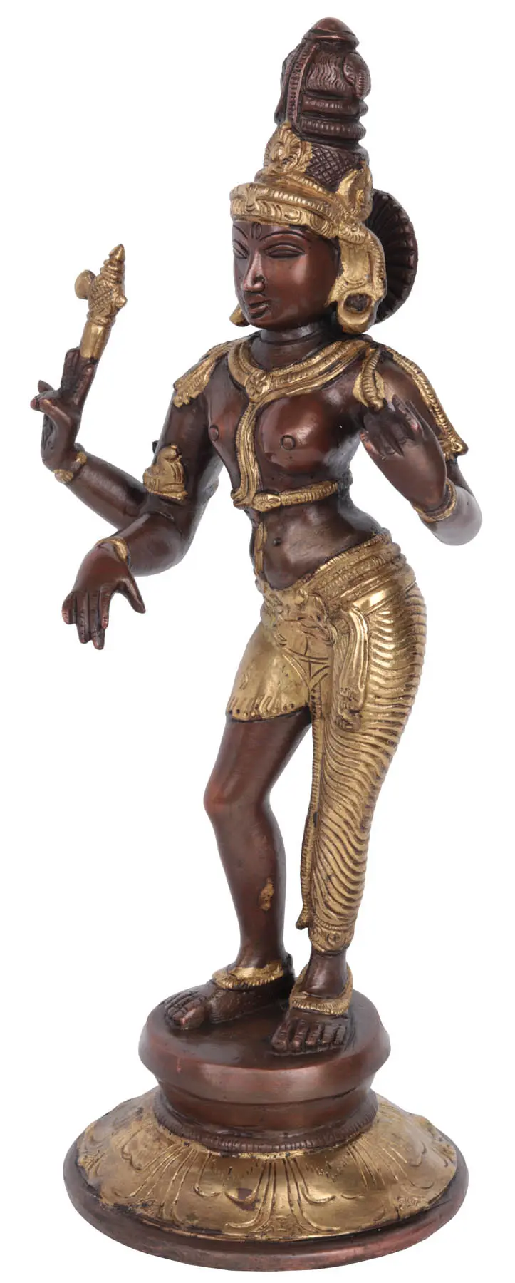 This Ardhanarishwar brass statue with a dark brown and gold lacquer finish is an homage to the united energies of Prakriti and Purush. The hues of gold and dark brown evoke the regal appeal of the world's most powerful marriage. The gold tint is also a nod to Goddess Parvati, who is commonly referred to as Kanchan Varna or as having gold skin. This gold and dark brown colored brass statue is a symbolic portrayal of Ardhanarishvara (Shiva-Shakti) and depicts the celestial union of Lord Shiva and Goddess Parvati (Shakti). This religious sculpture represents the indivisible union of the divine powers by symbolizing the harmonious combination of male and feminine energy, marking the balance of creation and destruction.