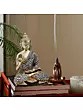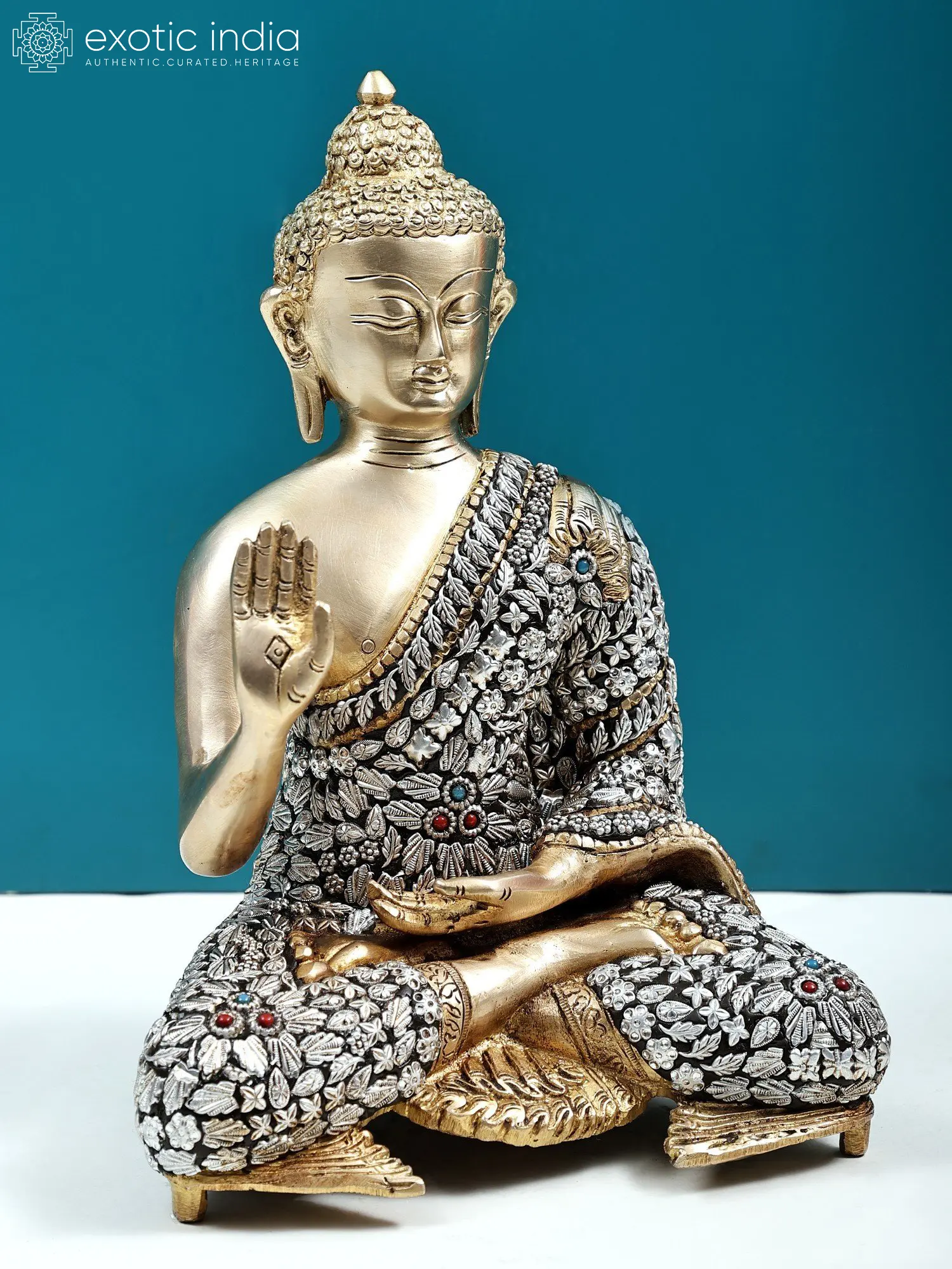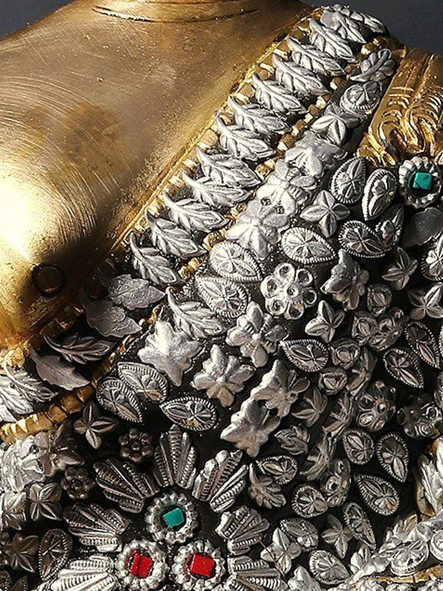 Aside from the spiritual elements of this sculpture, notice the visual qualities that the sculptor has highlighted with the use of rare silver inlay work. The blessing Buddha is made of brass and is studded with red coral and sapphire. He is clad in an amber gold robe that contrasts well with the silver paisley motifs. This blessing Buddha echoes the serene elegance, introspective expression, and taut but intricate contemporary inlay modelling.