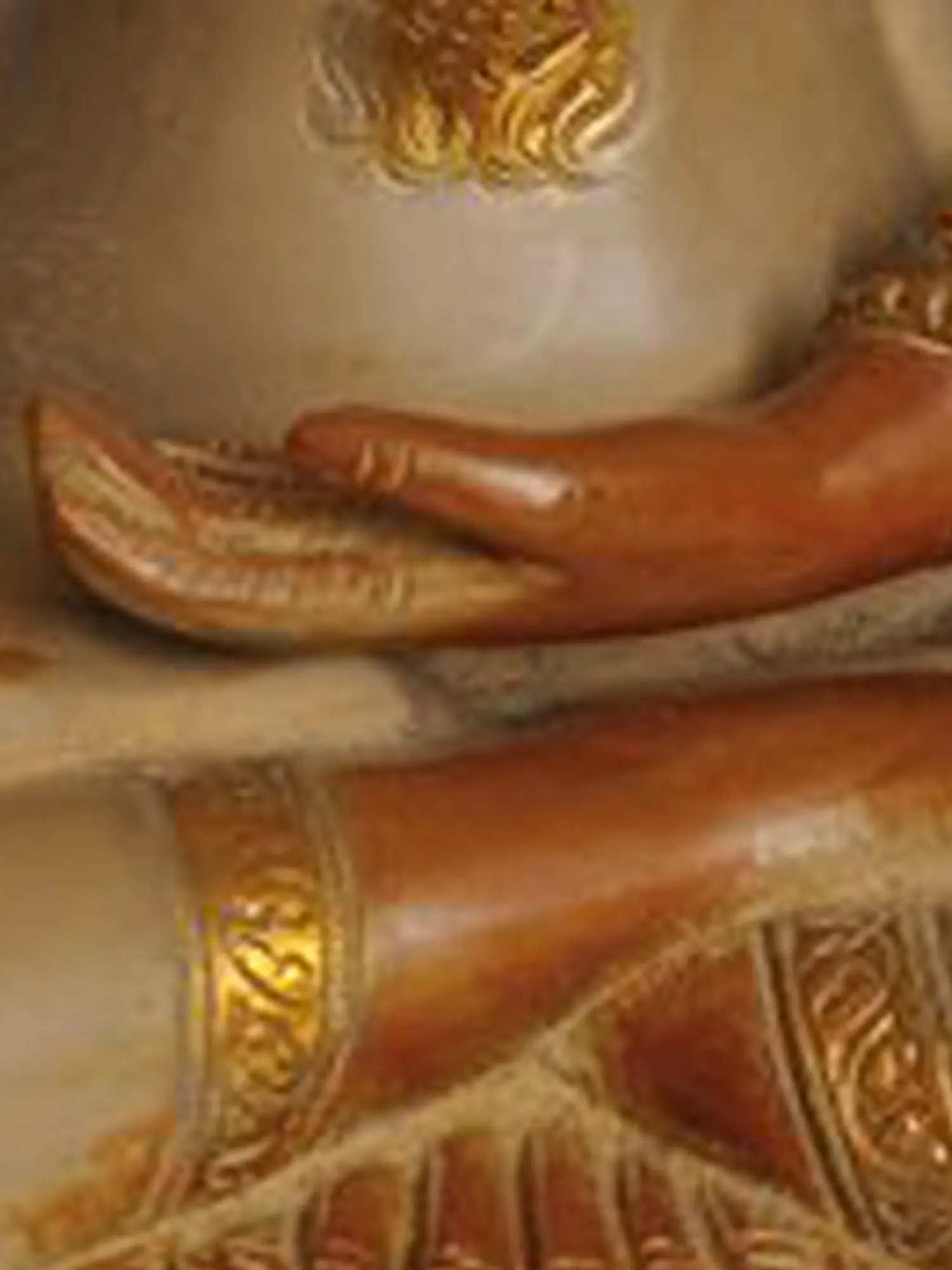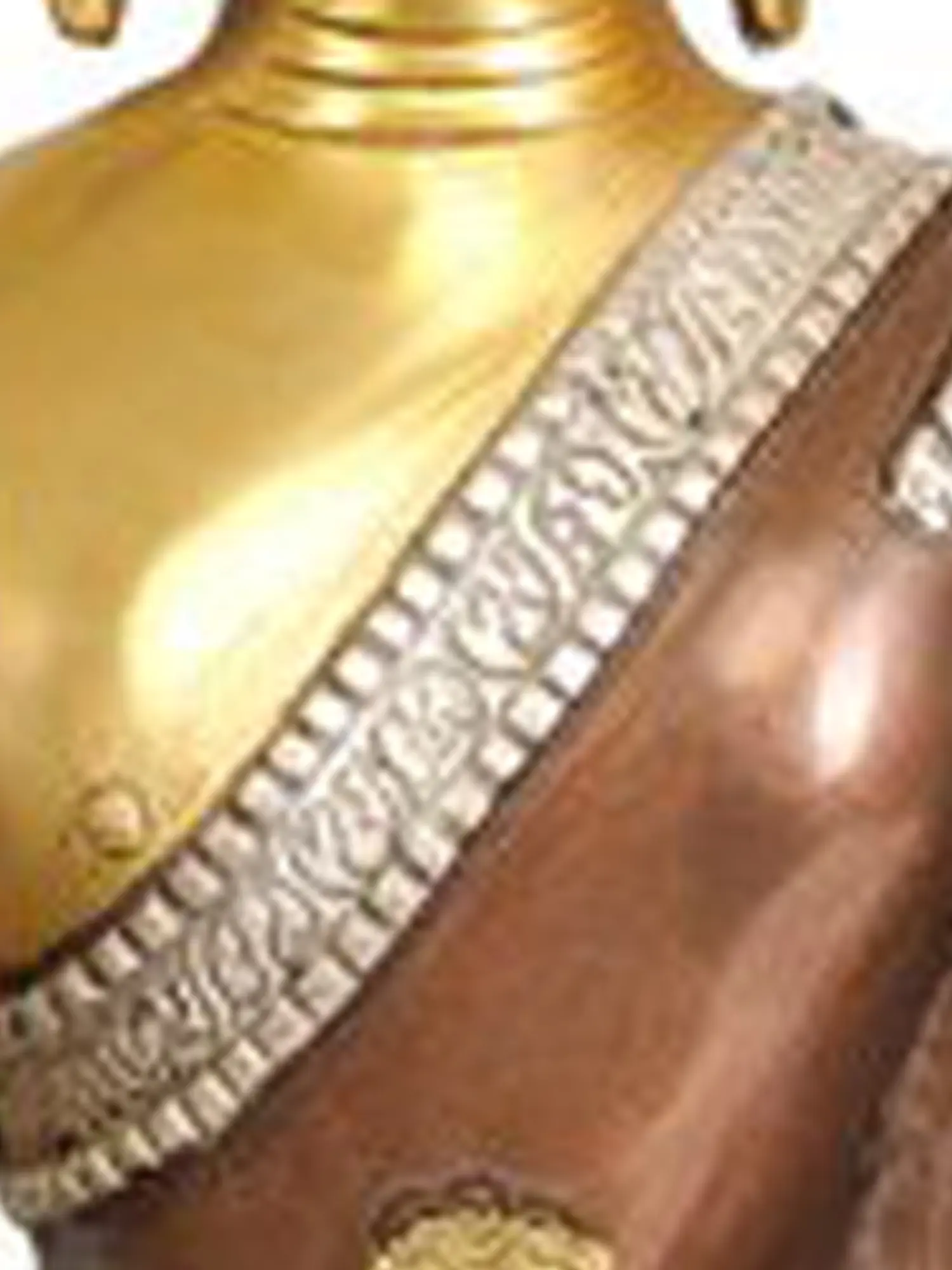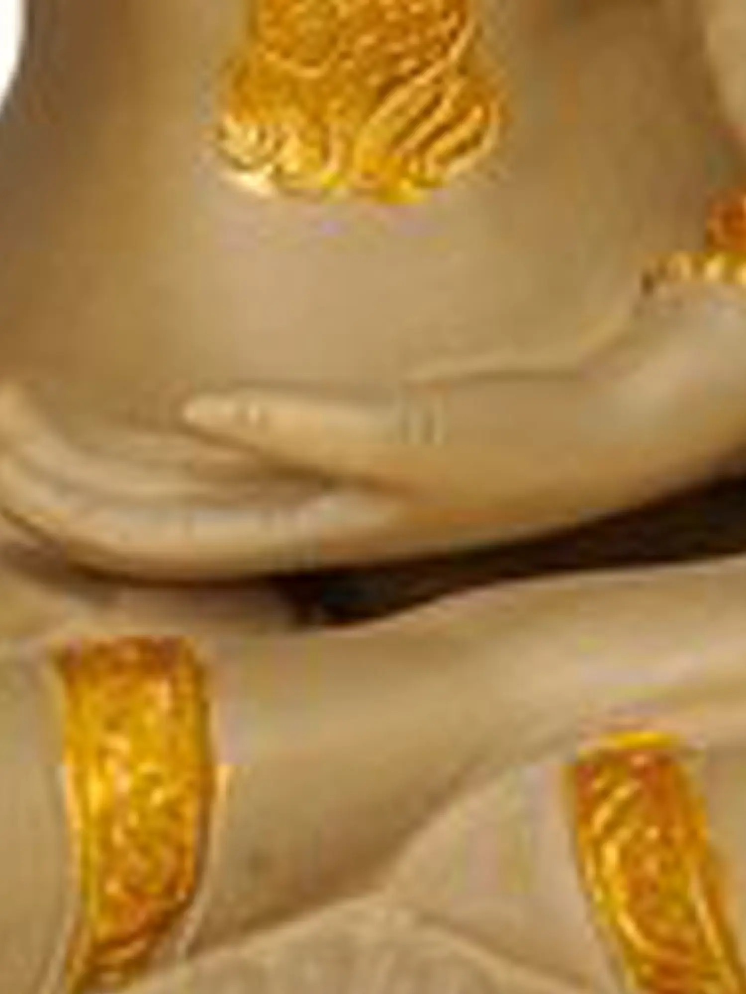 This exquisite brass sculpture captures the serene visage of the Buddha, seated in a posture of profound meditation and gentle blessing. Crafted by skilled artisans in India, this piece is more than just a decorative object; it is a tangible representation of peace, wisdom, and spiritual awakening. The rich, warm tones of the brass, combined with a subtly antiqued finish, lend the sculpture an aura of timeless elegance and spiritual depth. The Buddha's hands are positioned with intention. The left hand rests palm-up in his lap, signifying meditation and receiving wisdom. His right hand is raised, palm facing outward in the Abhaya Mudra, a gesture of fearlessness and protection. This mudra symbolizes the Buddha's assurance to his followers, dispelling fear and offering comfort. It is said that when the Buddha displayed this mudra, a fierce elephant, Mara's attacking beast, was pacified and bowed before him, illustrating its powerful spiritual resonance.