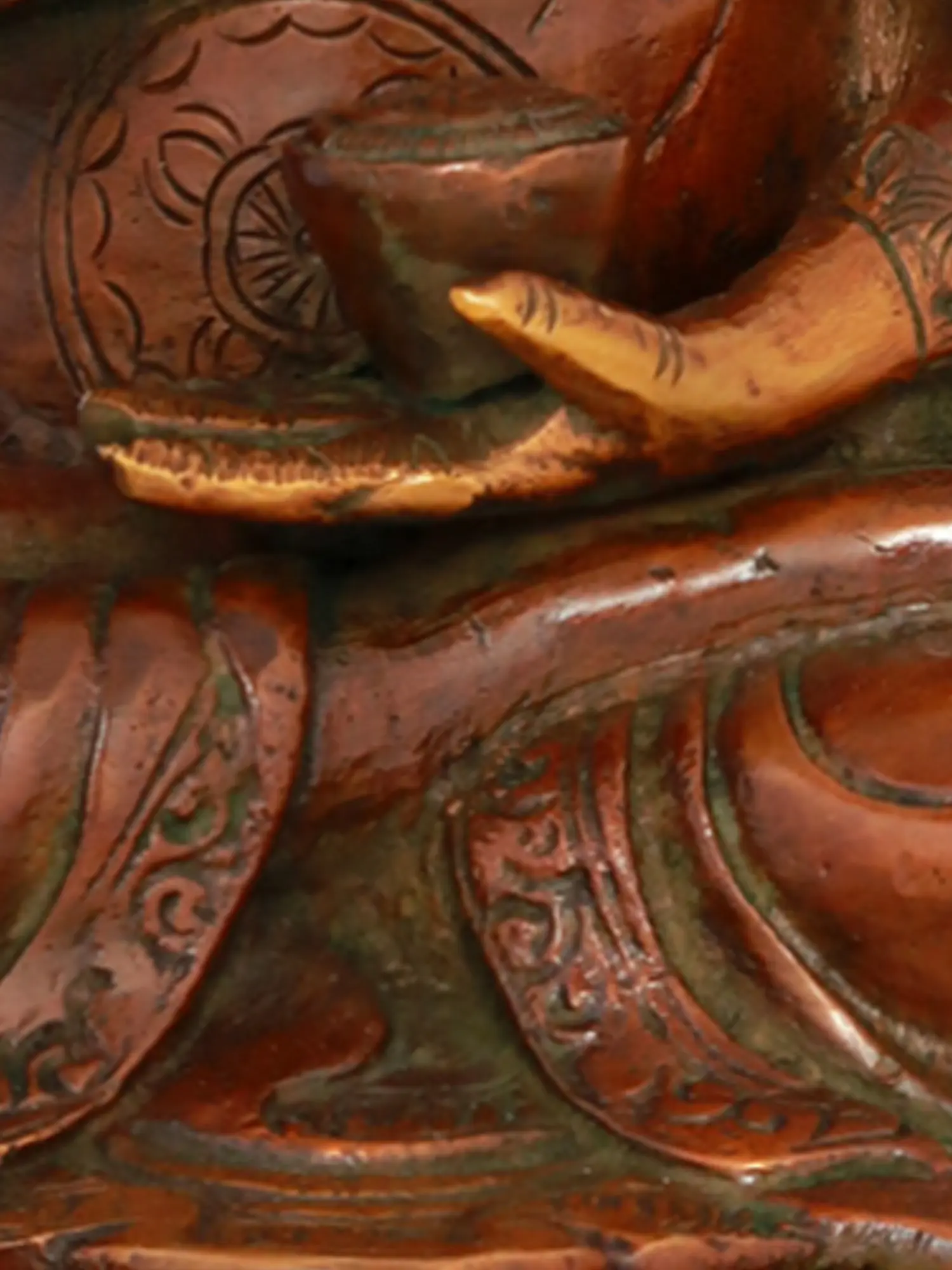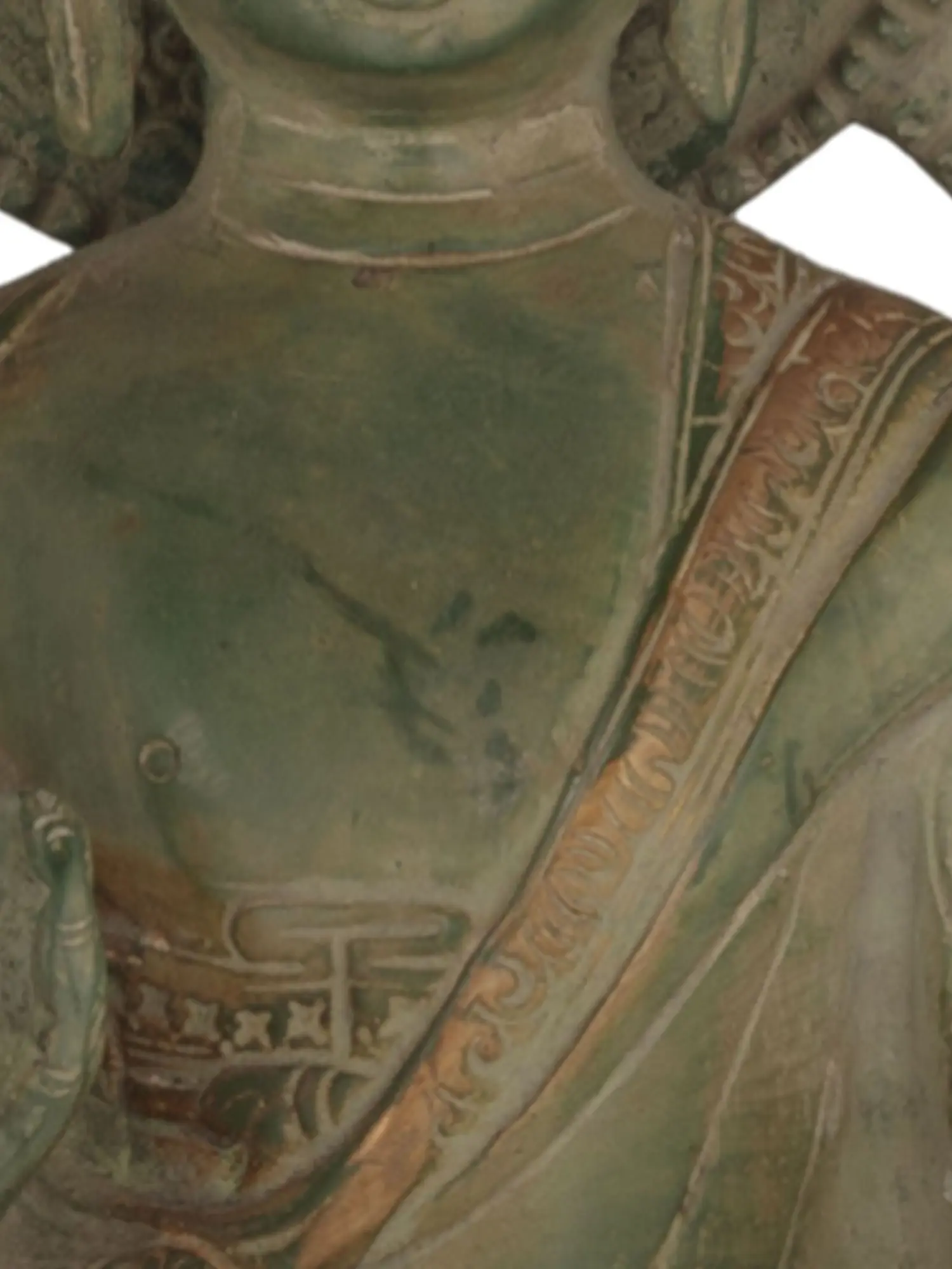 The intricate halo behind the Buddha, adorned with a pattern reminiscent of a radiant sunburst or the petals of a lotus, symbolizes enlightenment and the boundless nature of his teachings. The deep green patina applied to parts of the statue, particularly the halo and the robes, evokes a sense of age and sacredness, suggesting that this image has been blessed by time and devotion. This coloring also alludes to the natural world, a theme central to Buddhist philosophy, where harmony with nature is a path to inner peace. The detailed carvings on the throne and the base further enhance the regal and divine aura of the deity, suggesting his elevated status as the Awakened One. ––––––––––––––––––
