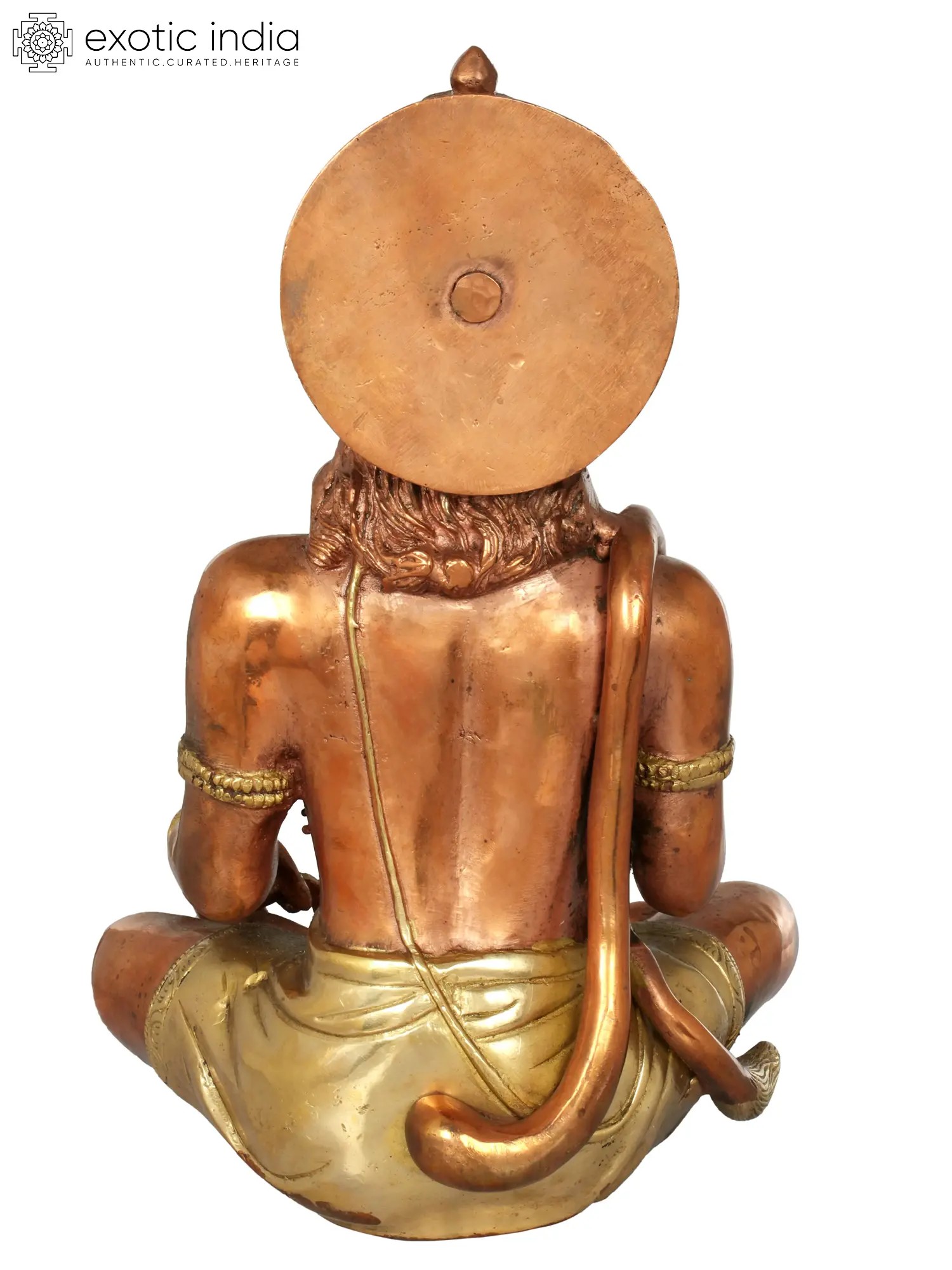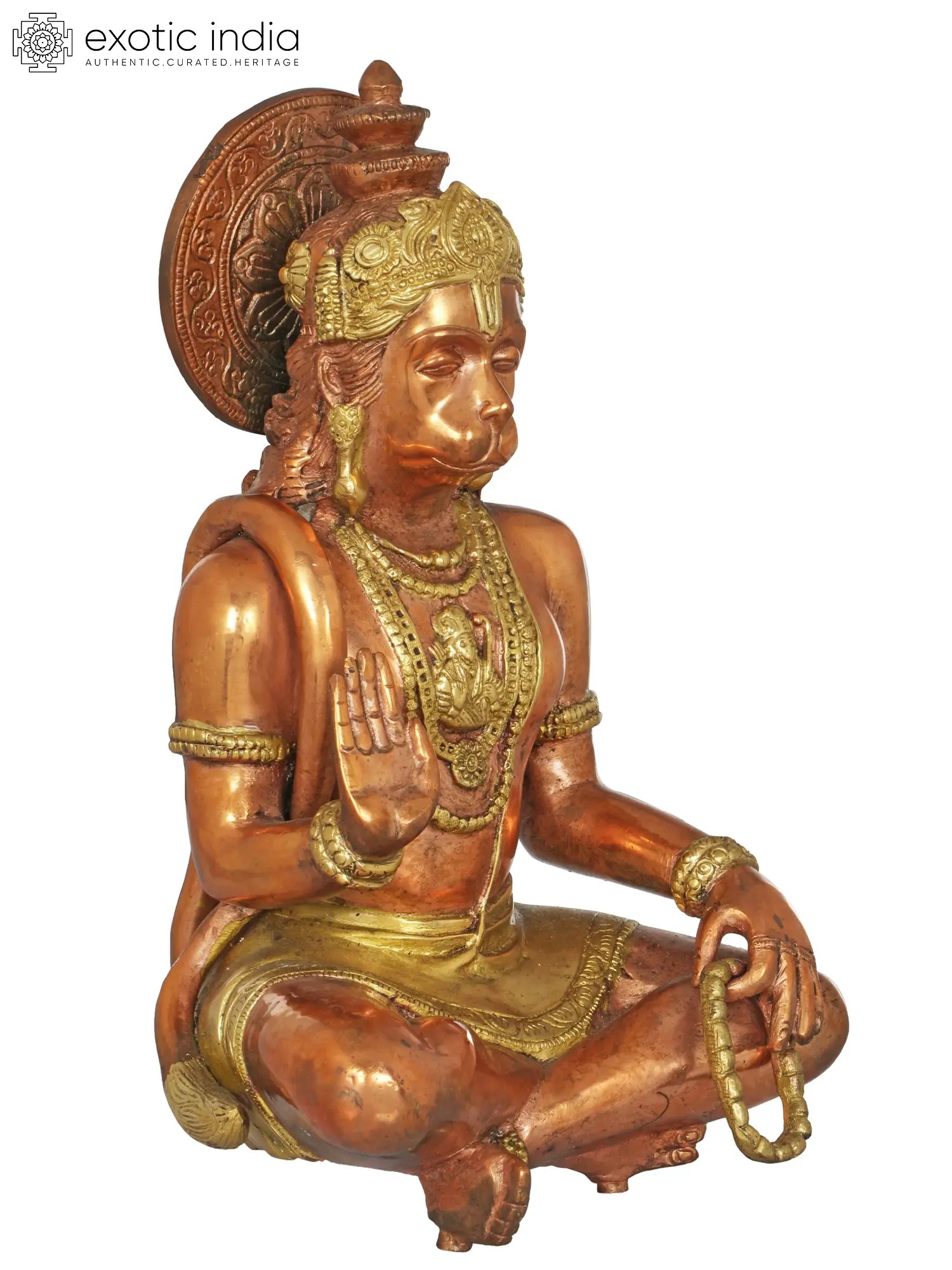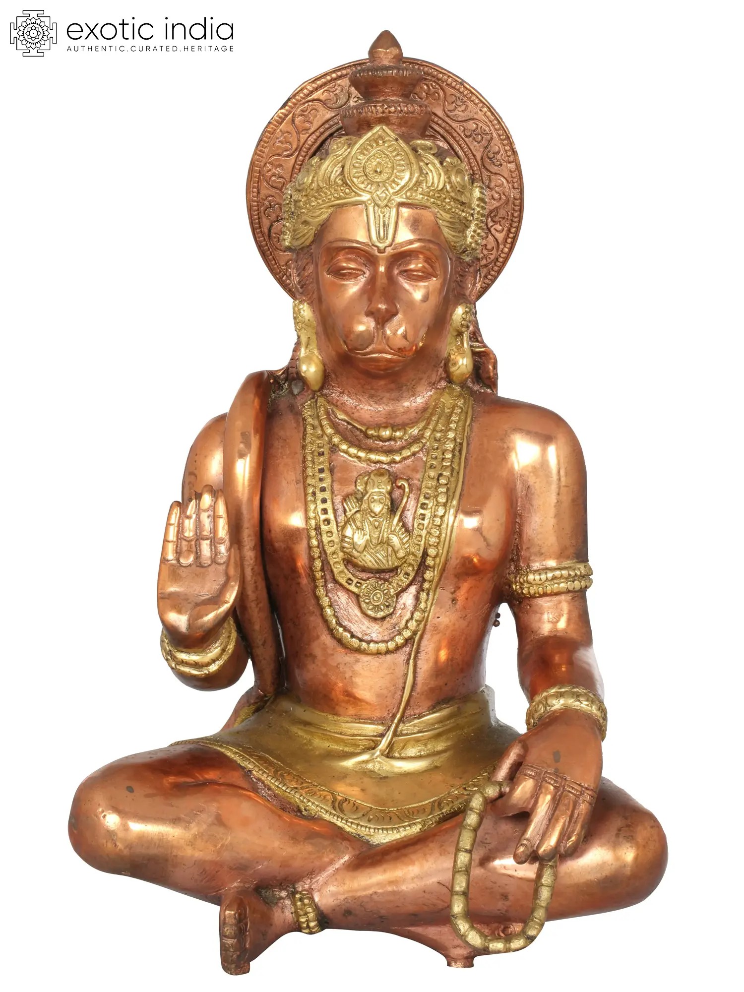 This statue has been crafted following the same lines, illustrating Lord Hanuman as the highest of all devotees. Lost in the quiet and continuous remembrance of his lord, Hanuman is sitting with his legs crossed and right hand raised in the blessing posture. His left hand is holding a Mala ( a garland of beads) used to assist the chanting. Wearing a small dhoti and minimal jewellery, his aura shows every sign of purity and chastity.