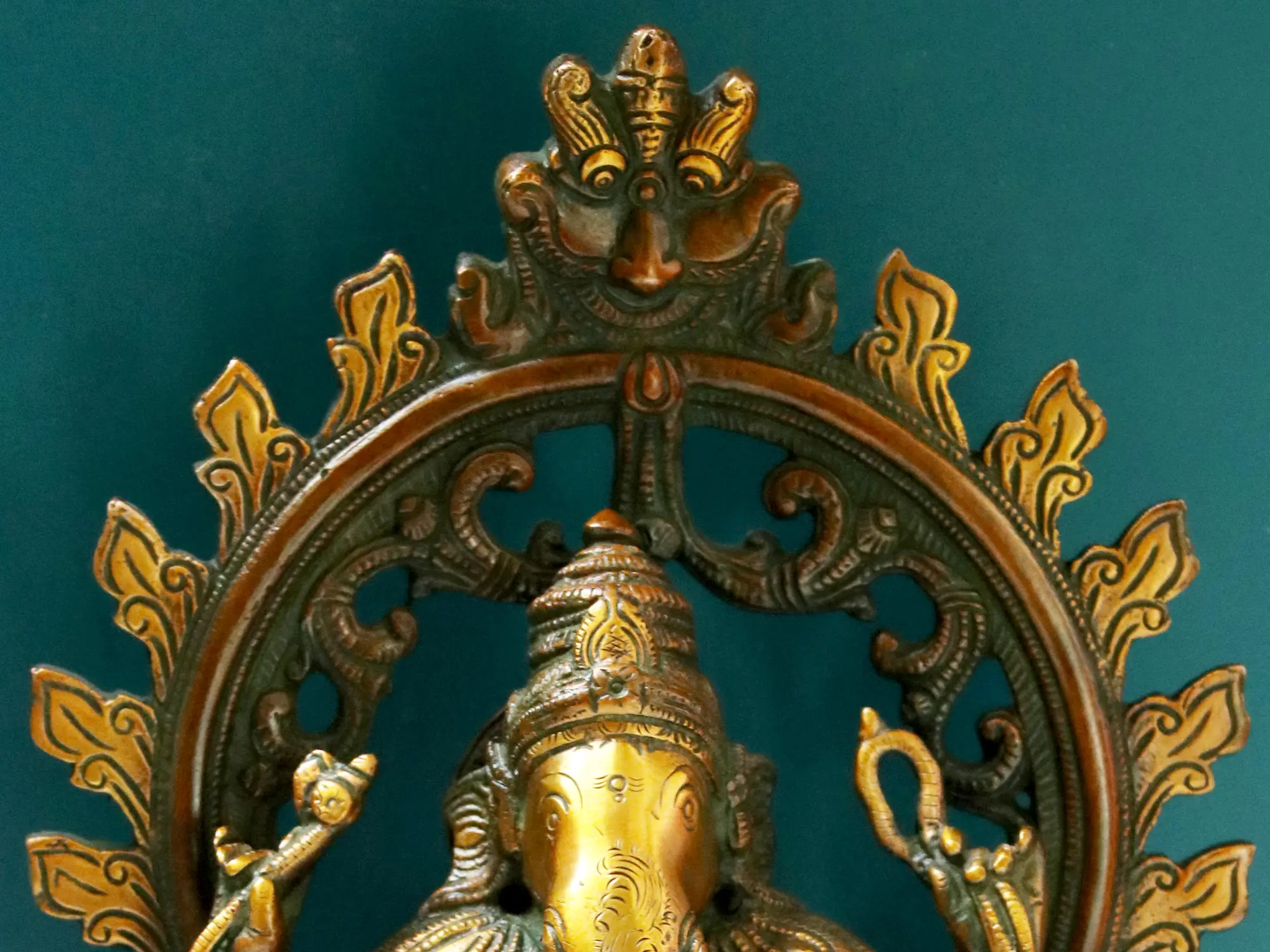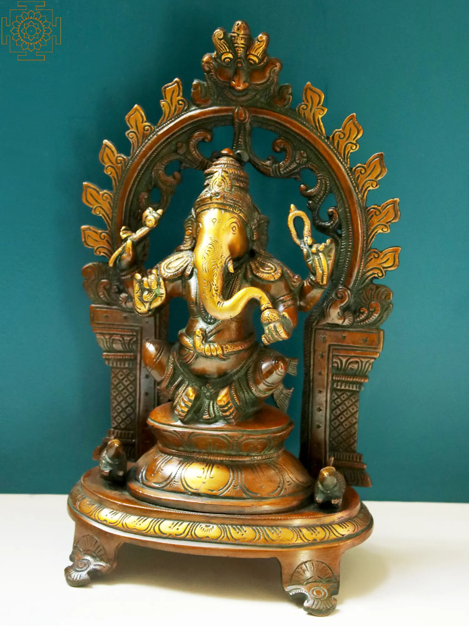 An ornate Prabhavali with Kirtimukha on top, sturdy pillars, and Makara (mythical animal) surround Ganesha- elements borrowed from the sanctum of Hindu temples.