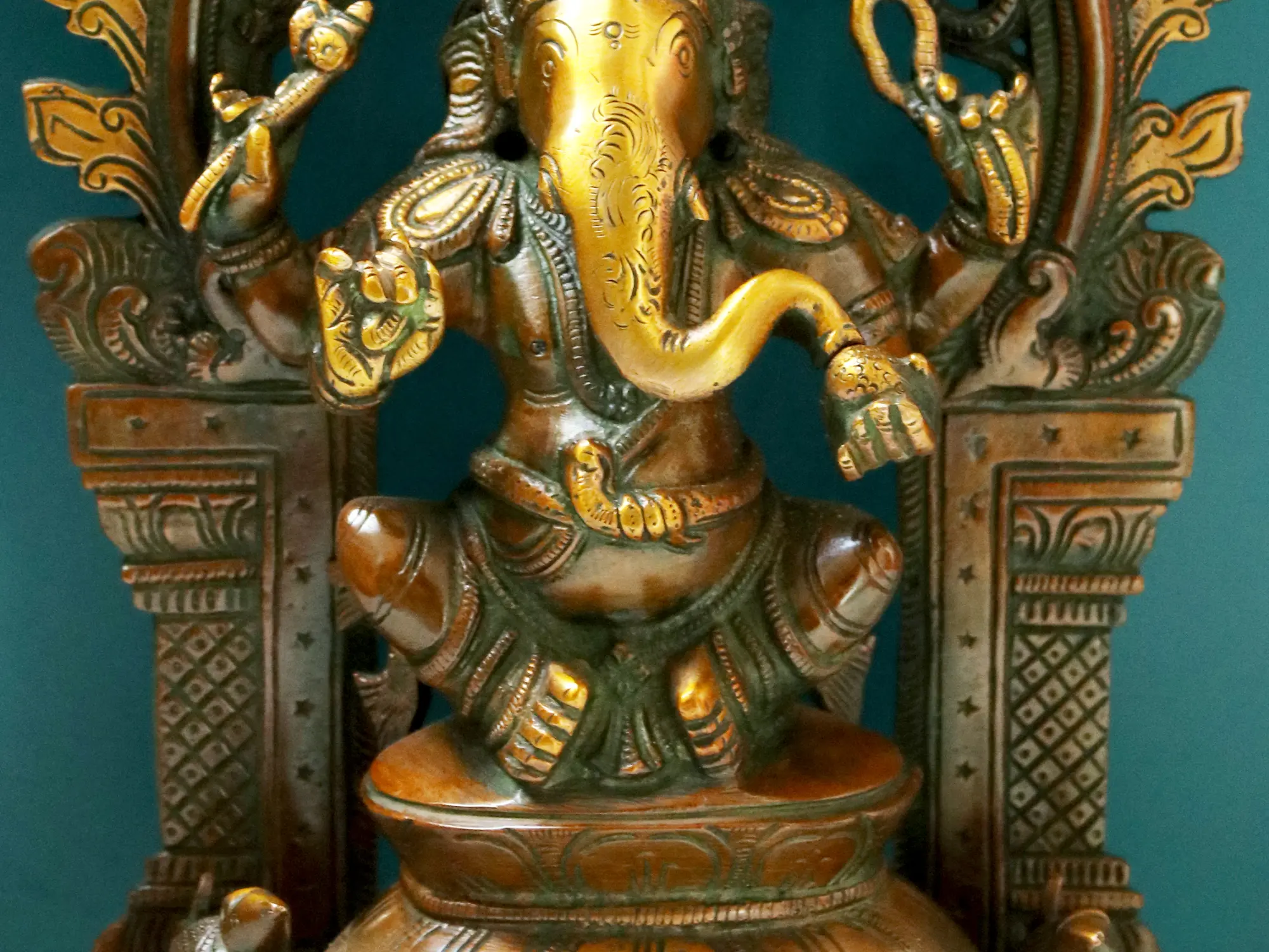 Ganesha’s elongated elephant head and graceful positioning of feet create a symmetrical and balanced pose.