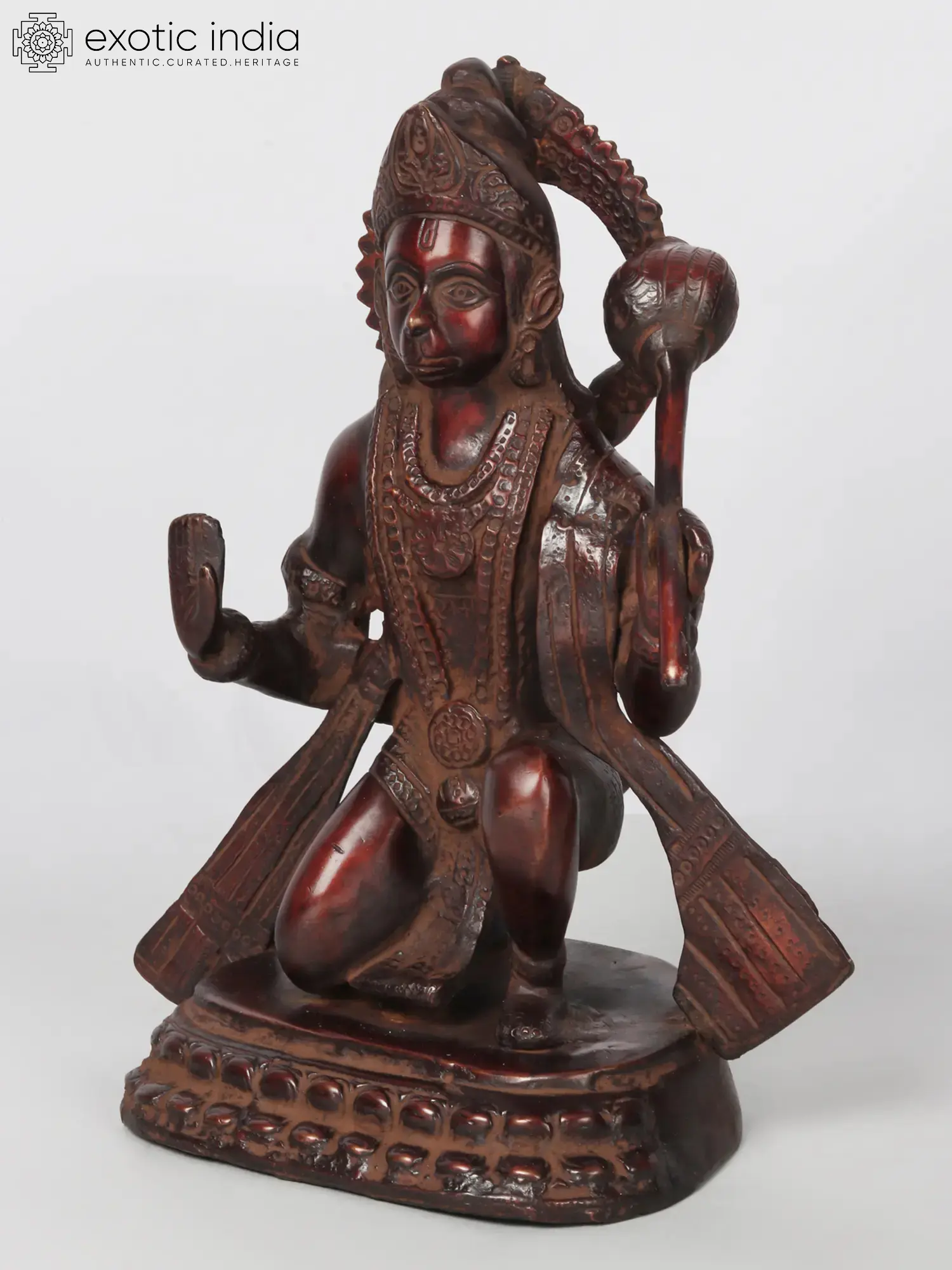 As One humbly bows before him, Lord Hanuman, the epitome of strength and devotion, bestows his blessings upon his devotees. The sculpture depicts him in a gesture of benediction (Ashirwad Mudra), symbolising his unconditional Love for his devotees. Lord Hanuman is decked up in “Uttariya” and “Dhoti”, signifying his divine nature and his role as the supreme devotee of “Lord Rama”. Hanumanji is carrying a mace (gada) in his left hand which represents his ability to vanquish negativity, protect devotees, and uphold Dharma. The gleaming metal (Brass) is skilfully designed to represent the adored deity. The portrayal is made warmer and richer by the brown tone of the brass, which also enhances Lord Hanuman's spiritual presence.
