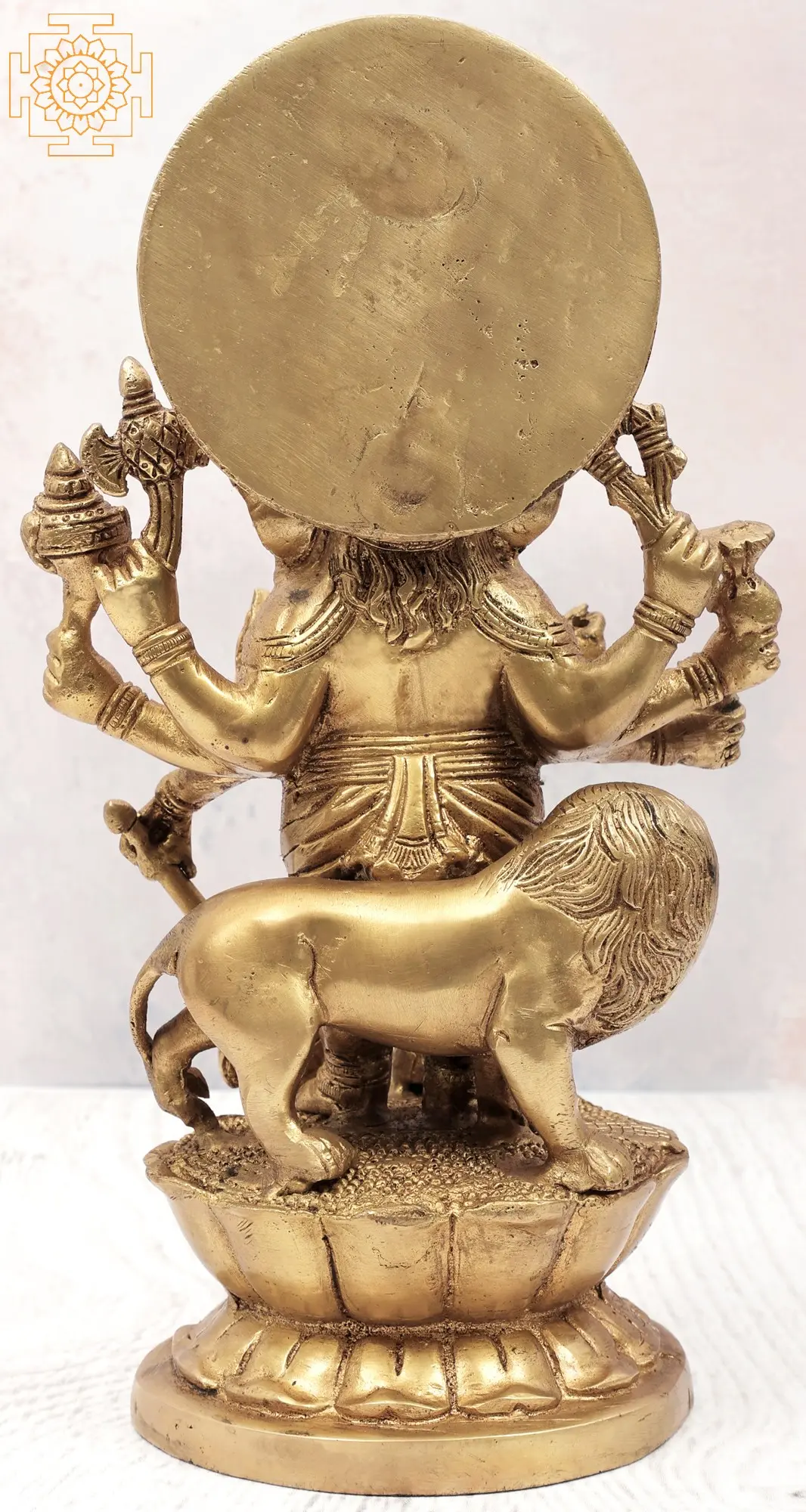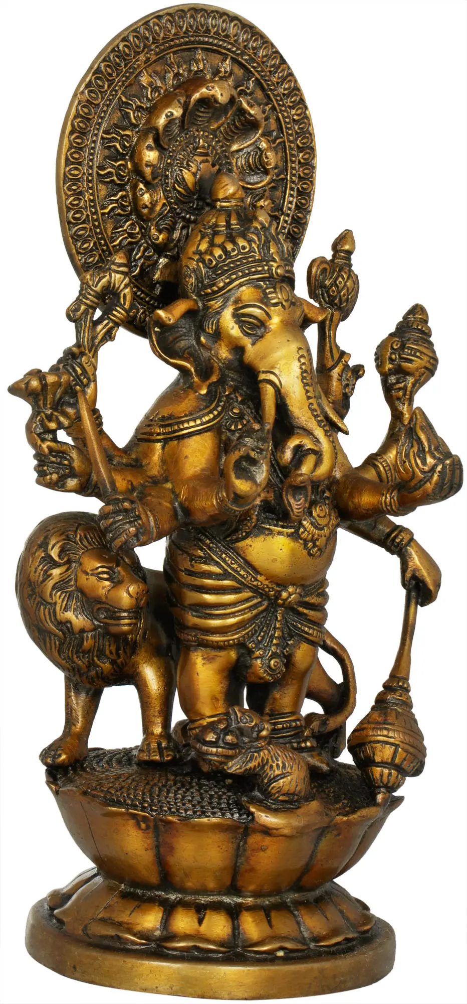This majestic brass sculpture, handcrafted with precision in India, portrays the eight-armed Ganesha, a deity widely revered for his ability to remove obstacles and bring good fortune. Each arm holds symbolic items such as a lotus, axe, conch, and more, embodying various powers and attributes. Ganesha's mount, the lion, represents strength and fearlessness, while the snake encircling him is a sign of protection and eternal energy. The aureole behind Ganesha, crafted with detailed patterns, abstractly represents the cosmic energy associated with the snake motif, which is often depicted in Hindu iconography as a protective and divine force surrounding the deities.