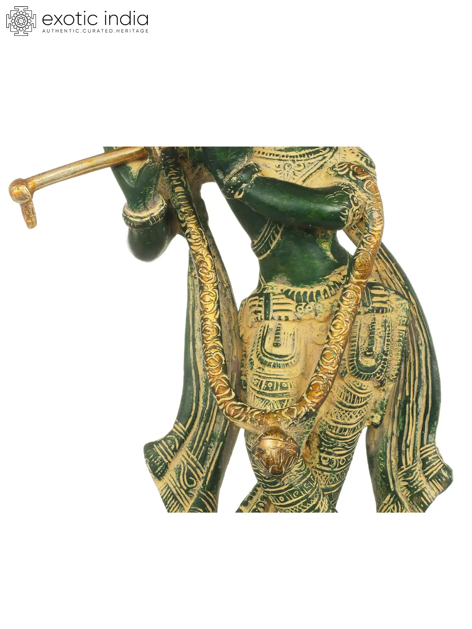 Let the enchanting tunes of Krishna's flute resonate in your home with this beautifully crafted brass statue. In Indian philosophy, Lord Krishna's divine music represents the call of the eternal soul, awakening our spiritual consciousness. This handmade piece is not only an exquisite work of art but also a profound reminder of our connection to the divine. Place it in your living space or meditation corner to invite tranquillity and spiritual harmony.